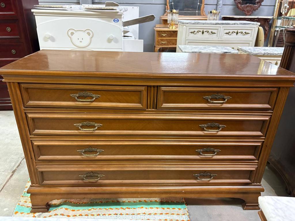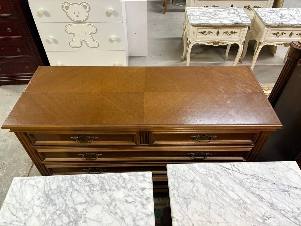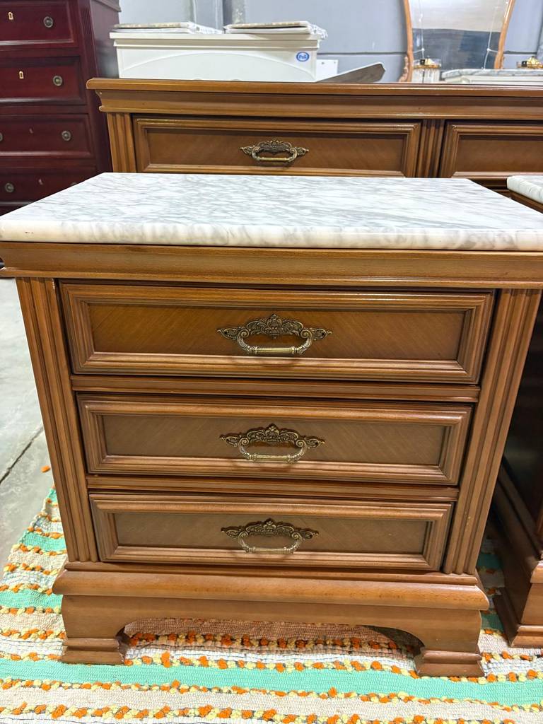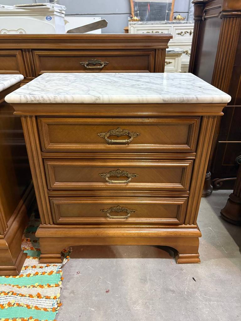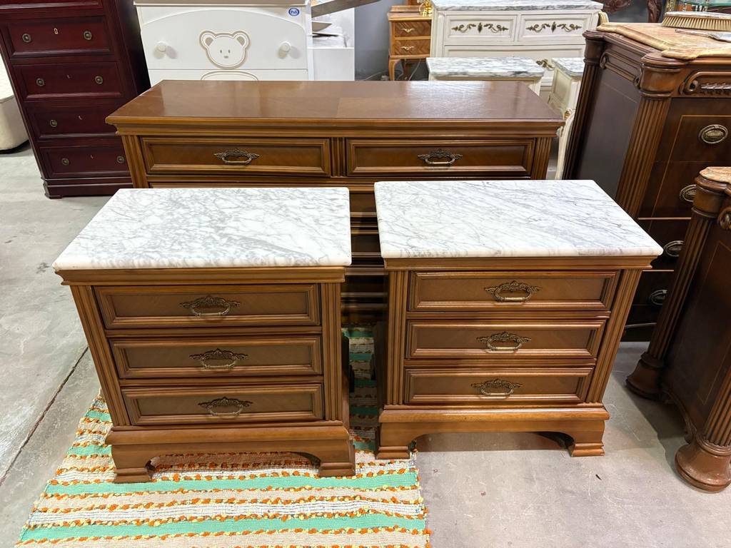 Cómoda y dos mesitas fabricadas en madera de buena calidad de color marrón claro. Se trata de una cómoda que tiene tres cajones alargados y dos más pequeños y dos mesitas de noche que cuentan con tres cajones con tiradores metálicos y una superficie marmolada cada una. Es un conjunto ideal para colocarlo en un dormitorio de matrimonio. Como se puede observar en las fotografías se encuentran en buenas condiciones.