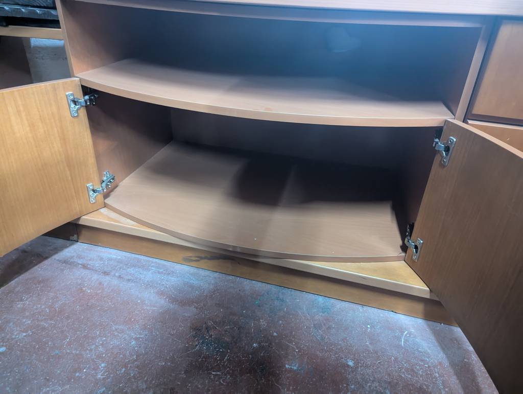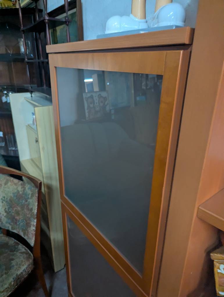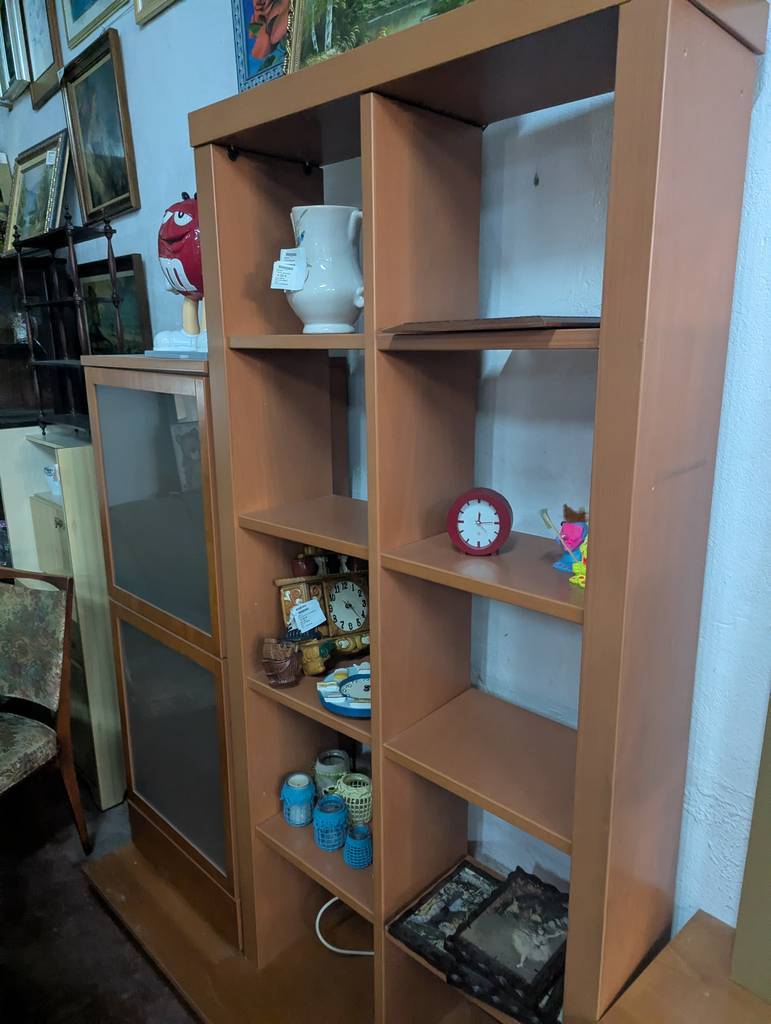 Conjunto de comedor de grandes dimensiones que ha sido fabricado con madera de buena calidad y robusta. Se compone de un mueble para televisor con cajones y puertas, así como una estantería con diez habitáculos abiertos y dos compartimentos con puertas de cristal opaco. Es un mueble ideal para amueblar un salón comedor. Como podemos observar en las fotografías se encuentra en buenas condiciones.