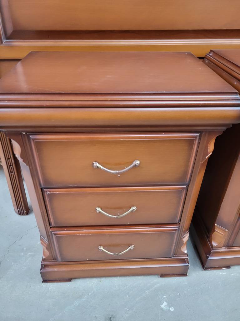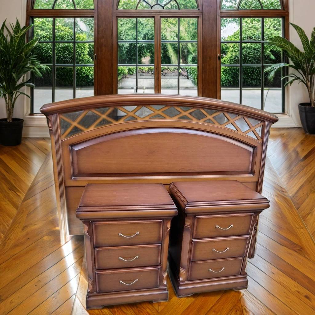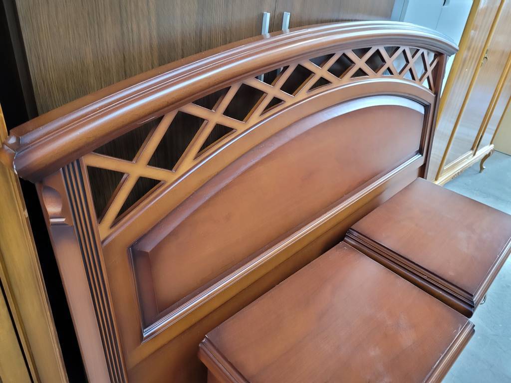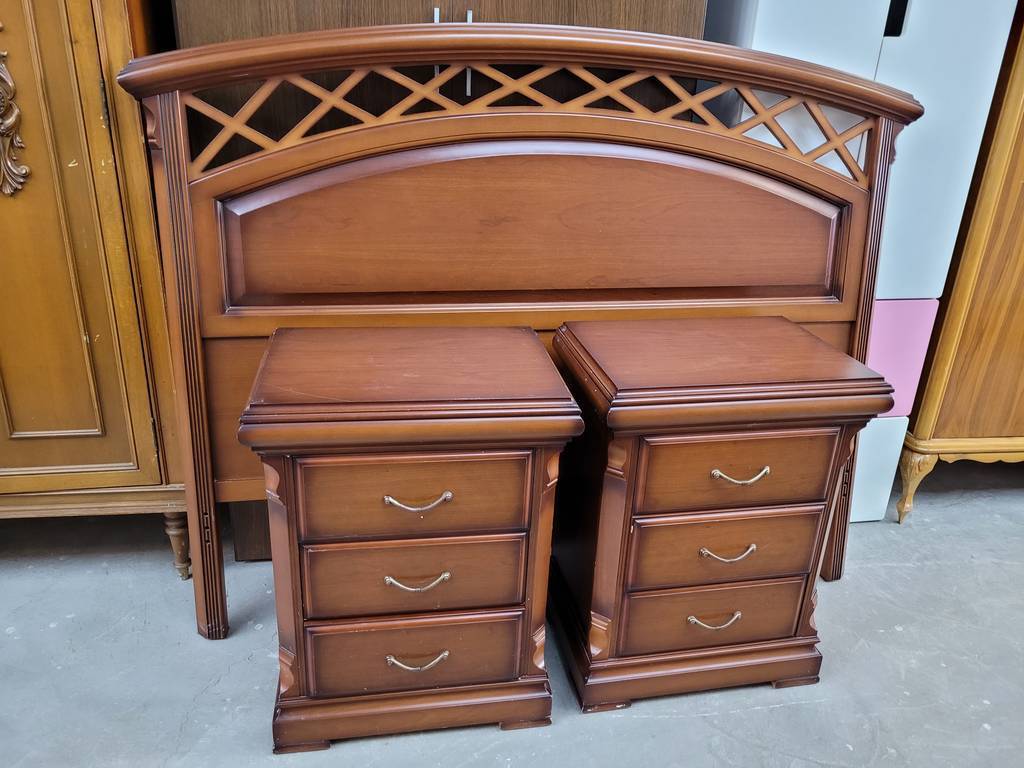 Conjunto de estilo clásico y elegante que está compuesto por un cabecero y dos mesitas, todo ello a juego. Es un conjunto que ha sido fabricado con madera de buena calidad y robusta. Las mesitas disponen en la parte frontal de tres cajones con tiradores incorporados para abrirlos fácilmente. Es un conjunto ideal para amueblar un dormitorio. Como podemos observar en las fotografías se encuentra en buenas condiciones.