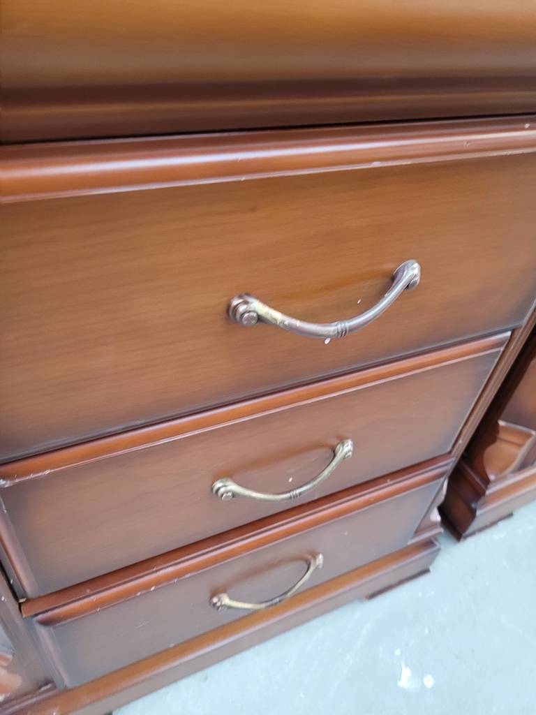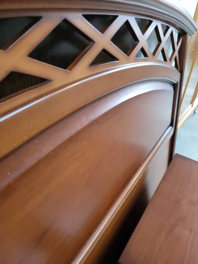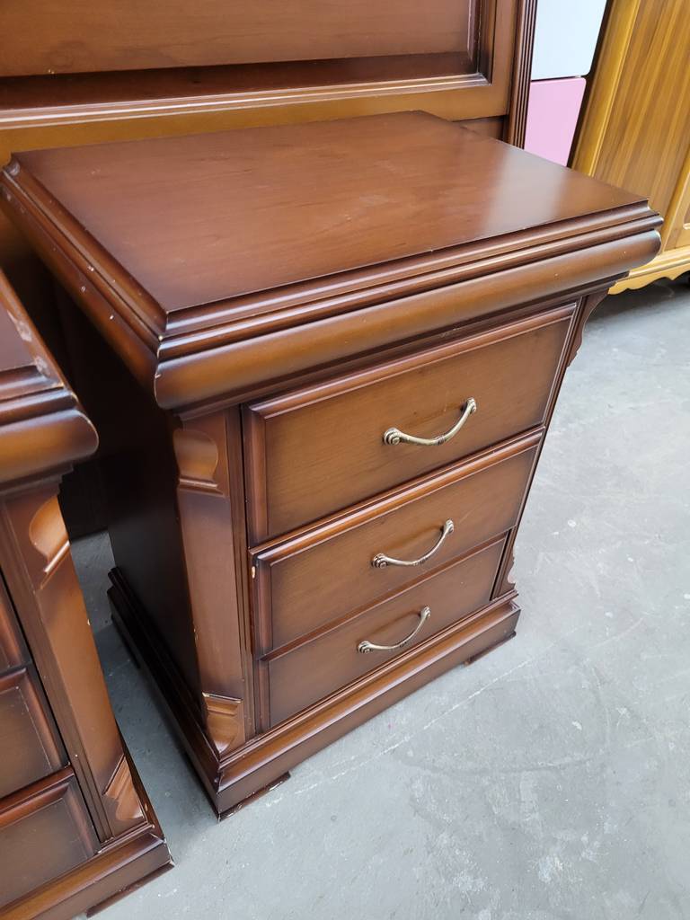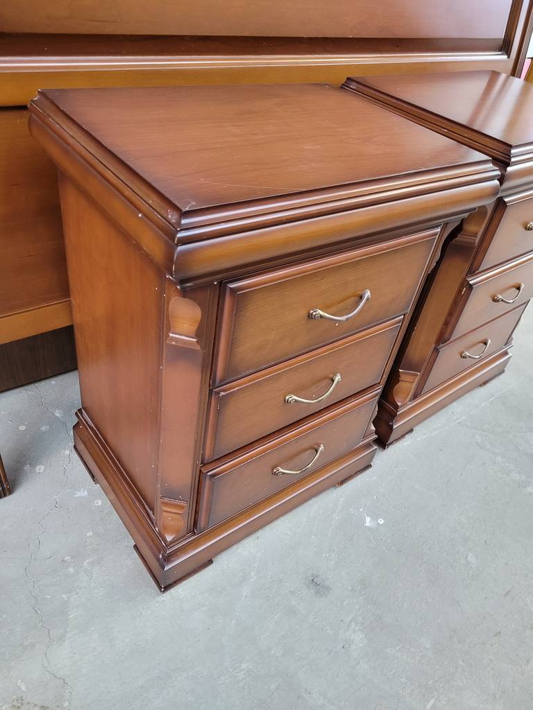 Conjunto de estilo clásico y elegante que está compuesto por un cabecero y dos mesitas, todo ello a juego. Es un conjunto que ha sido fabricado con madera de buena calidad y robusta. Las mesitas disponen en la parte frontal de tres cajones con tiradores incorporados para abrirlos fácilmente. Es un conjunto ideal para amueblar un dormitorio. Como podemos observar en las fotografías se encuentra en buenas condiciones.