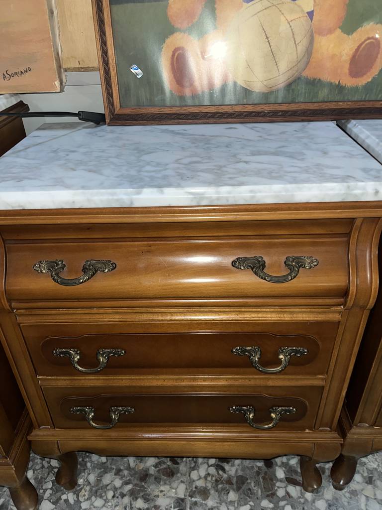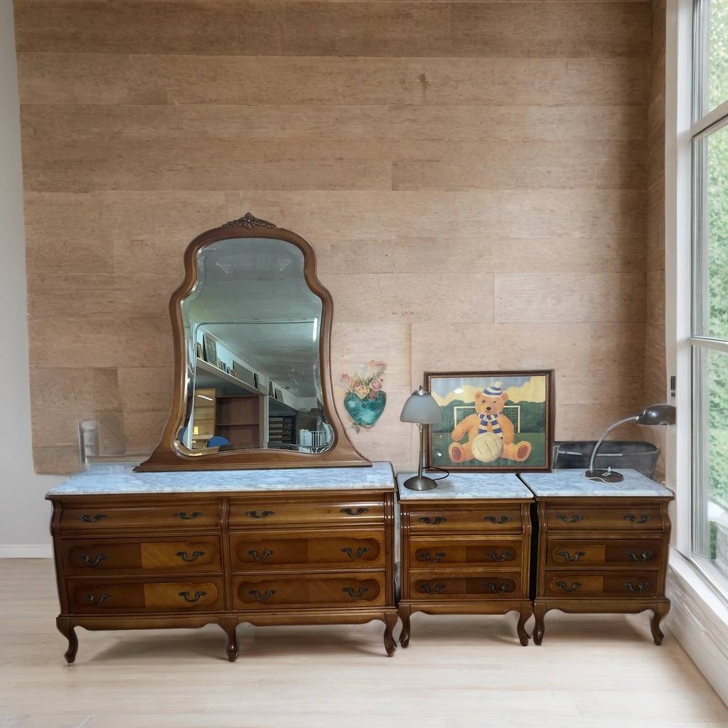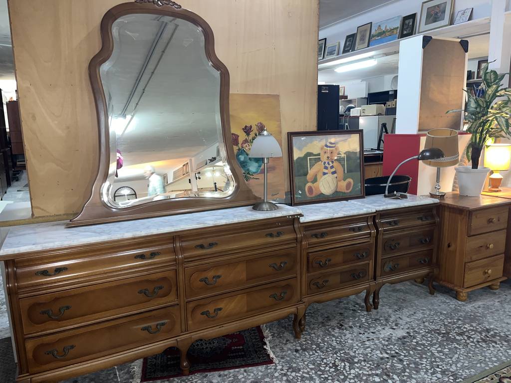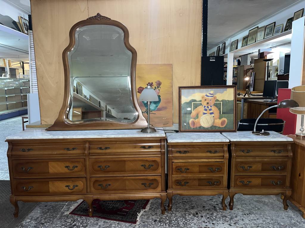 Conjunto de dormitorio de estilo clásico compuesto por una cómoda con espejo y dos mesitas. Todo el conjunto ha sido fabricado con madera de buena calidad y robusta. Tanto la cómoda como las mesitas incorporan cajones amplios ideales para almacenar todo tipo de enseres. Aprovecha esta oportunidad de amueblar tu dormitorio dándole un estilo clásico y elegante.