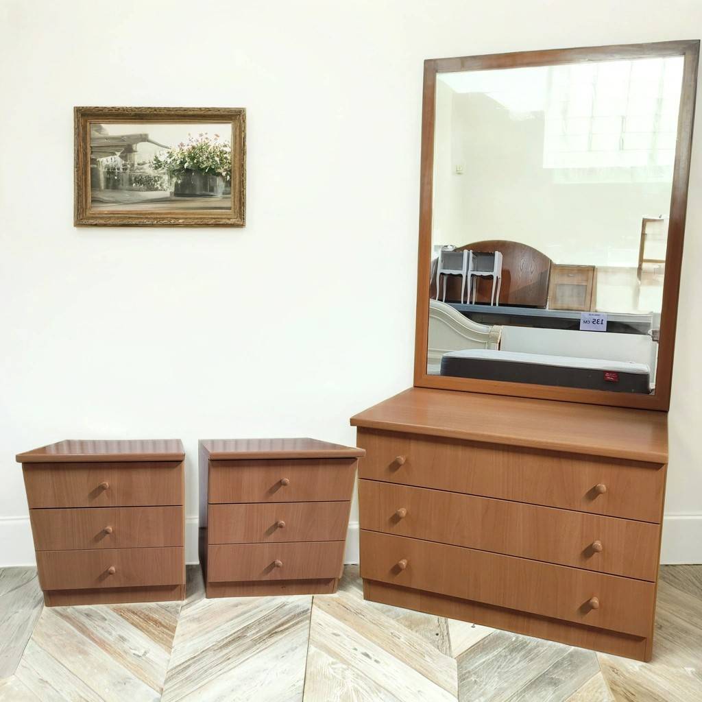 📐 Medidas Espejo (ancho x fondo x alto): 80×99.5×2.5cm. Cómoda 80x42x56cm. Mesitas 40x42x56cm.