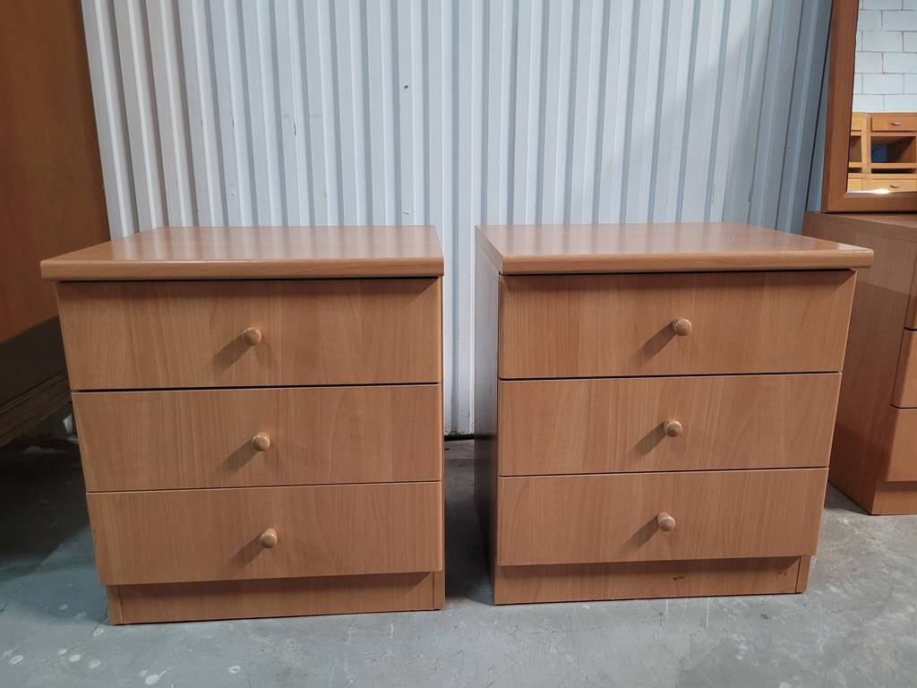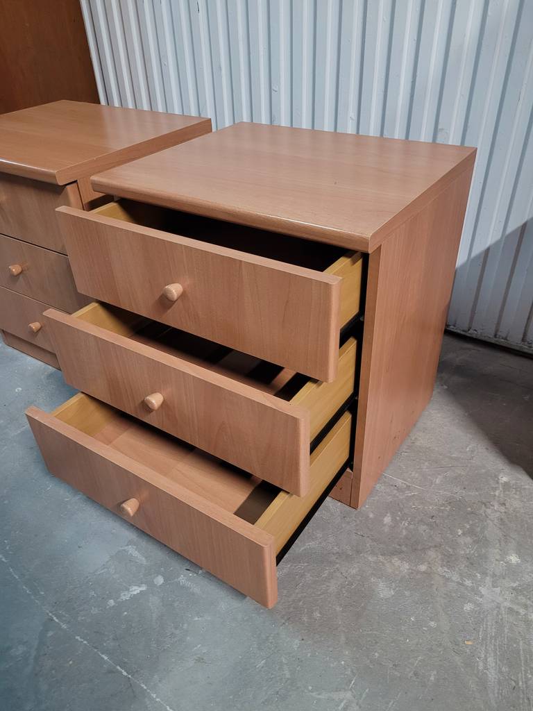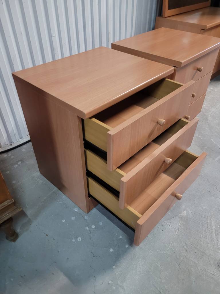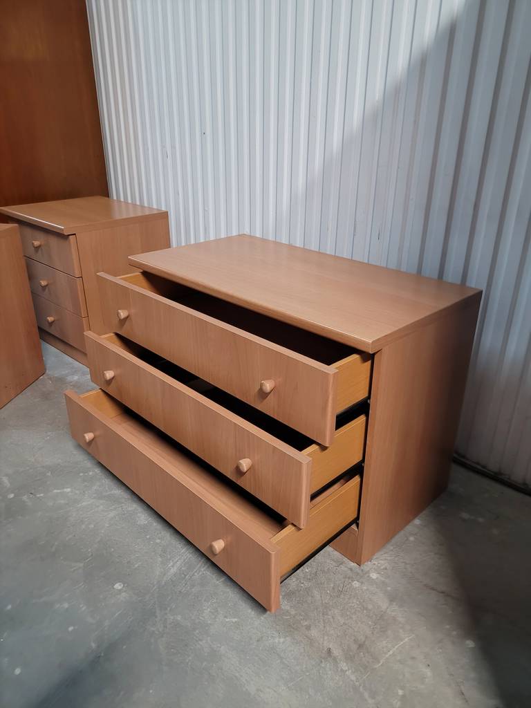 Conjunto de dormitorio formado por dos mesitas de noche, una cómoda y un espejo. Se trata de un conjunto de dormitorio completo fabricado en madera de buena calidad de color marrón claro que resulta ideal para colocarlo en un dormitorio de matrimonio. Como se puede observar en las fotografías se encuentra en buenas condiciones para ser utilizado.