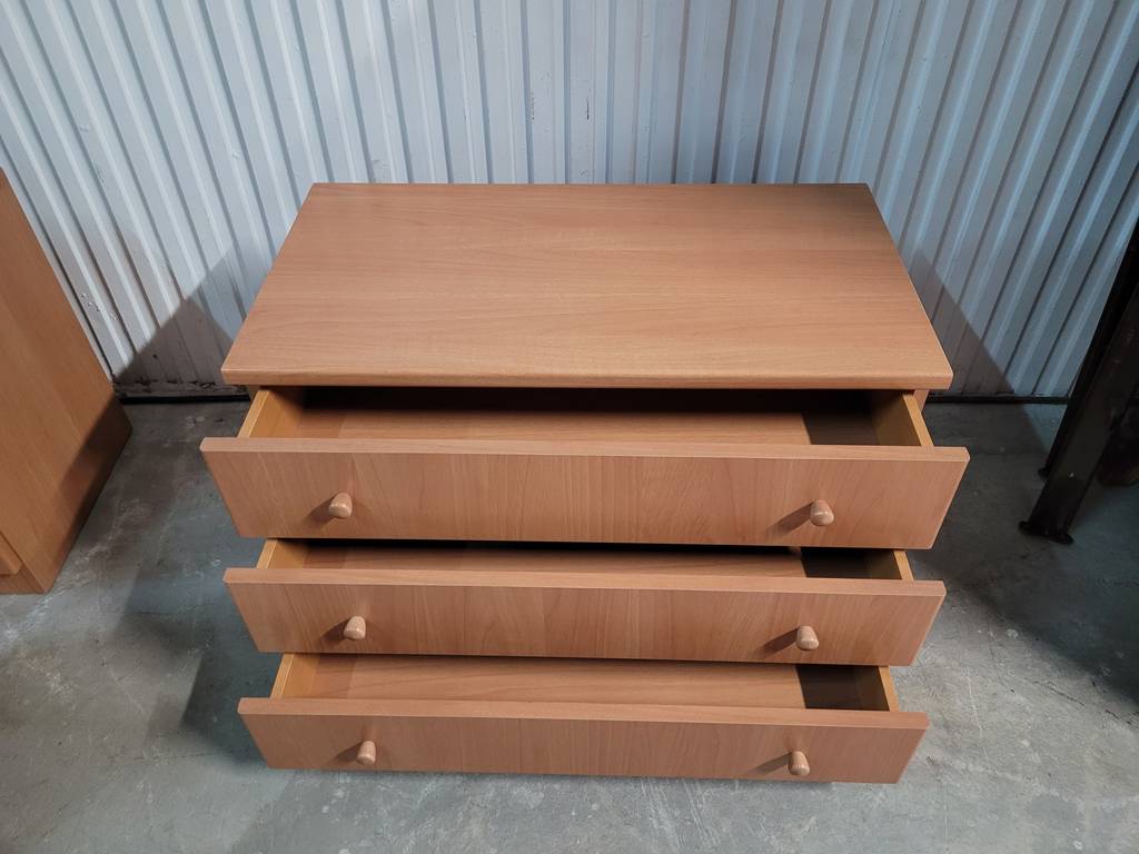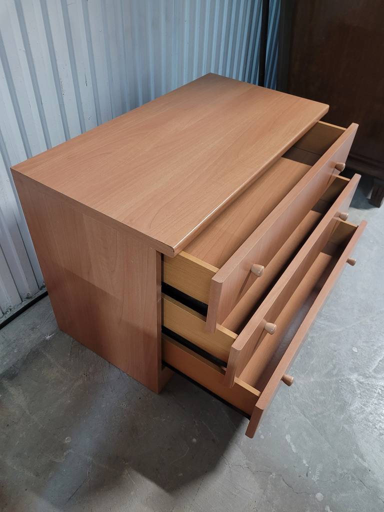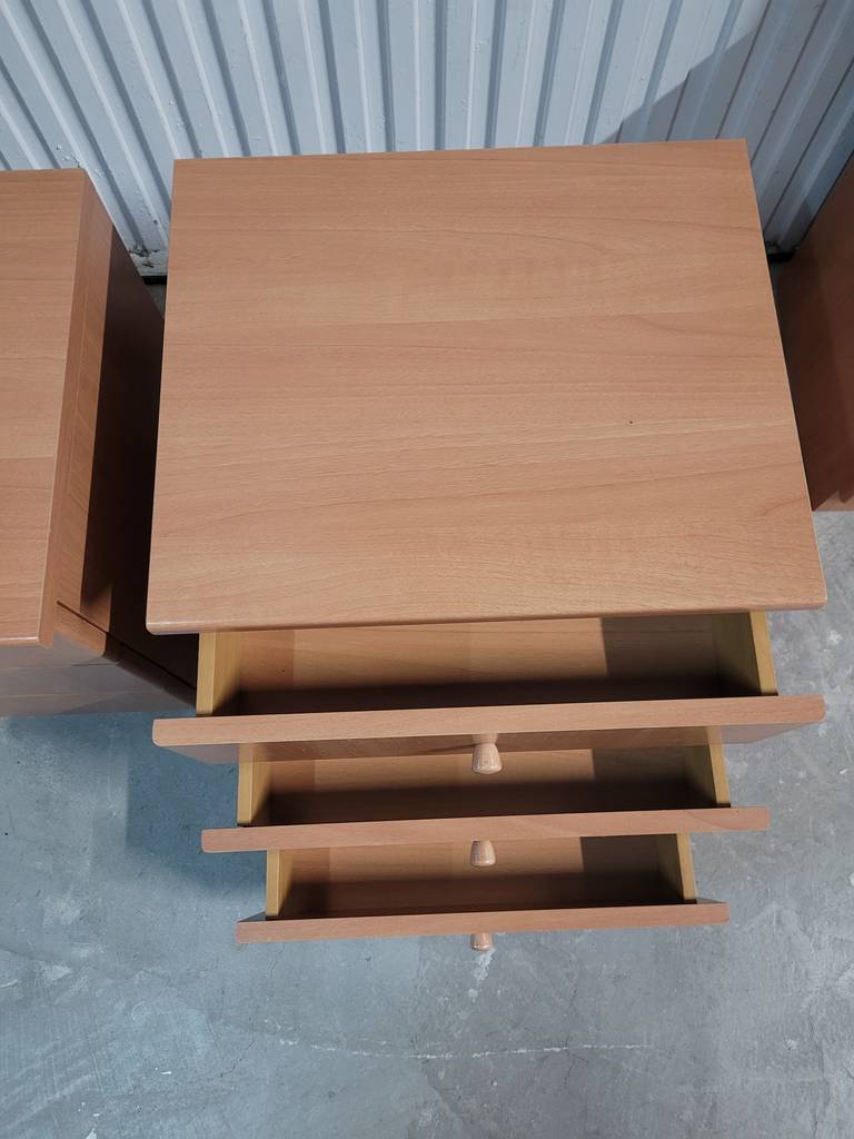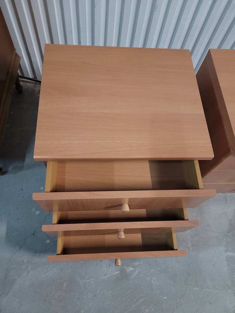 Conjunto de dormitorio formado por dos mesitas de noche, una cómoda y un espejo. Se trata de un conjunto de dormitorio completo fabricado en madera de buena calidad de color marrón claro que resulta ideal para colocarlo en un dormitorio de matrimonio. Como se puede observar en las fotografías se encuentra en buenas condiciones para ser utilizado.