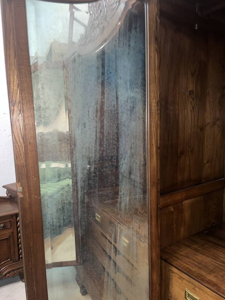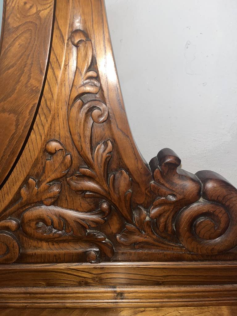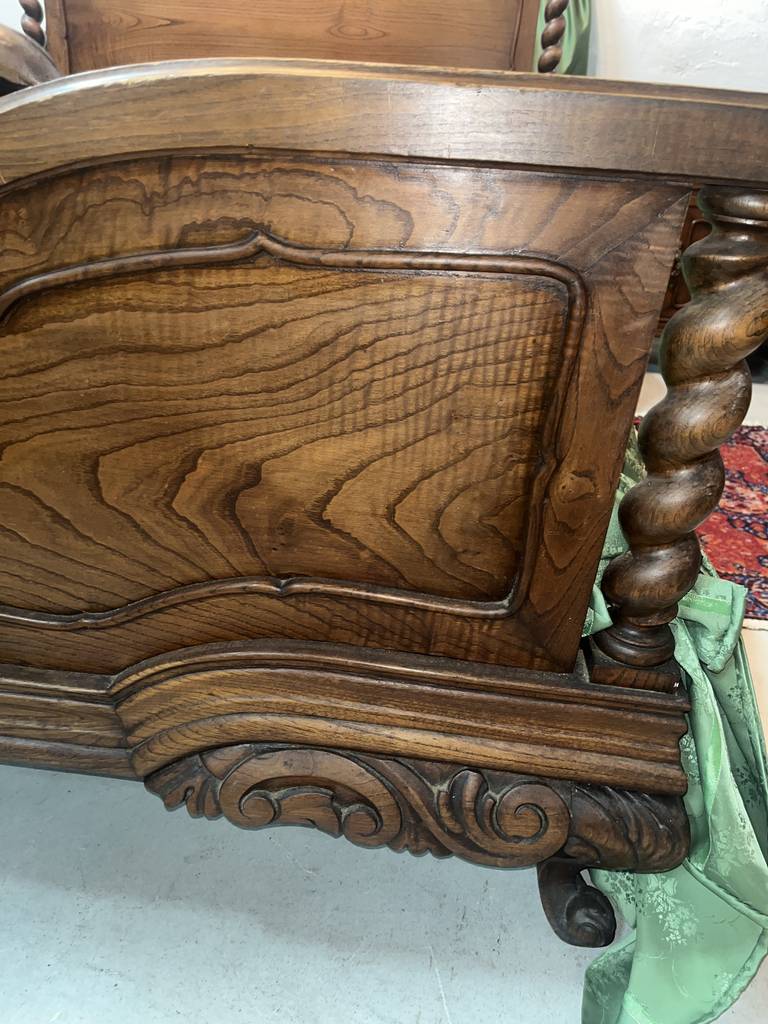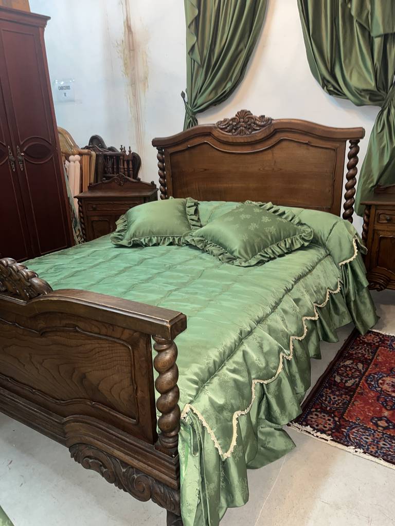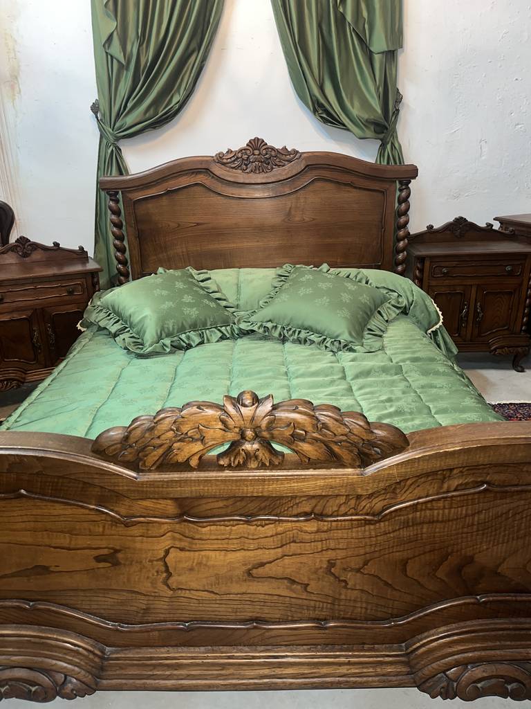 Conjunto de habitación formado por un armario, dos mesitas de noche, una cama y una cómoda con espejo, todo ello fabricado en madera de buena calidad de color marrón oscuro. Se trata de un conjunto de habitación completo que resulta ideal para amueblar todo un dormitorio de matrimonio con un estilo clásico. Como se puede observar en las fotografías se encuentra en buenas condiciones.
