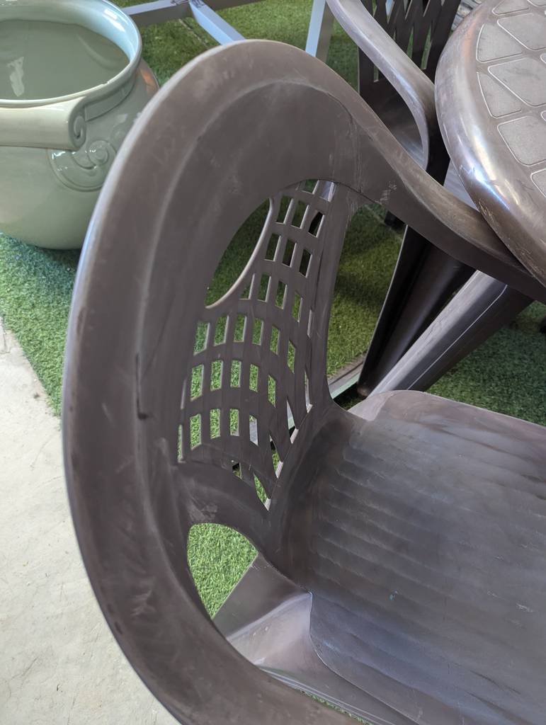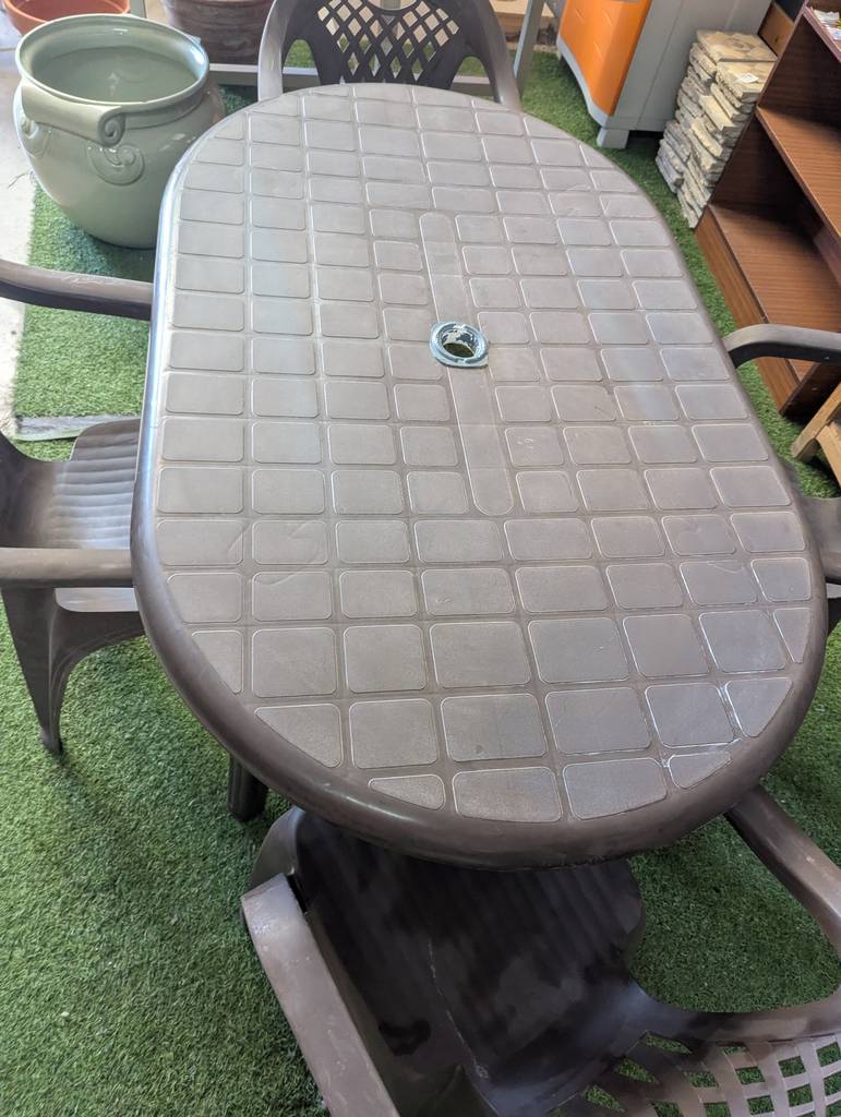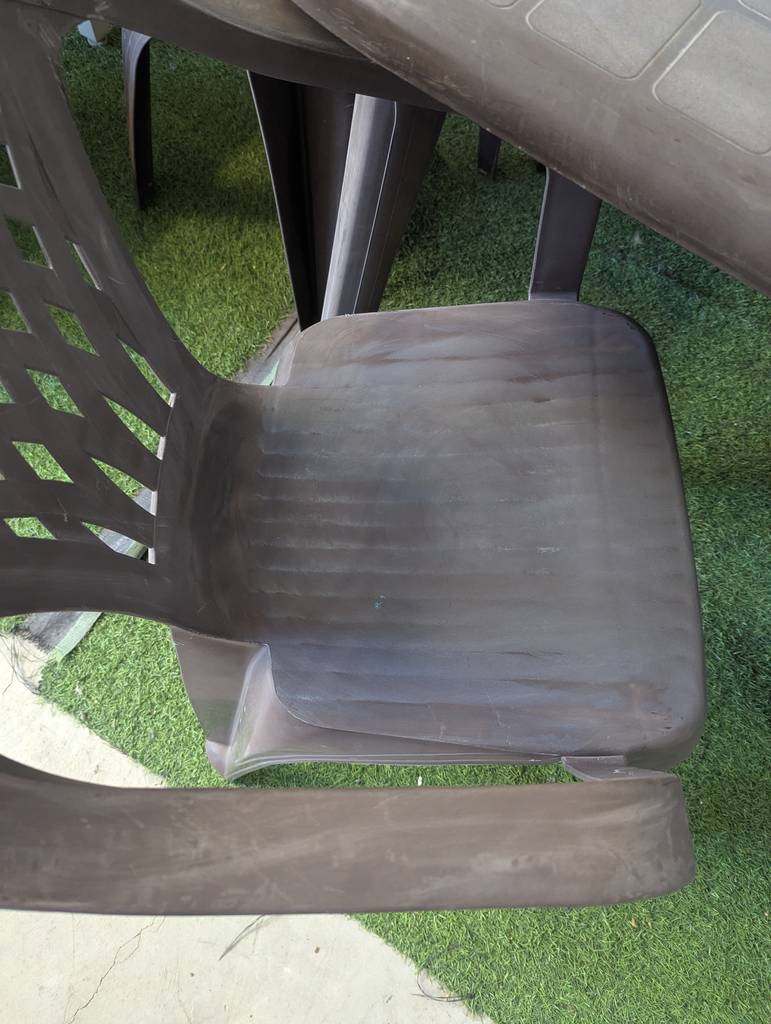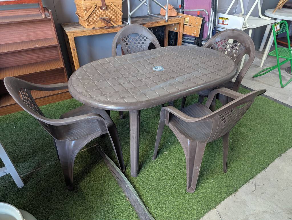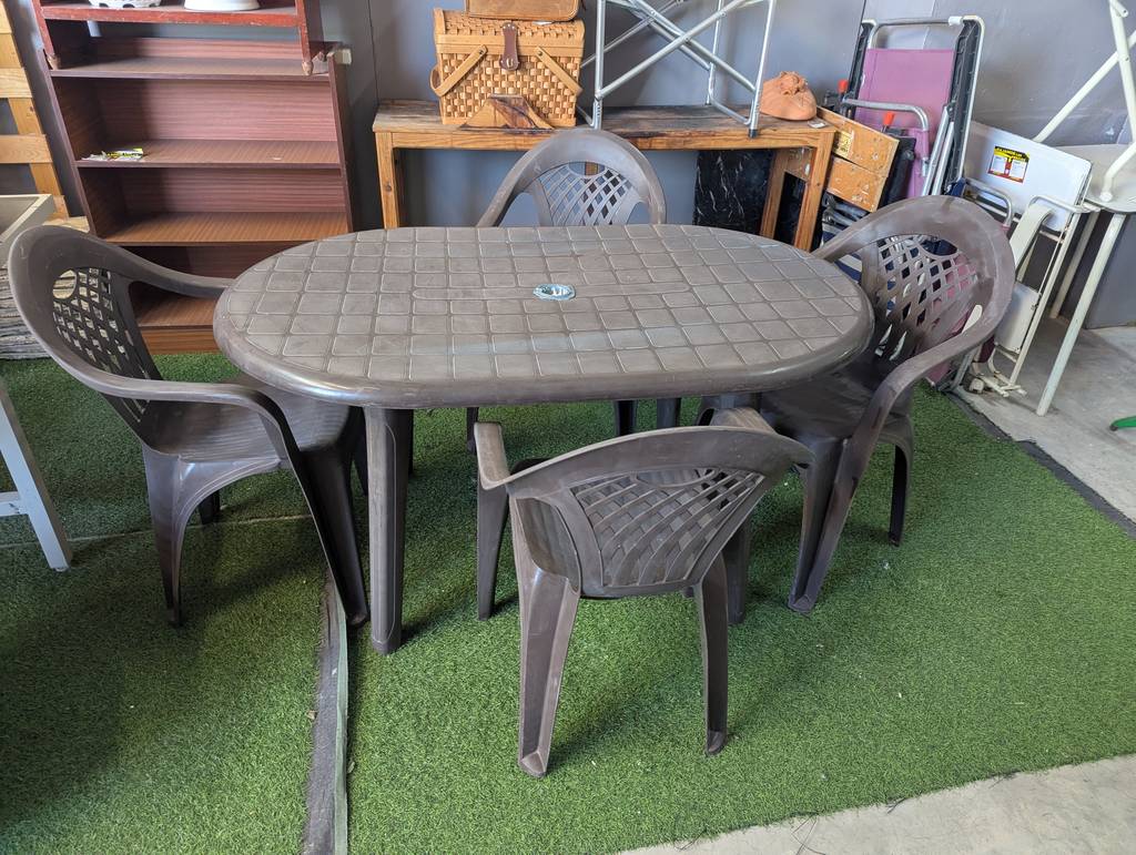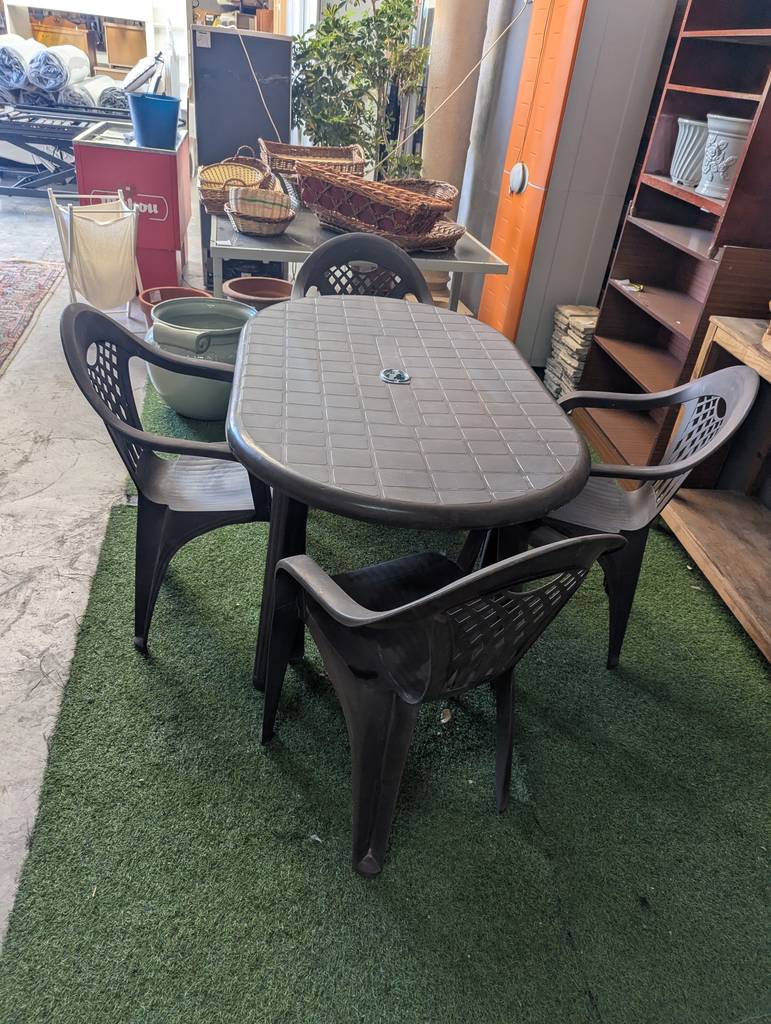 Conjunto de jardín formado por una mesa rectangular y de forma ovalada y cuatro sillas, todo ello fabricado en plástico grueso de buena calida de color verde oscuro. Se trata de un conjunto de jardín que resulta perfecto para colocarlo tanto en una zona exterior del hogar como en un patio. Como se puede observar en las fotografías se encuentra en buenas condiciones.