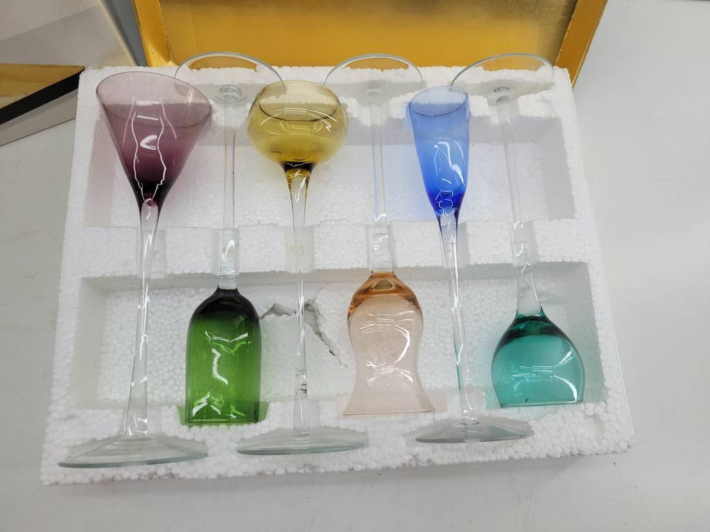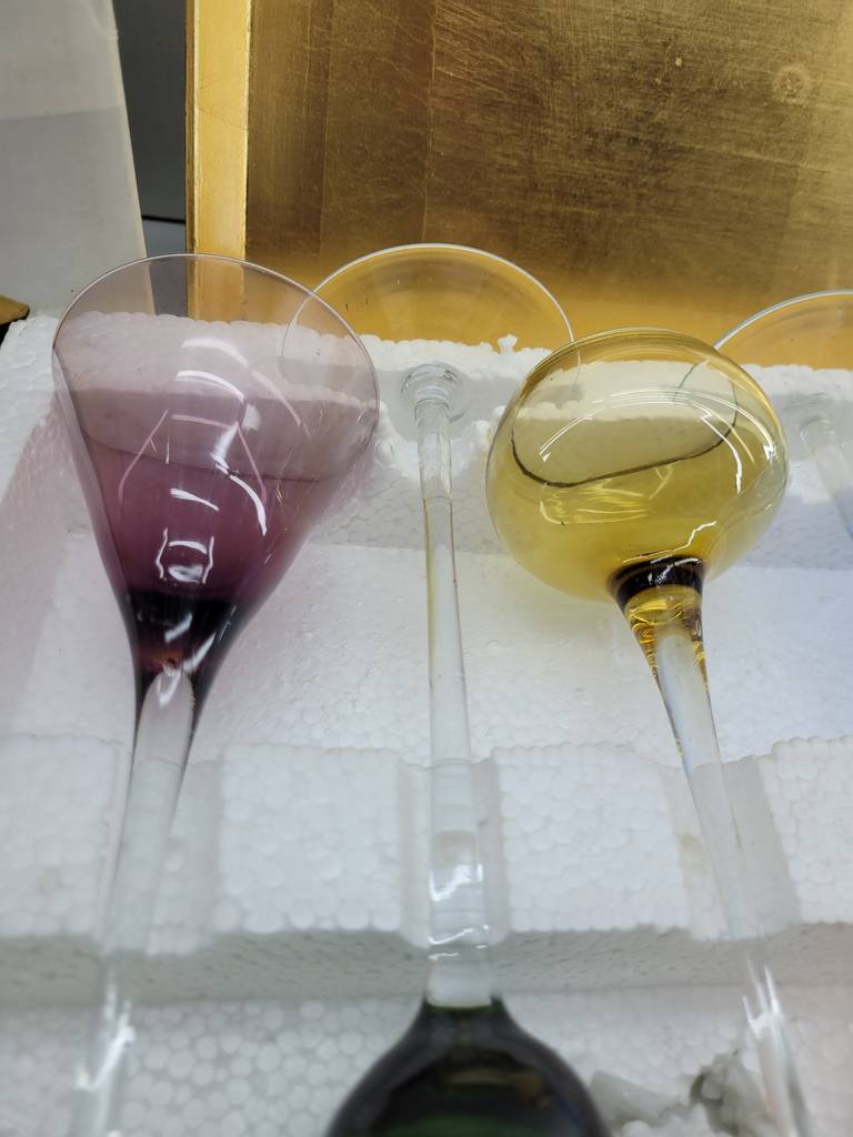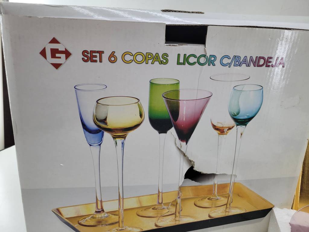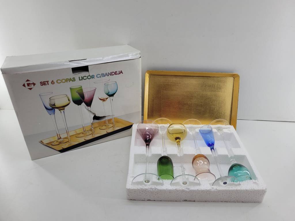 Set compuesto por 6 copas de licor con una bandeja de color dorado. Cada copa es de un color distinto aportando mucha variedad y elegancia. Son ideales para ser utilizadas en celebraciones especiales aportando un toque único que las hará resaltar. Son aptas para lavavajillas. Como podemos observar en las fotografías se encuentran en buenas condiciones y con su caja protectora incluida.