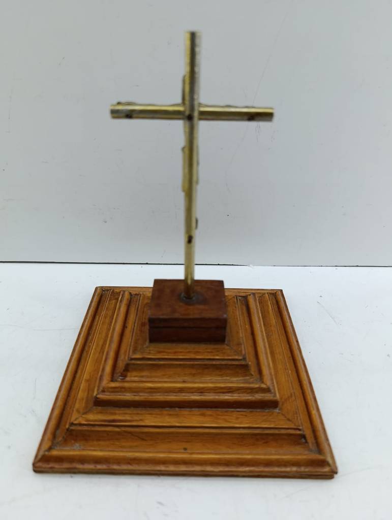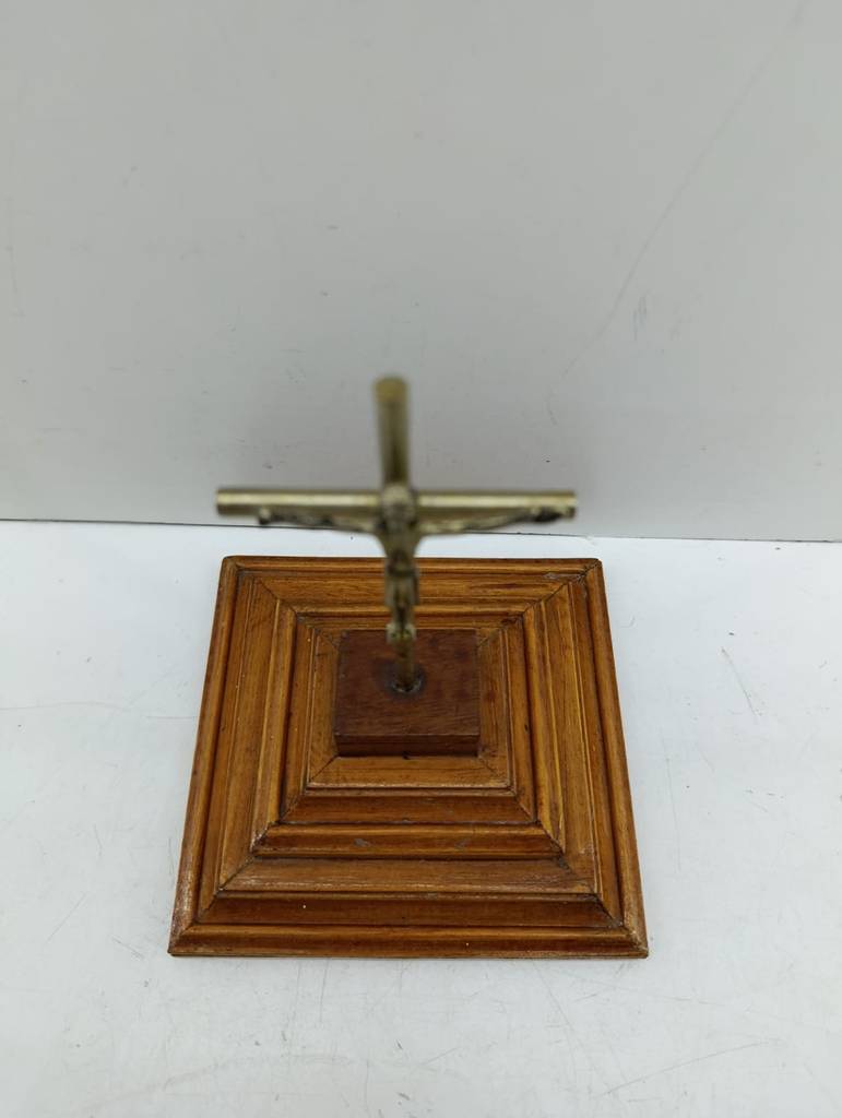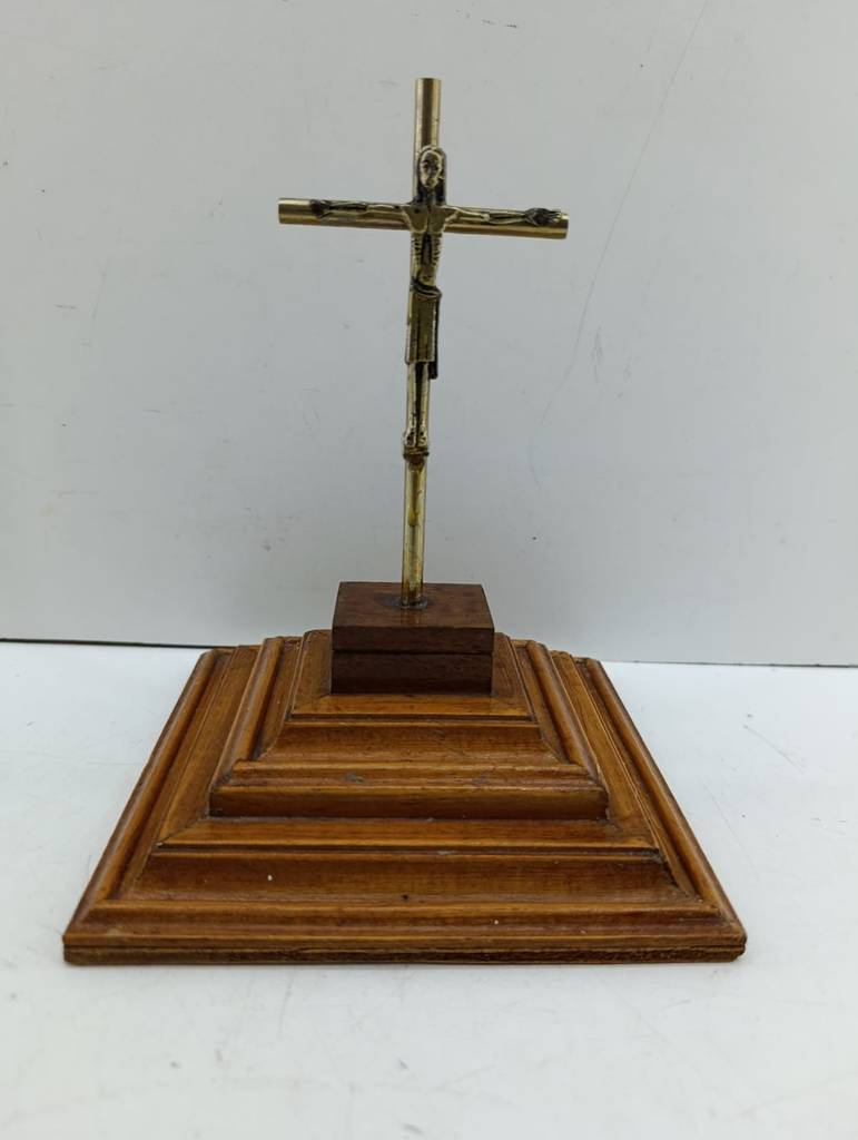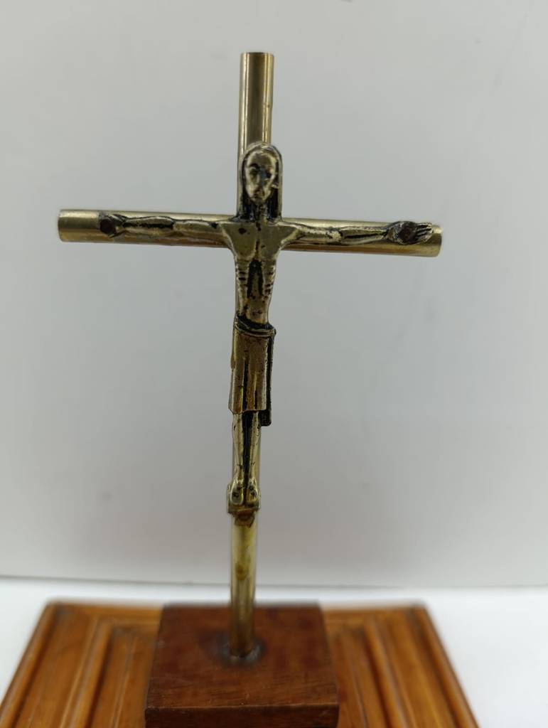 Crucifijo de mesa fabricado en madera de buena calidad de color marrón claro y dorado. Se trata de un crucifijo de mesa que tiene una base robusta de madera con una forma cuadrangular y tiene un crucifijo fino con la figura de Jesucristo en la cruz. Es un objeto ideal para personas religiosas. Como se puede observar en las fotografías se encuentra en buenas condiciones.