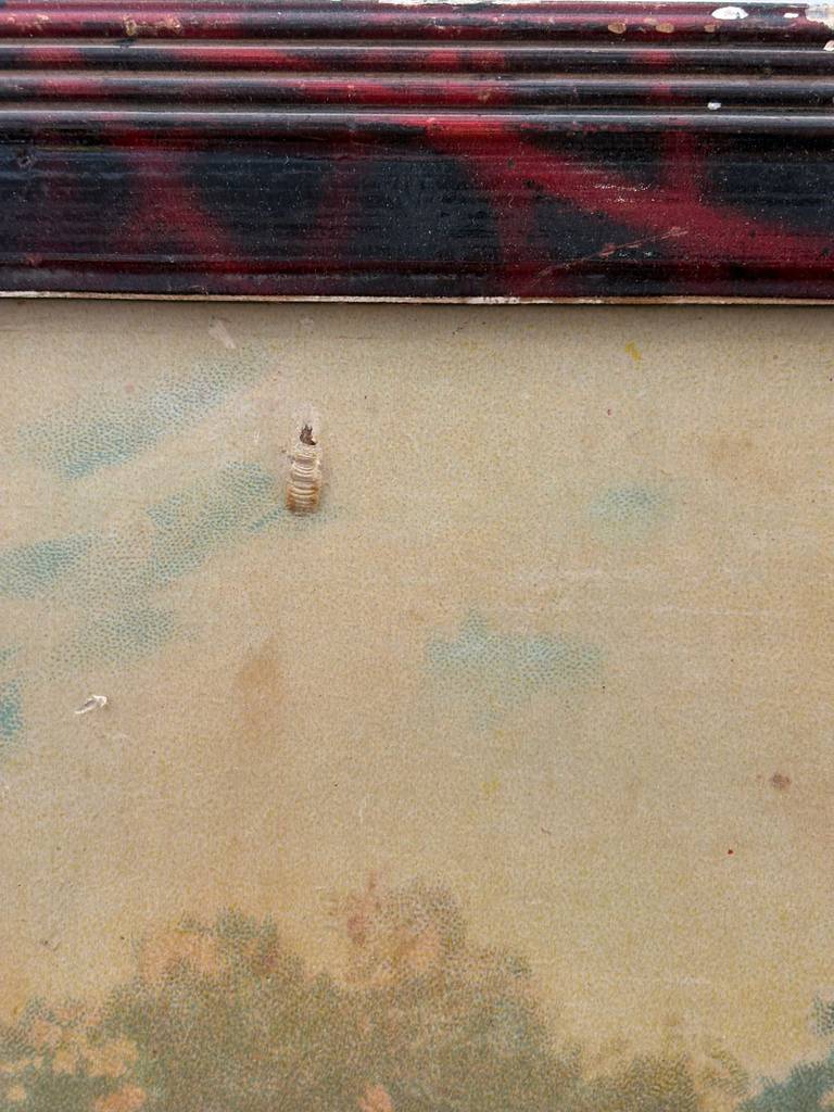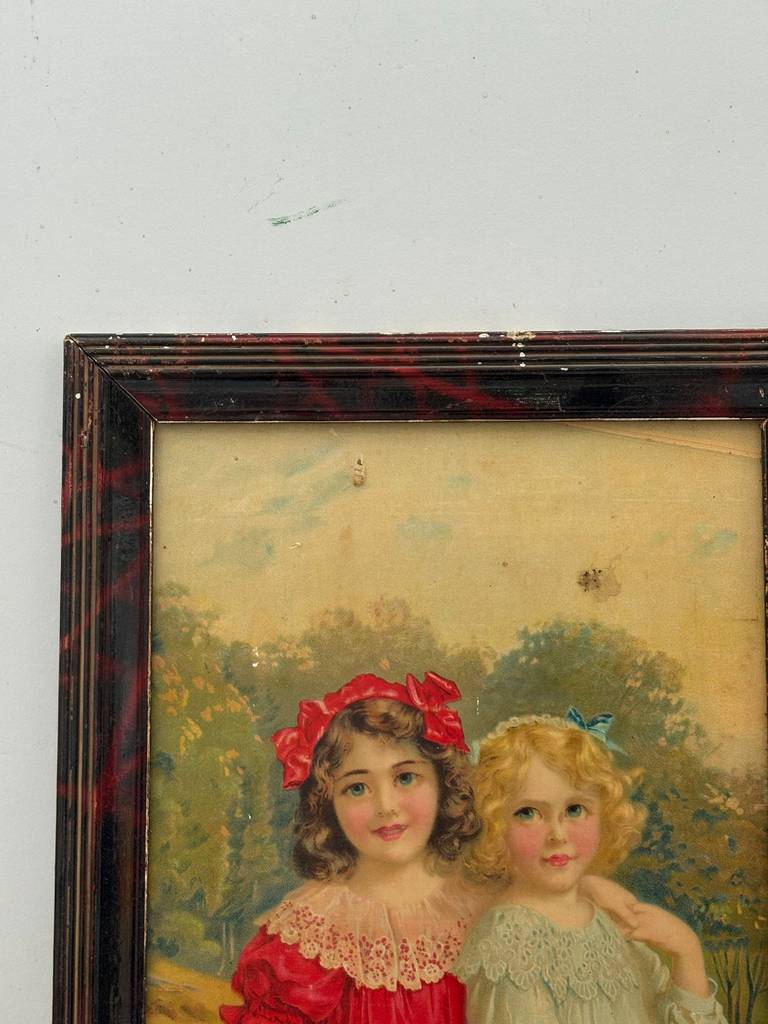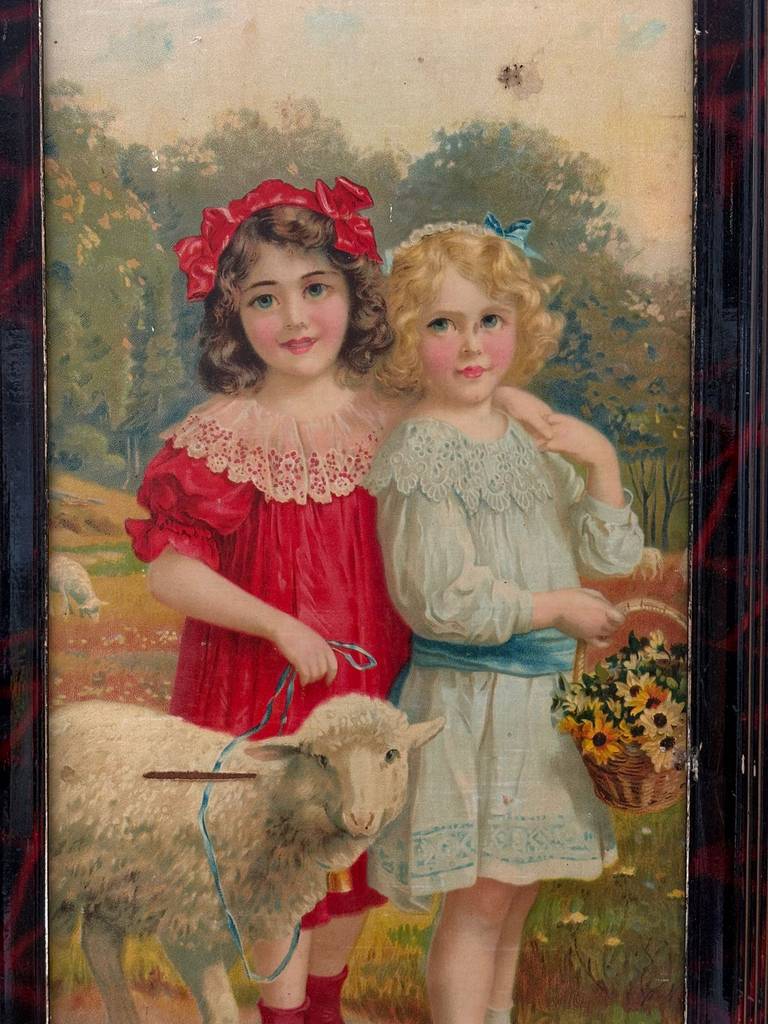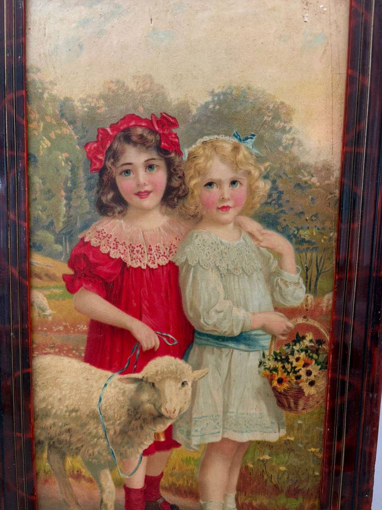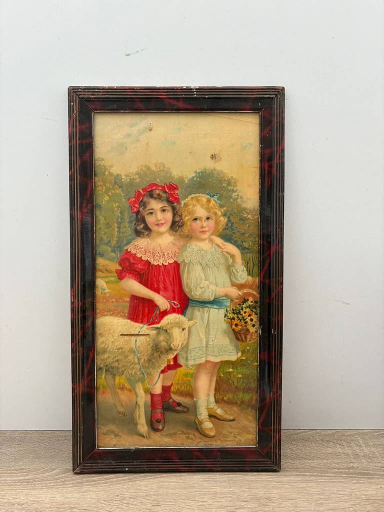 Cuadro con forma rectangular en el que podemos observar a dos niñas vestidas de época acompañadas con una cabrita sobre un fondo de un bosque. Está enmarcado con un marco de madera de buena calidad. Es un cuadro ideal para colocar en un salón comedor o recibidor. Como podemos observar en las fotografías presenta desperfectos.