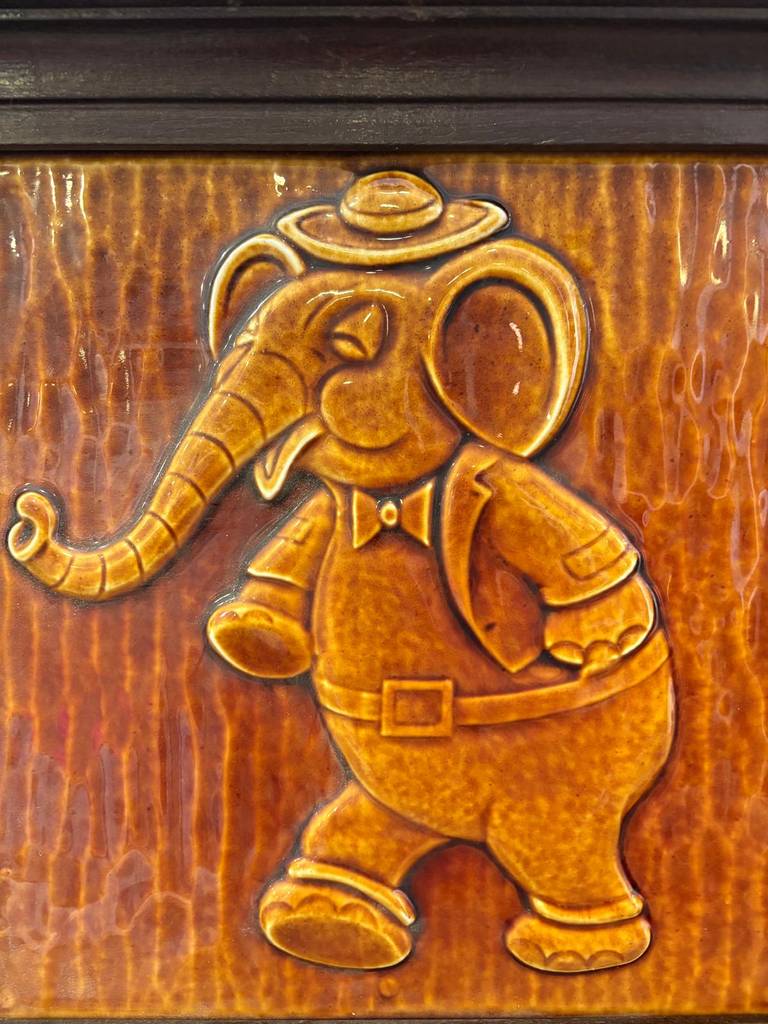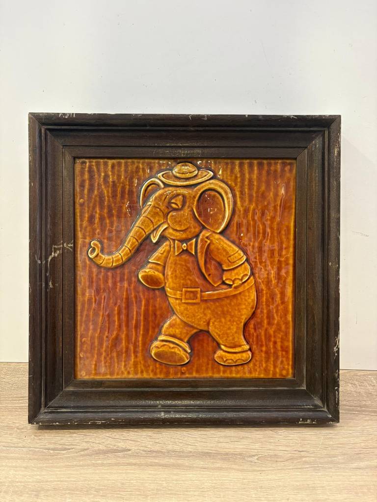 Cuadro muy bonito y coqueto de un elefante vestido como una persona de época. La pieza se encuentra esmaltada y en relieve lo que la hace resaltar. Es un cuadro ideal para colocar en cualquier estancia, en especial el salón comedor o en un pasillo de una casa. El marco es de madera de buena calidad y robusta. Como podemos observar en las fotografías presenta desperfectos.
