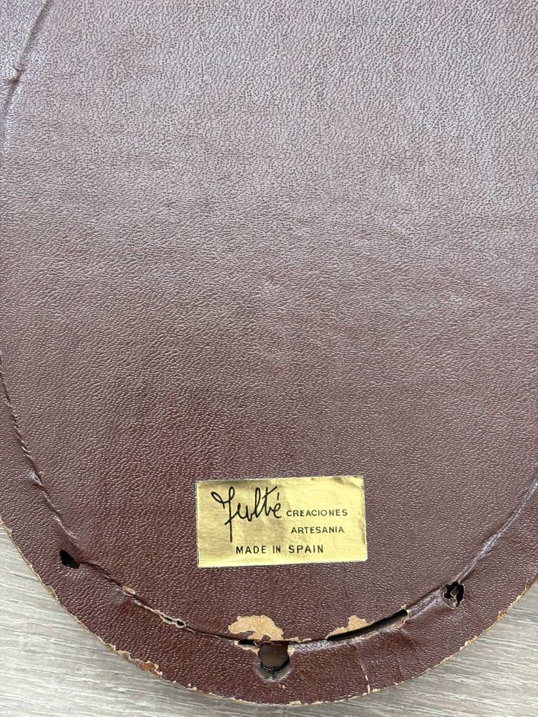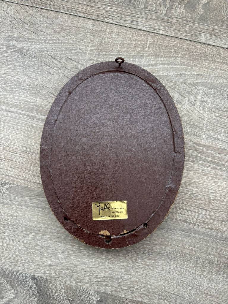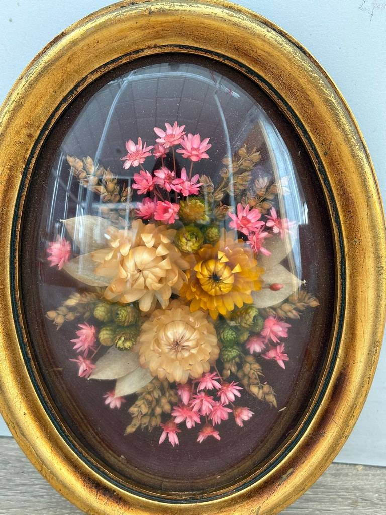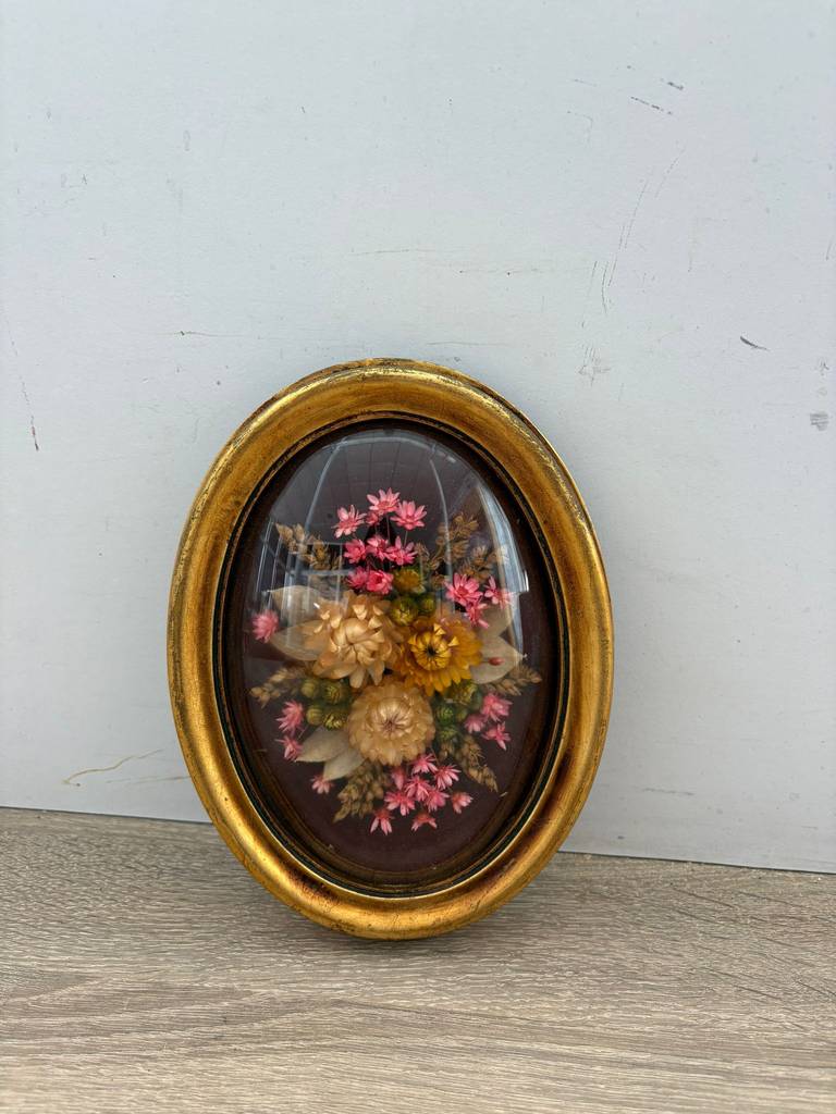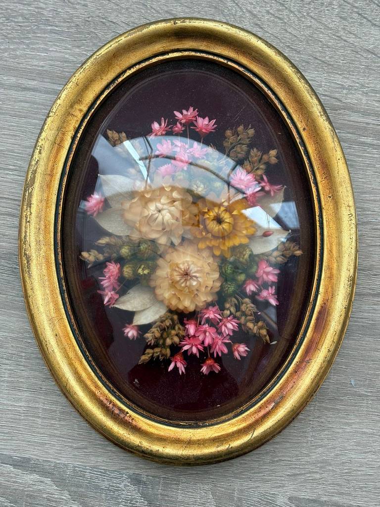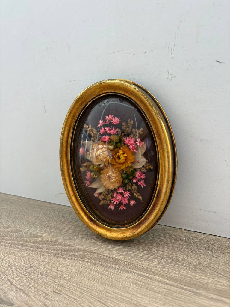 Cuadro con forma ovalada muy bonito y original con flores reales sobre un cristal transparente que han sido realizadas con artesanía y precisión. Se encuentra enmarcado con un marco de madera de buena calidad y pintada de color dorado. Es un cuadro ideal para resaltar en un salón comedor o en un pasillo de la casa. Como podemos observar en las fotografías presenta desperfectos.