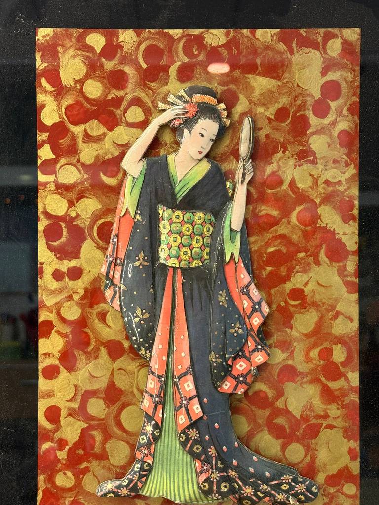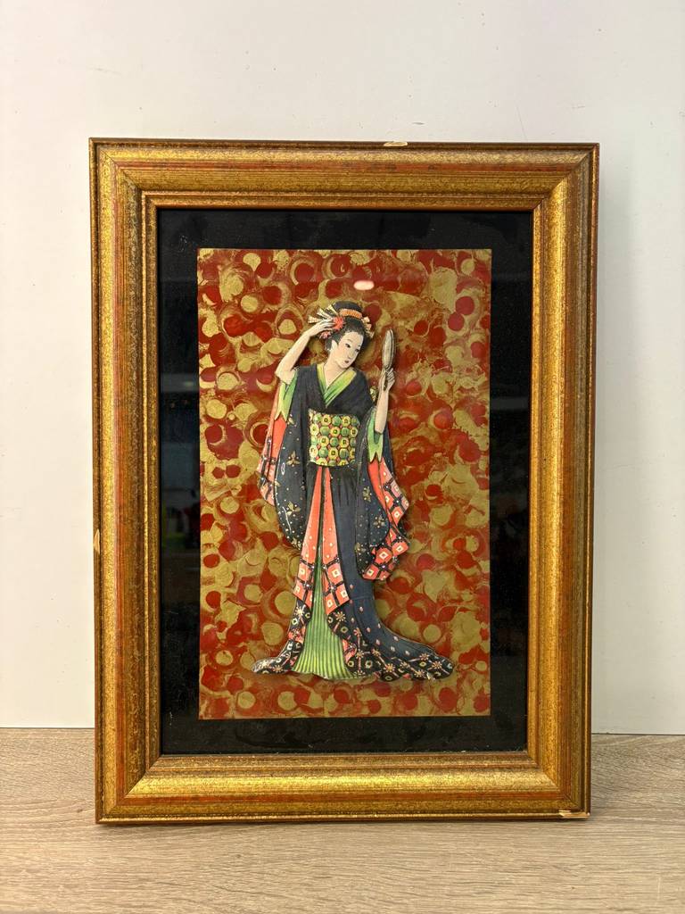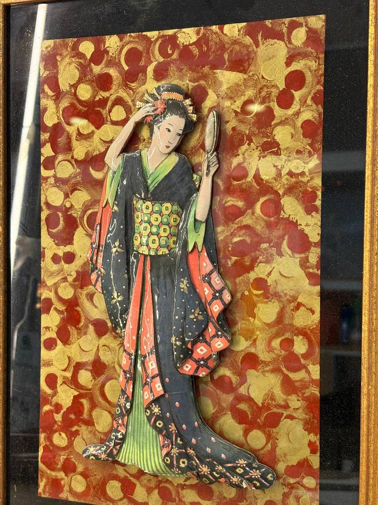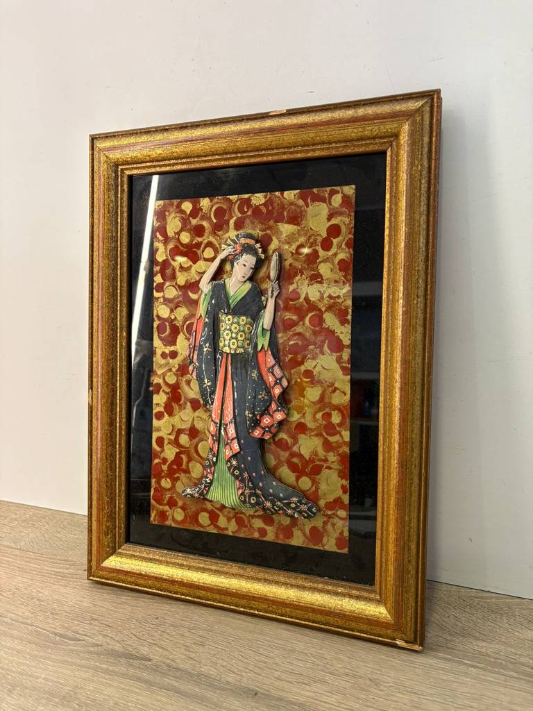 Cuadro de estilo japonés muy bonito y original en el que podemos observar a una geisha de época sobre un fondo ecléctico que la hace resaltar. Es una pieza decorativa única y original, ideal para colocar en un salón comedor o en un pasillo de la casa. Como podemos observar en las fotografías el marco presenta ligeros rasguños, pero en general se encuentra en buenas condiciones y listo para ser expuesto.
