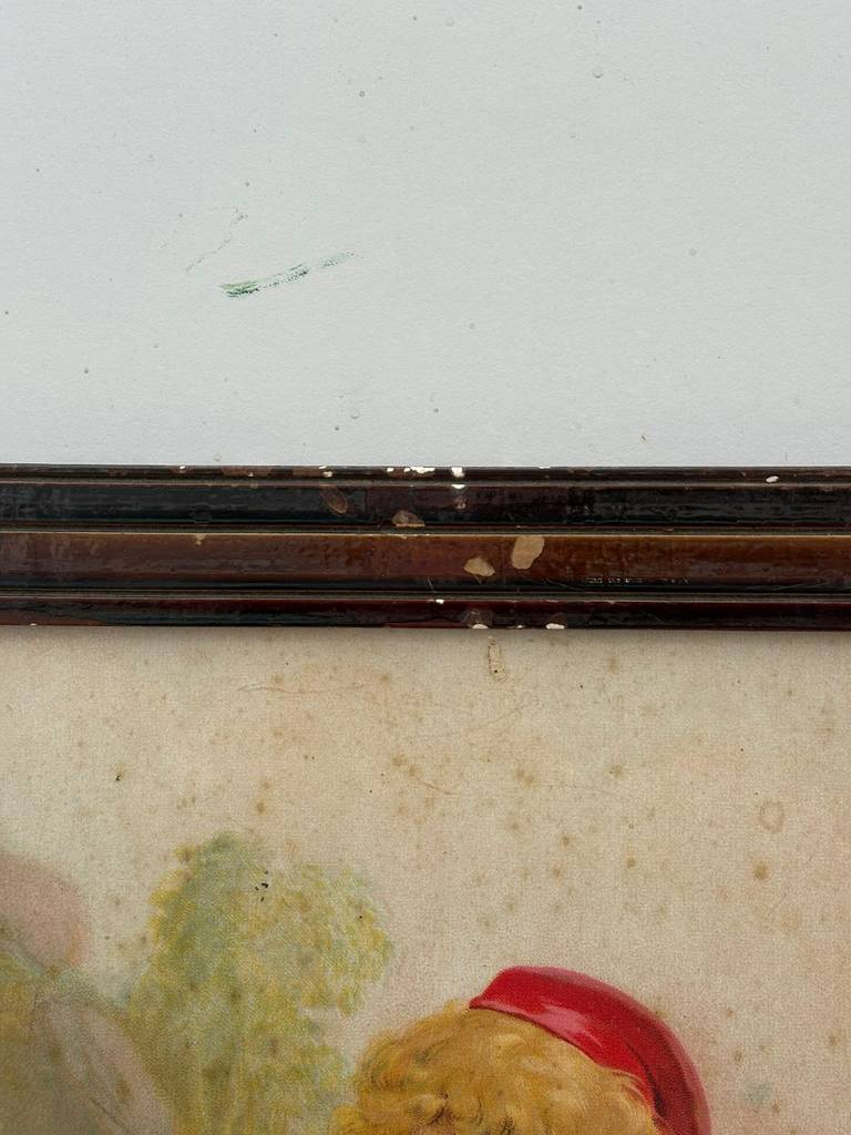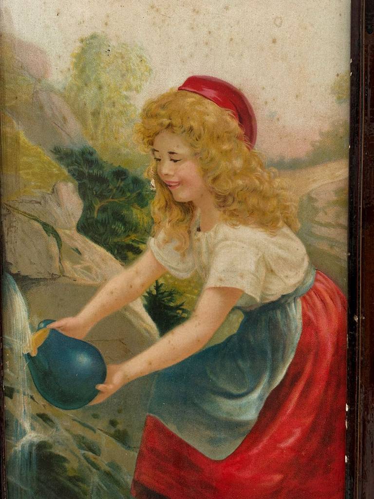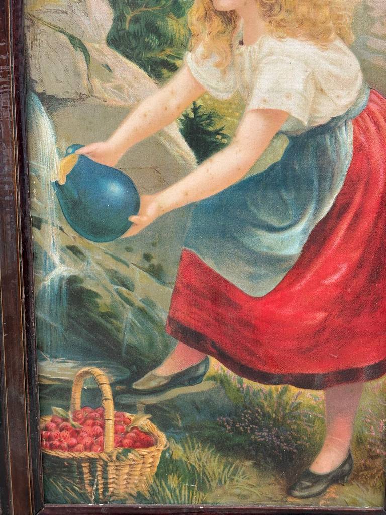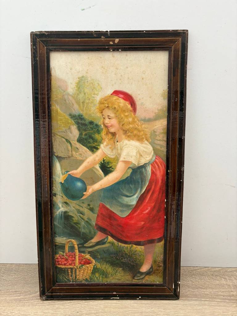 Cuadro con forma rectangular en el que podemos observar a una mujer en el campo recogiendo agua de una fuente natural y con una cesta llena de frutas. Está enmarcado con un marco de madera de buena calidad. Es un cuadro ideal para colocar en un salón comedor o recibidor. Como podemos observar en las fotografías presenta desperfectos.
