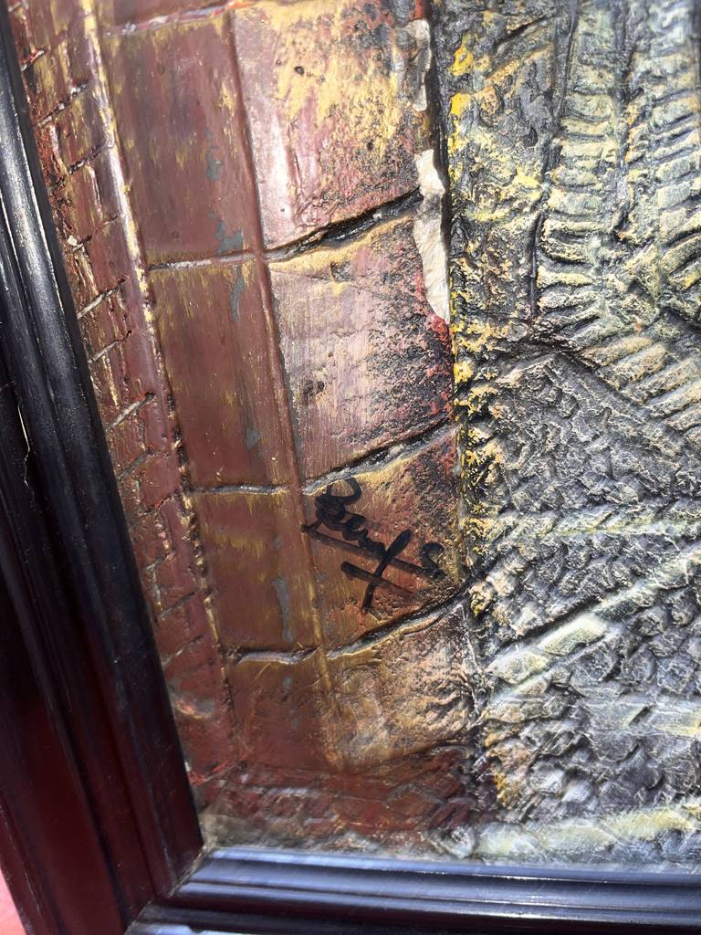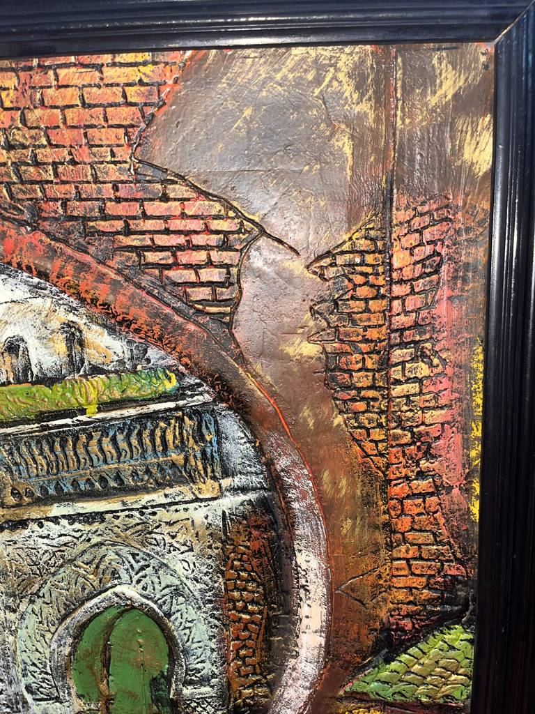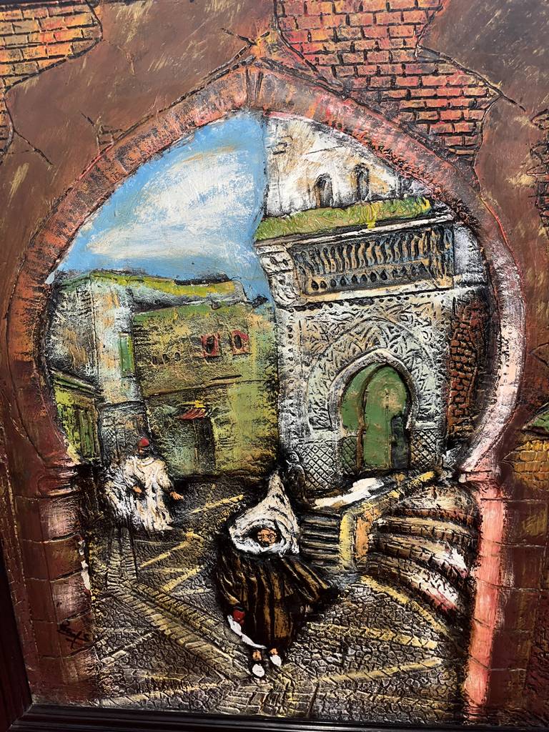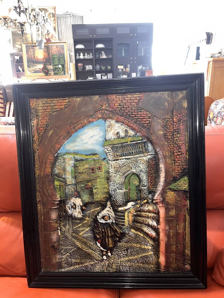 Cuadro pintado en relieve con motivo oriental con una forma cuadrangular. Se trata de un cuadro que tiene un marco de madera de buena calidad de color marrón oscuro y está firmado por el artista Banqs Marraquet. Es un cuadro ideal para colgarlo de una pared de un salón comedor. Como se puede observar en las fotografías se encuentra en buenas condiciones.