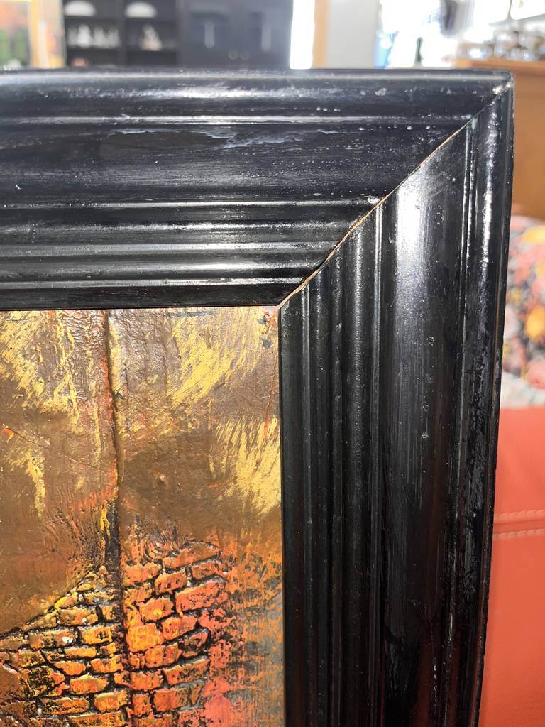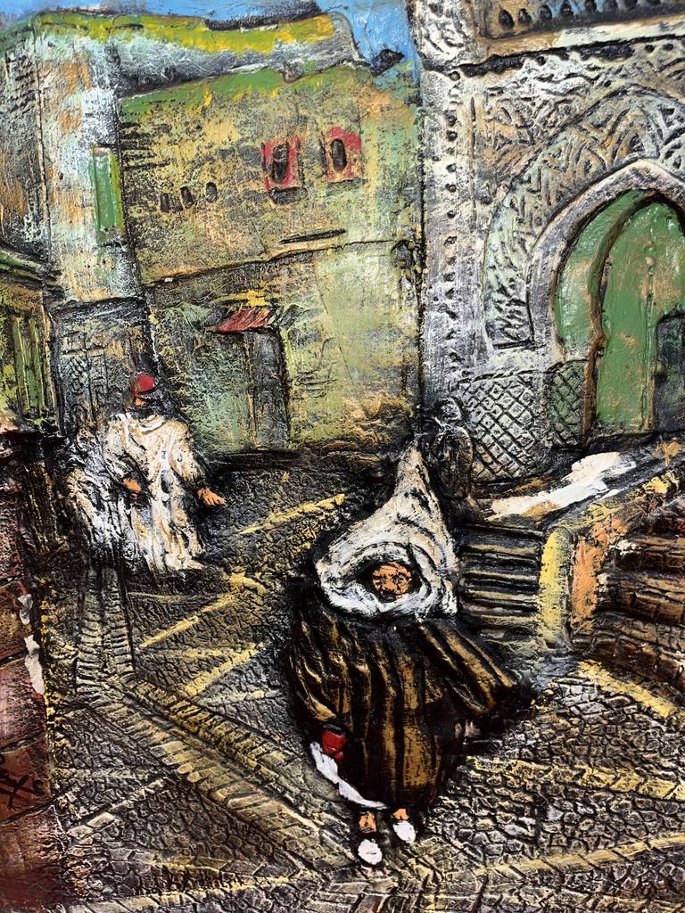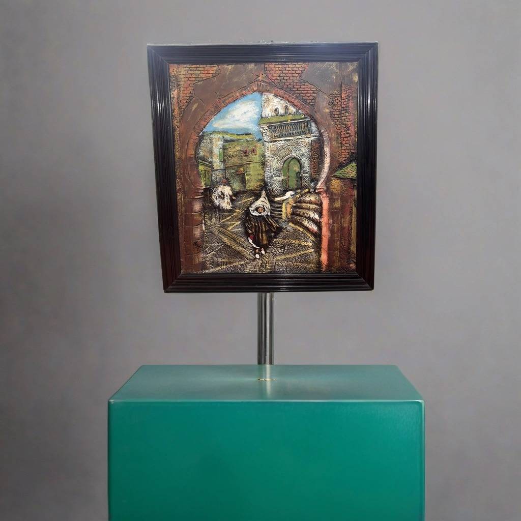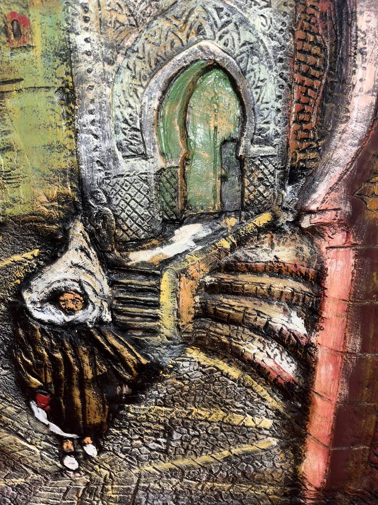 Cuadro pintado en relieve con motivo oriental con una forma cuadrangular. Se trata de un cuadro que tiene un marco de madera de buena calidad de color marrón oscuro y está firmado por el artista Banqs Marraquet. Es un cuadro ideal para colgarlo de una pared de un salón comedor. Como se puede observar en las fotografías se encuentra en buenas condiciones.