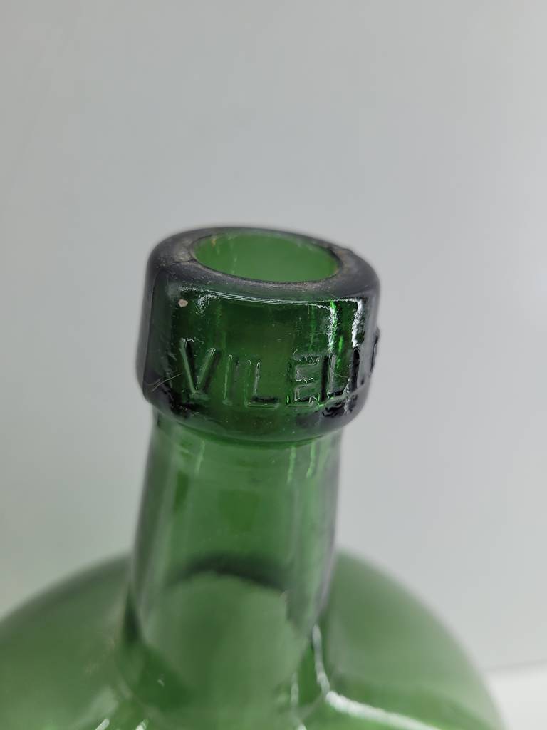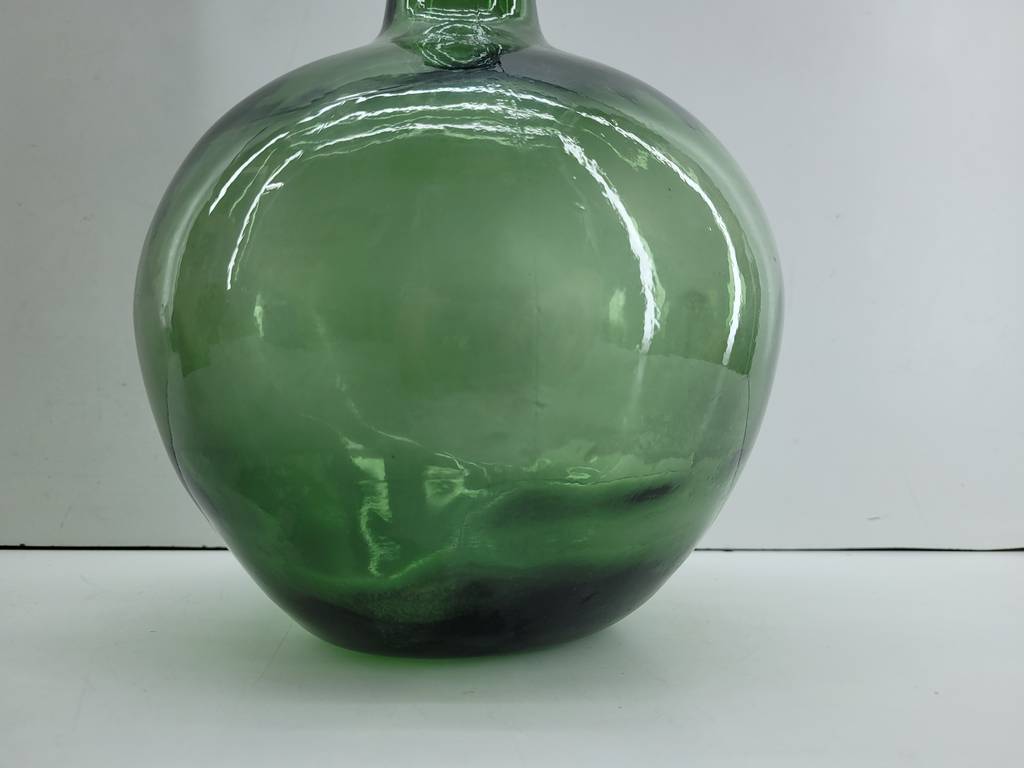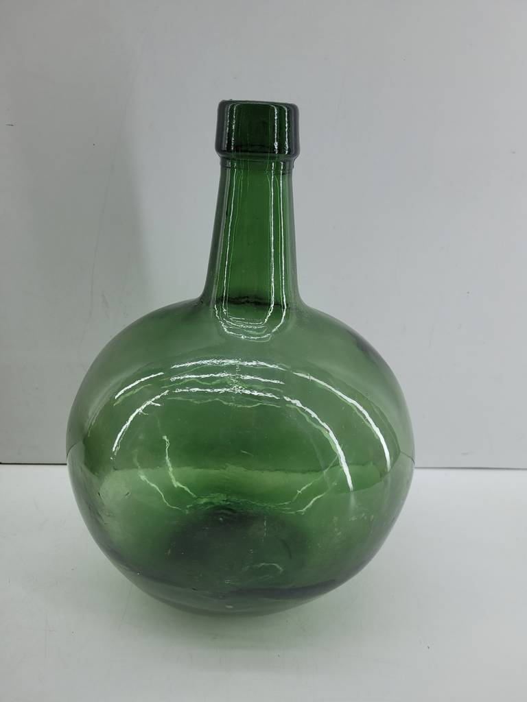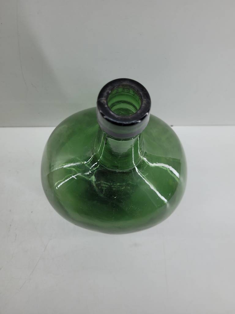 Damajuana fabricada en cristal grueso y resistente de color verde oliva. Se trata de una botella de grandes dimensiones a la que se la conoce con el nombre de damajuana. Es una botella que tiene una buena capacidad de almacenaje y cuenta con una base amplia y redonda y un cuello estrecho. Como se puede observar en las fotografías se encuentra en buenas condiciones.