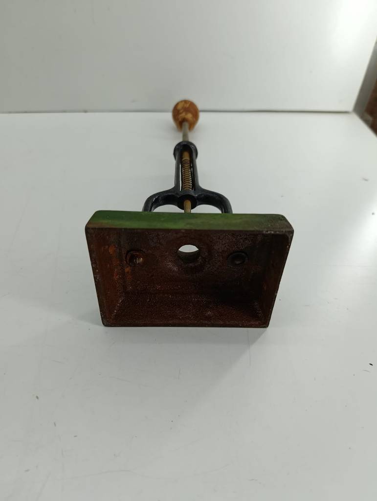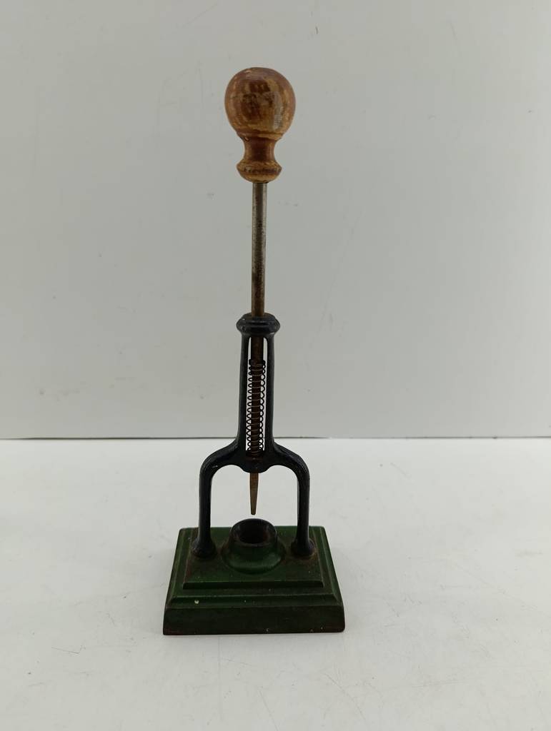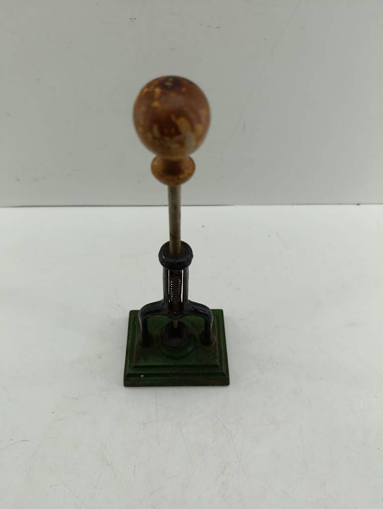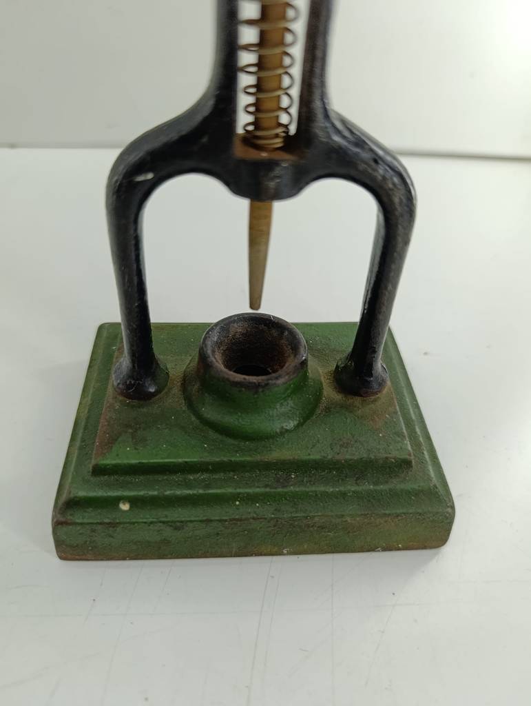 Deshuesador de aceitunas o cerezas de color verde oscuro. Se trata de un aparato deshuesador de aceitunas o cerezas que cuenta con una base sólida y cuadrangular y tiene un mango cómodo para cogerlo y apretar para deshuesar aceitunas o cerezas. Como se puede observar en las fotografías se encuentra en buenas condiciones para ser utilizado.