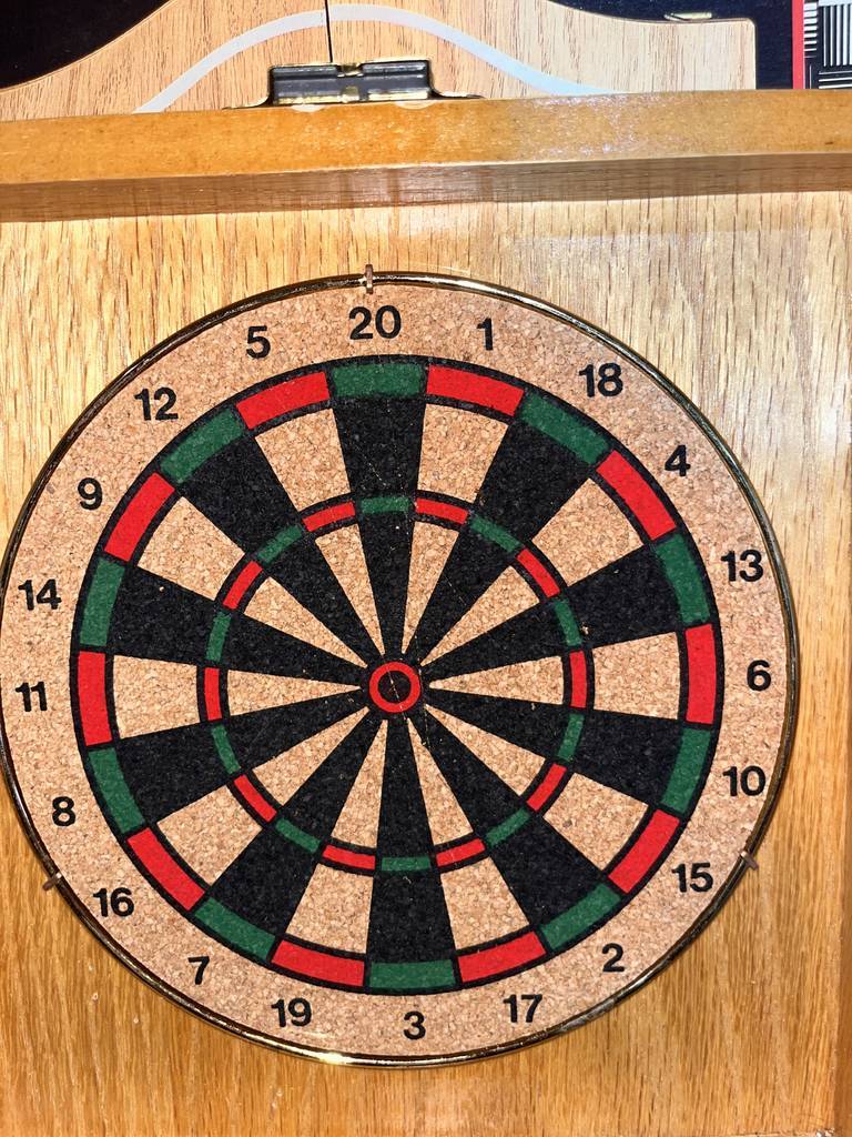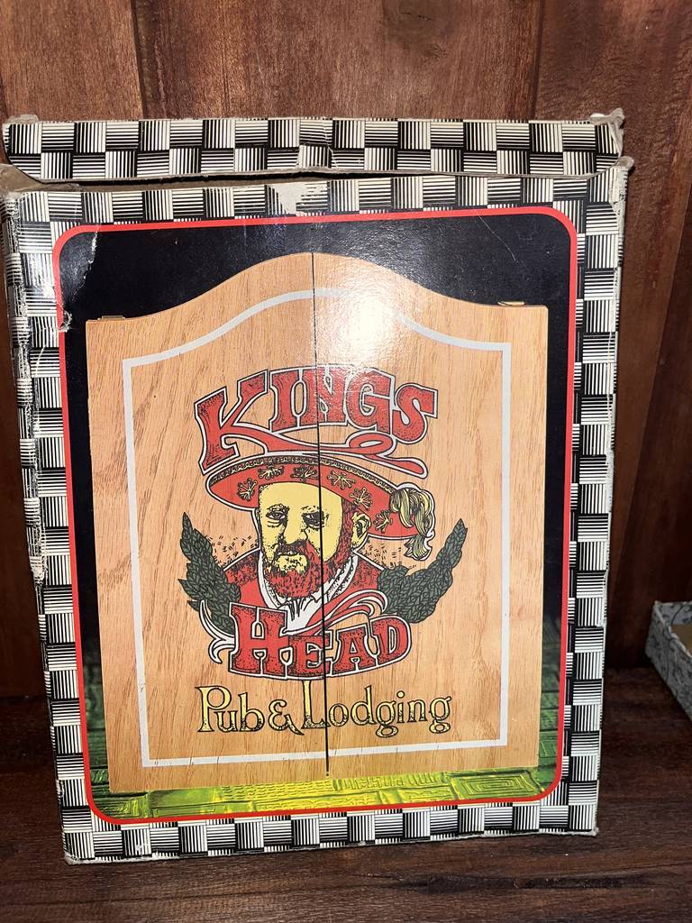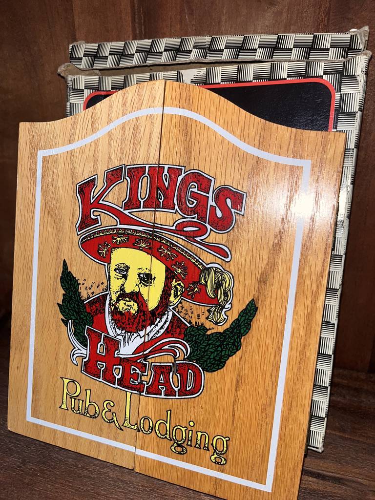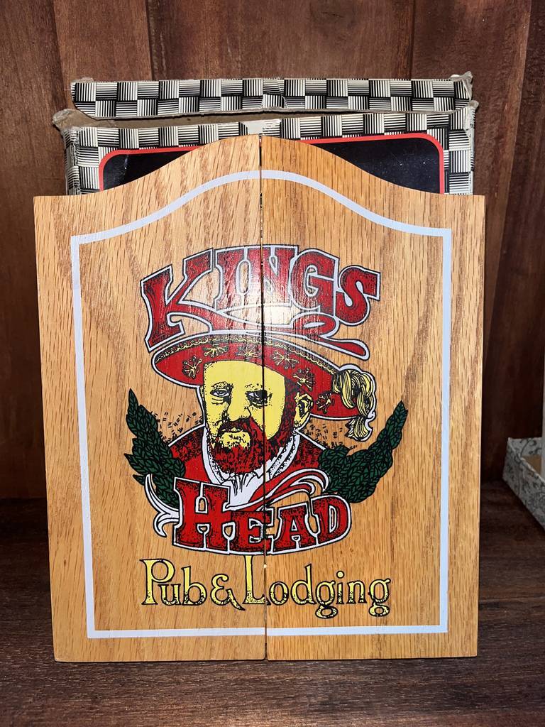 Diana de estilo vintage fabricada en madera de buena calidad de color marrón claro. Se trata de una diana que se abre y se cierra gracias a unas bisagras con las que cuenta y se lleva escrito en la parte exterior Kings Head pub y lodging. Es una diana que va acompañada de varios dardos, por lo que se puede jugar sin problemas. Como se ve en las imágenes está en buen estado.