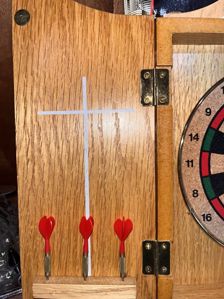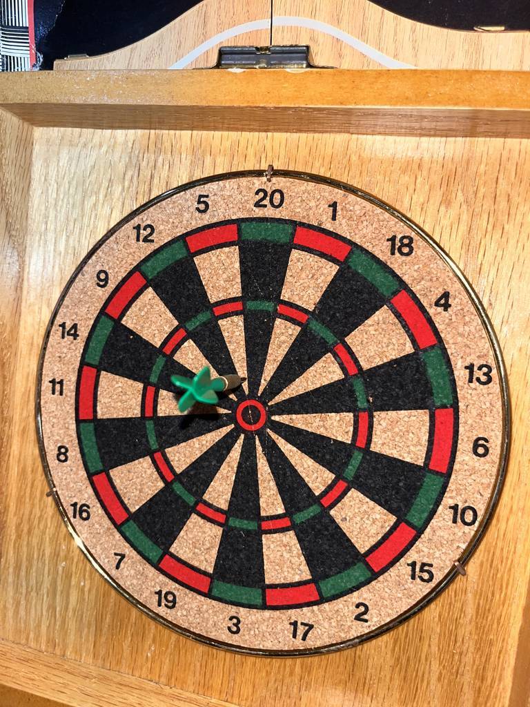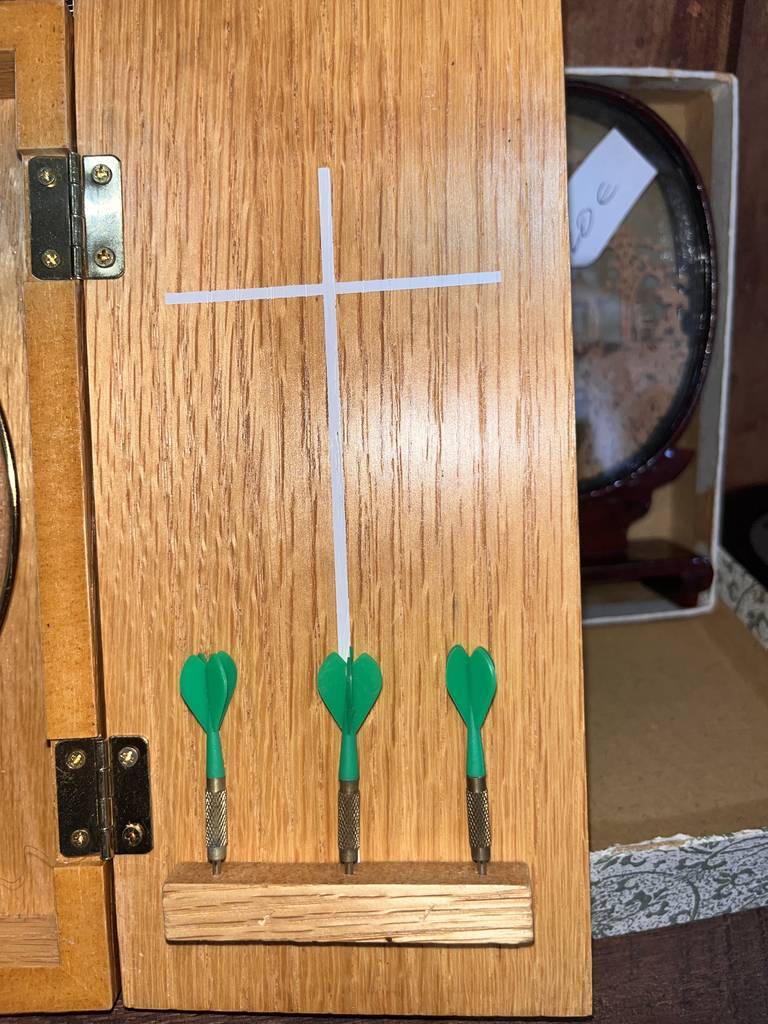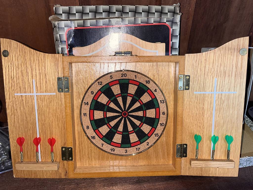 Diana de estilo vintage fabricada en madera de buena calidad de color marrón claro. Se trata de una diana que se abre y se cierra gracias a unas bisagras con las que cuenta y se lleva escrito en la parte exterior Kings Head pub y lodging. Es una diana que va acompañada de varios dardos, por lo que se puede jugar sin problemas. Como se ve en las imágenes está en buen estado.