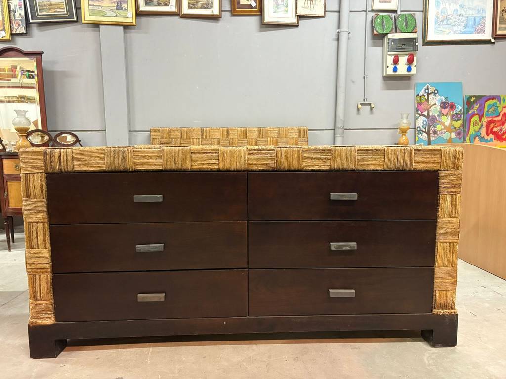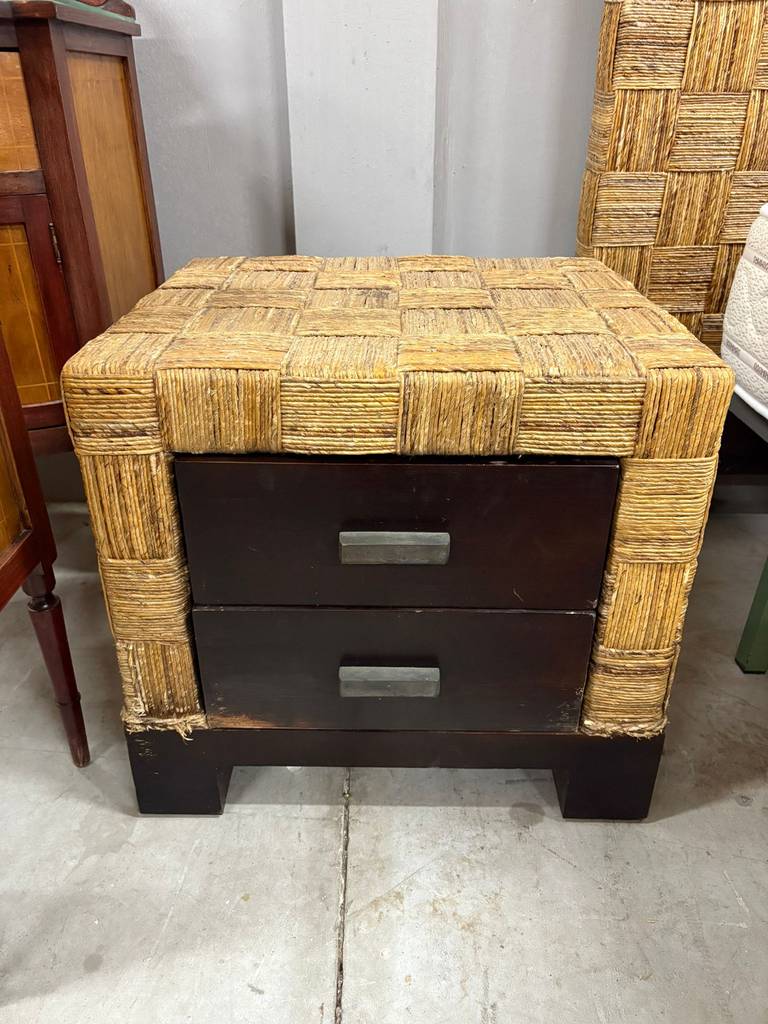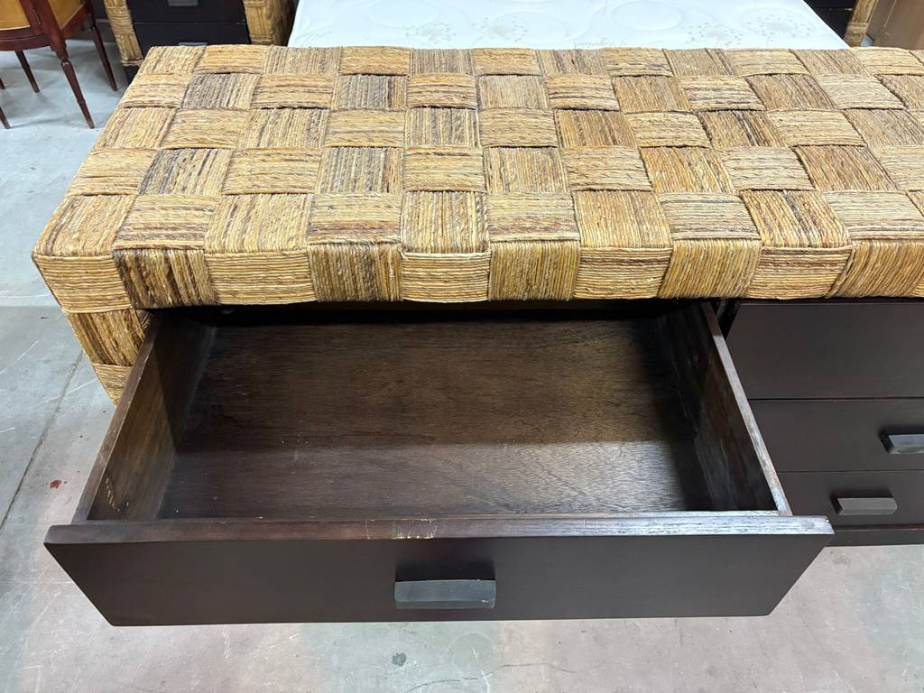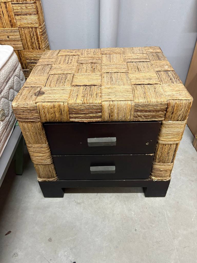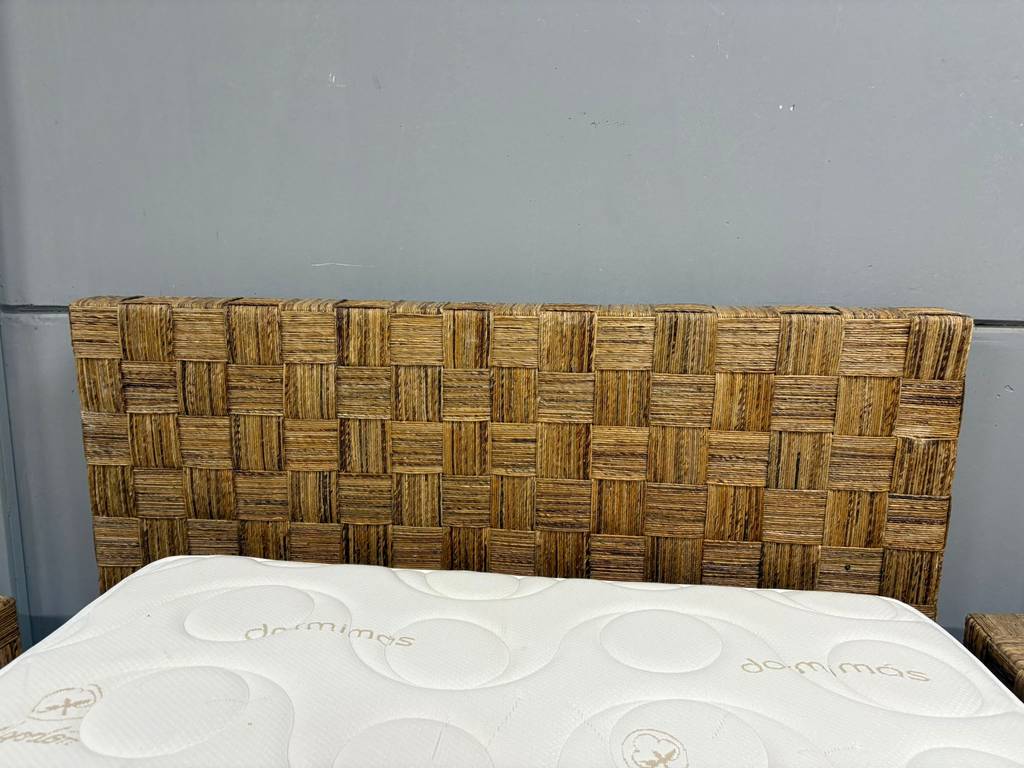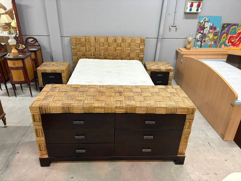 Dormitorio completo muy original realizado con madera y yute de buenas calidades. Se compone de un cabecero, dos mesitas y una cómoda todo a juego. La cómoda y los cajones incorporan cajones para almacenar todo tipo de prendas. Como podemos observar en las fotografías presenta ligeros rasguños. Aprovecha esta oportunidad de aportar un toqué único y original a tu dormitorio.