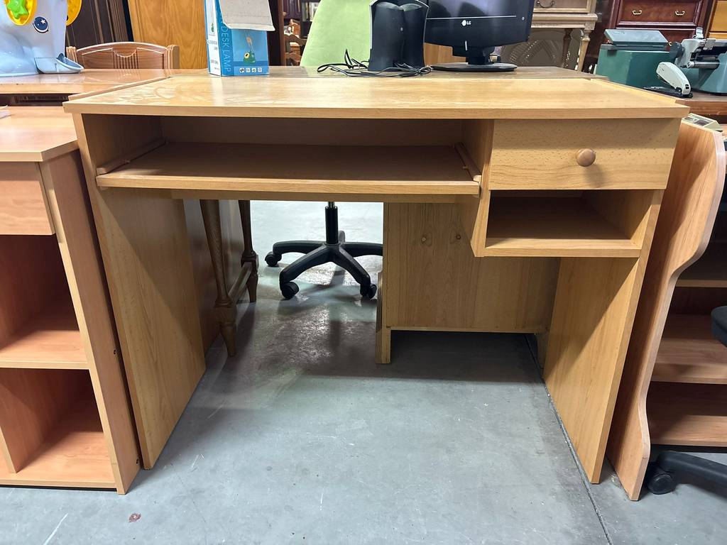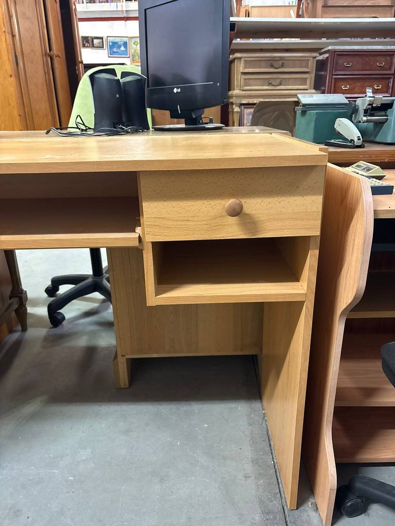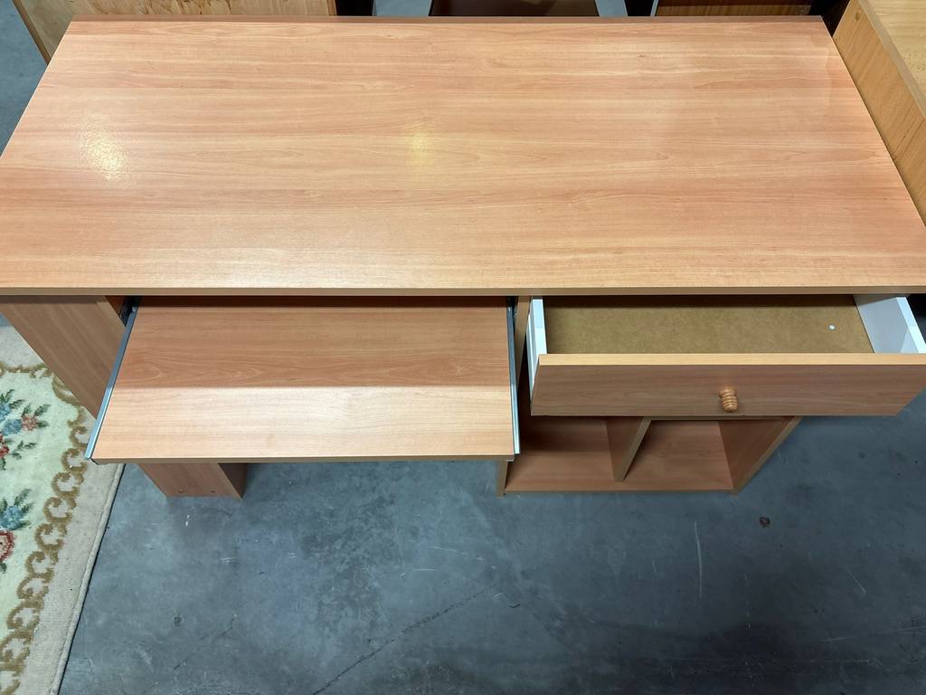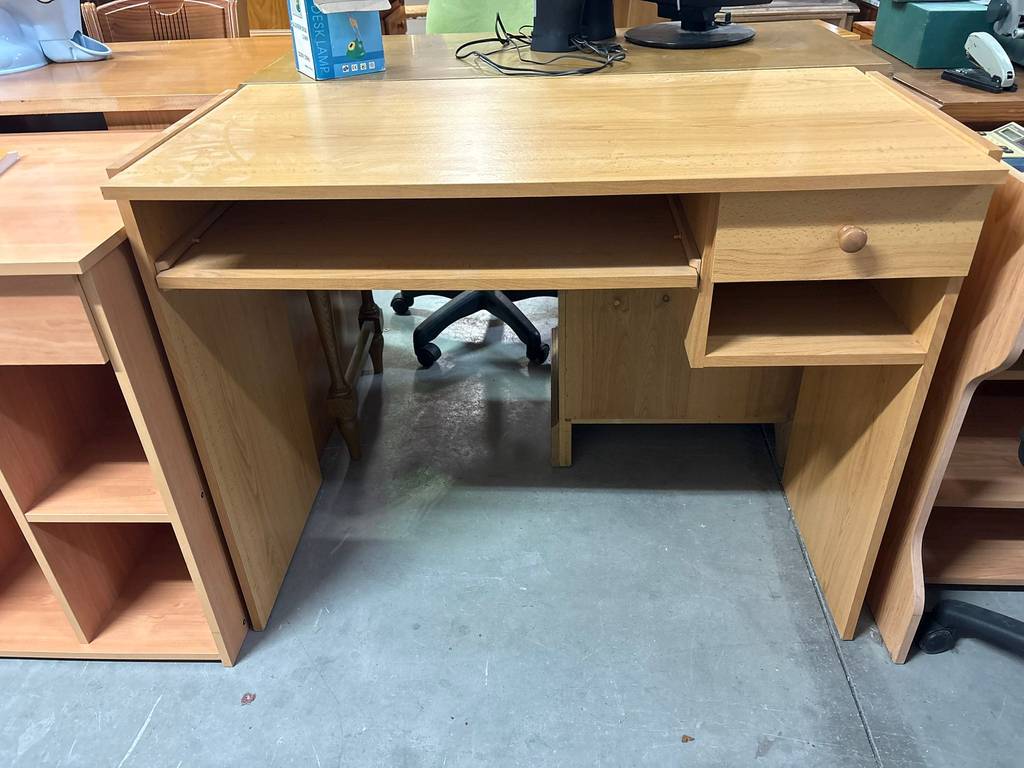 Escritorio fabricado en madera de buena calidad de color marrón claro. Se trata de un escritorio grande que cuenta con varios compartimentos para guardar objetos y tiene un cajón con un tirador esférico. Es un escritorio ideal para colocarlo en una habitación de estudio del hogar para estudiar o trabajar en él. Como se puede observar en las fotografías se encuentra en buenas condiciones.