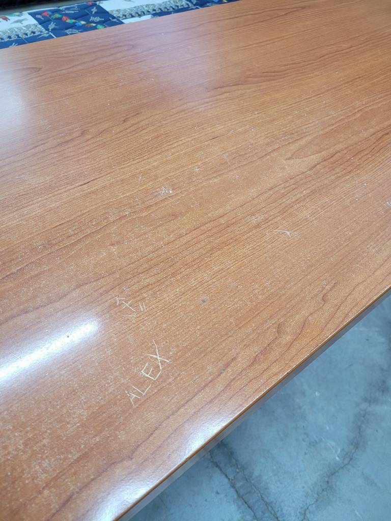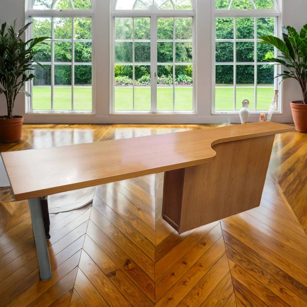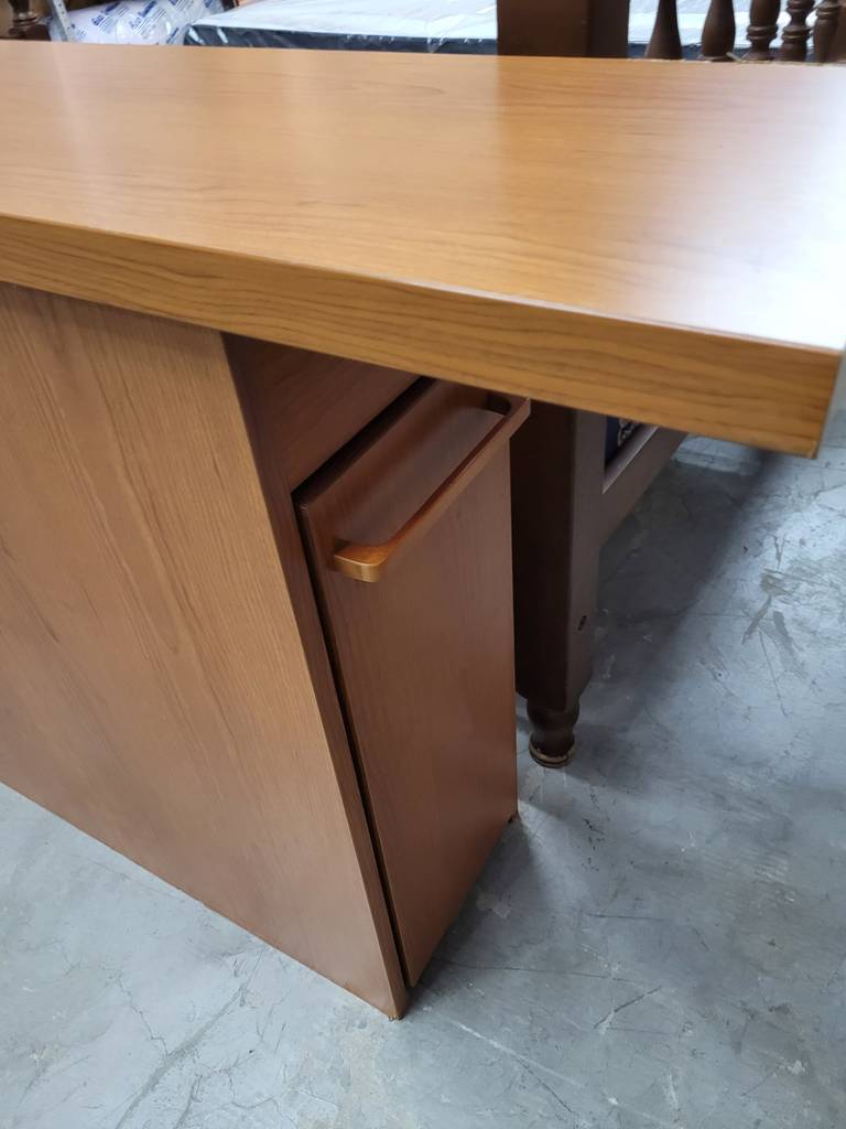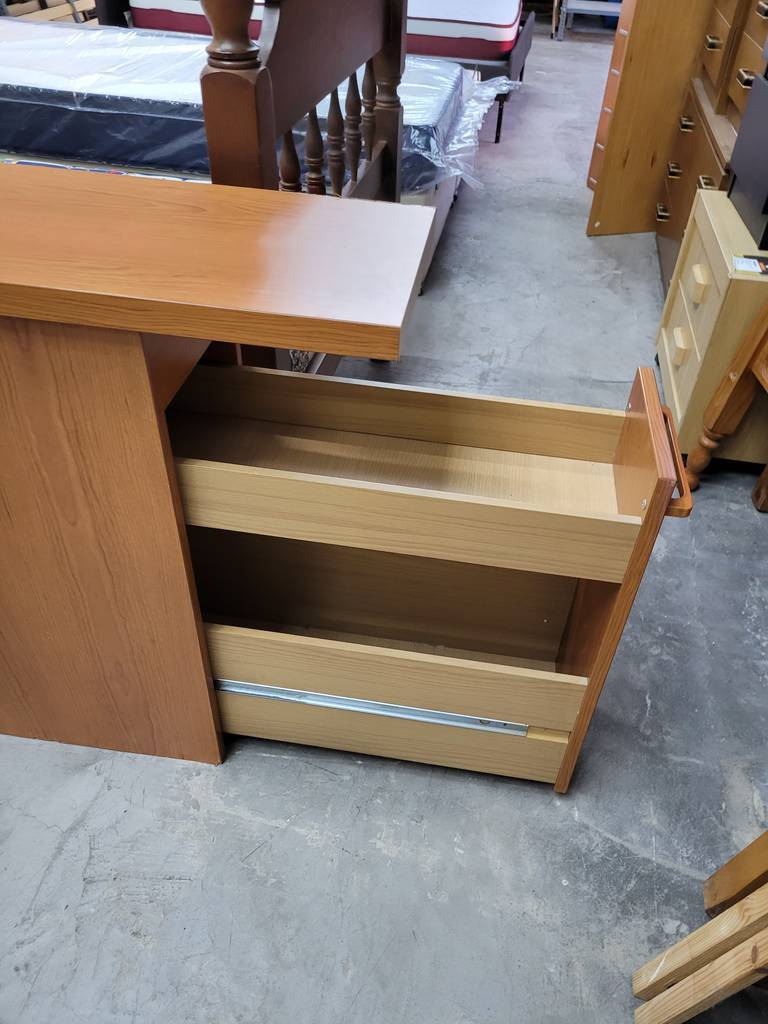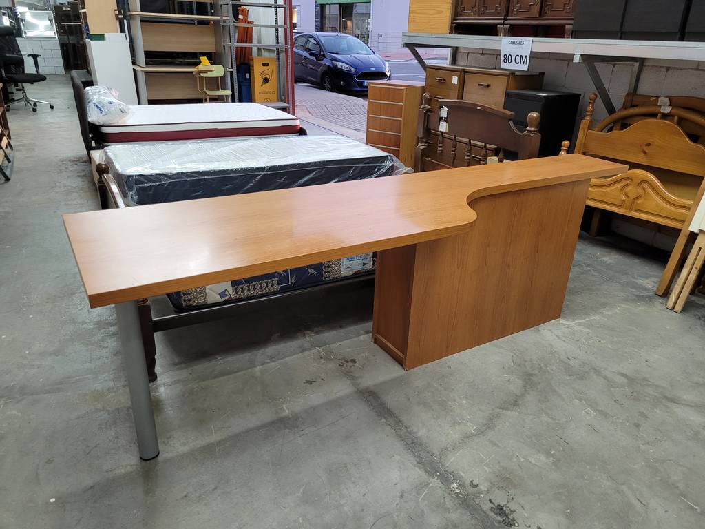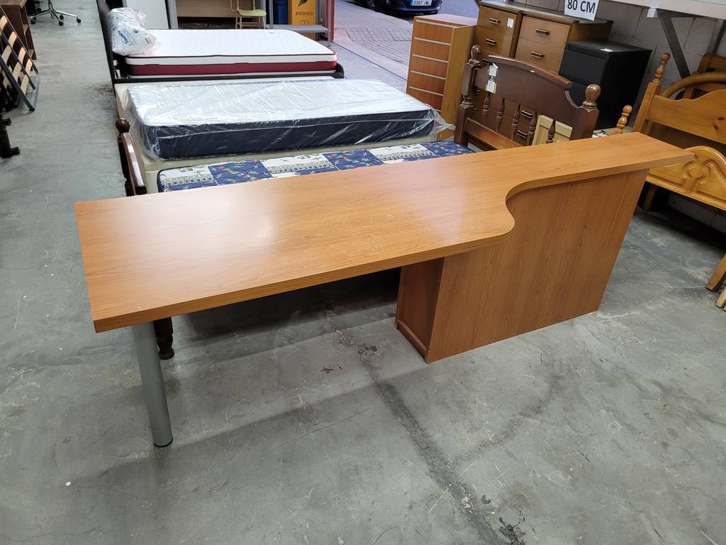Escritorio amplio que ha sido fabricado con madera de buena calidad y robusta. Se trata de un escritorio que incorpora en un lateral un cajón que nos puede servir, por ejemplo, de zapatero. Se abre con un asa frontal y está compuesto de dos cajones separados. Es un escritorio ideal para un estudio o despacho. Como podemos observar en las fotografías presenta rasguños.