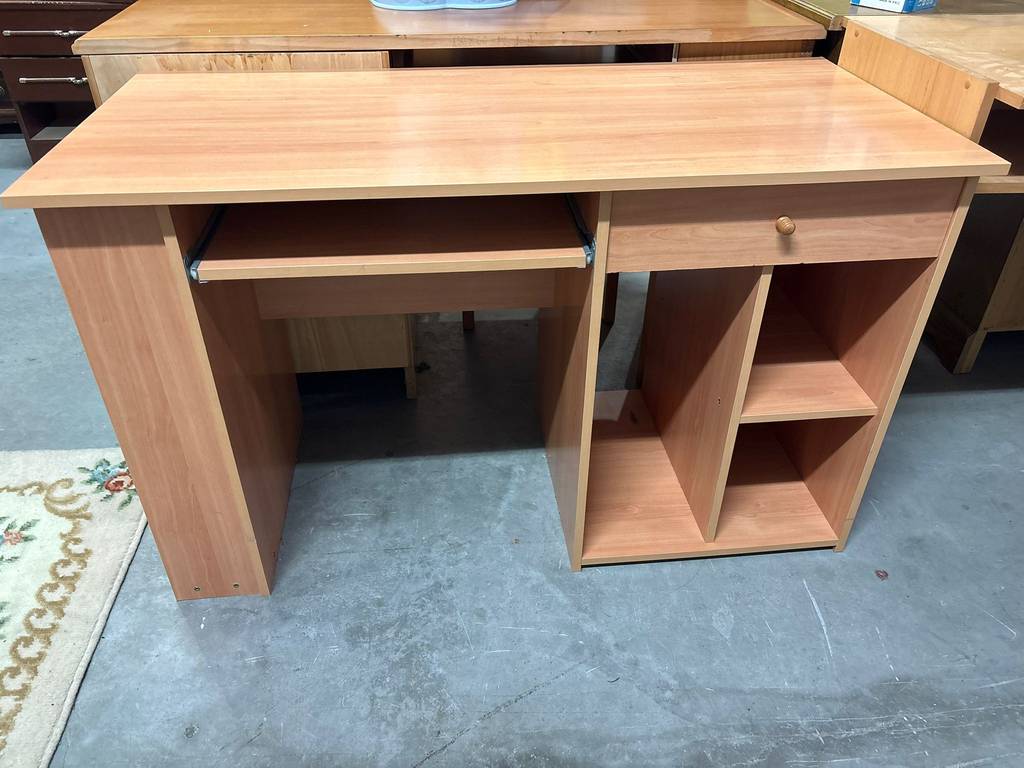 Escritorio fabricado en madera de buena calidad de color marrón claro. Se trata de un escritorio grande que cuenta con varios compartimentos para guardar objetos y tiene un cajón con un tirador esférico. Es un escritorio ideal para colocarlo en una habitación de estudio del hogar para estudiar o trabajar en él. Como se puede observar en las fotografías se encuentra en buenas condiciones.