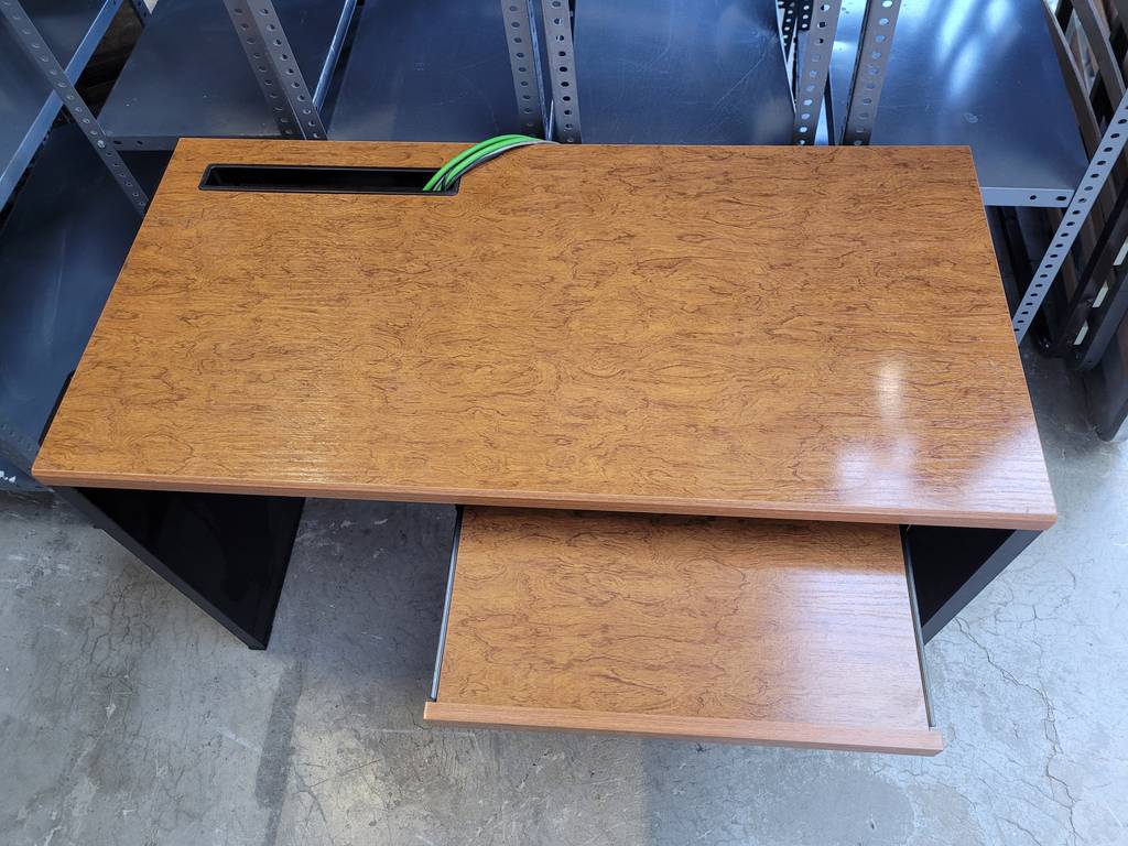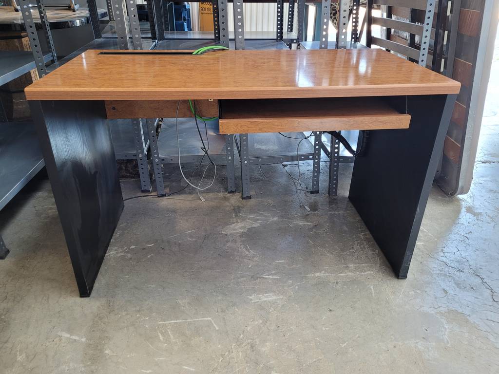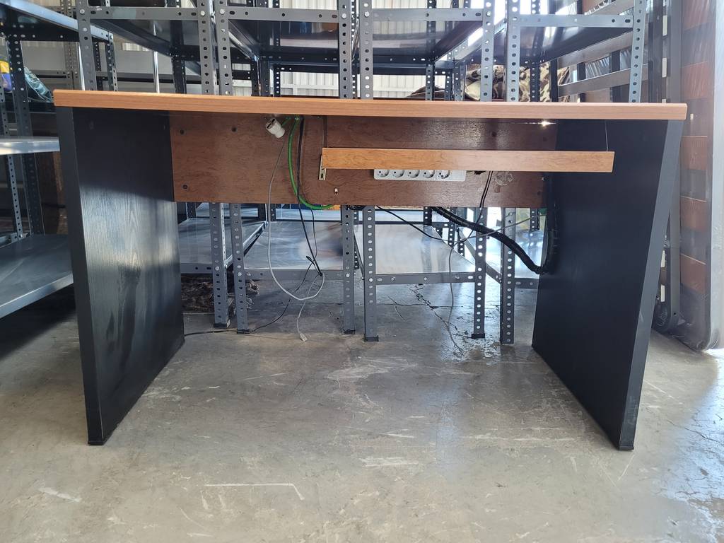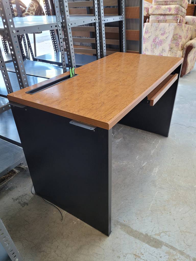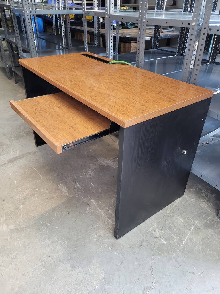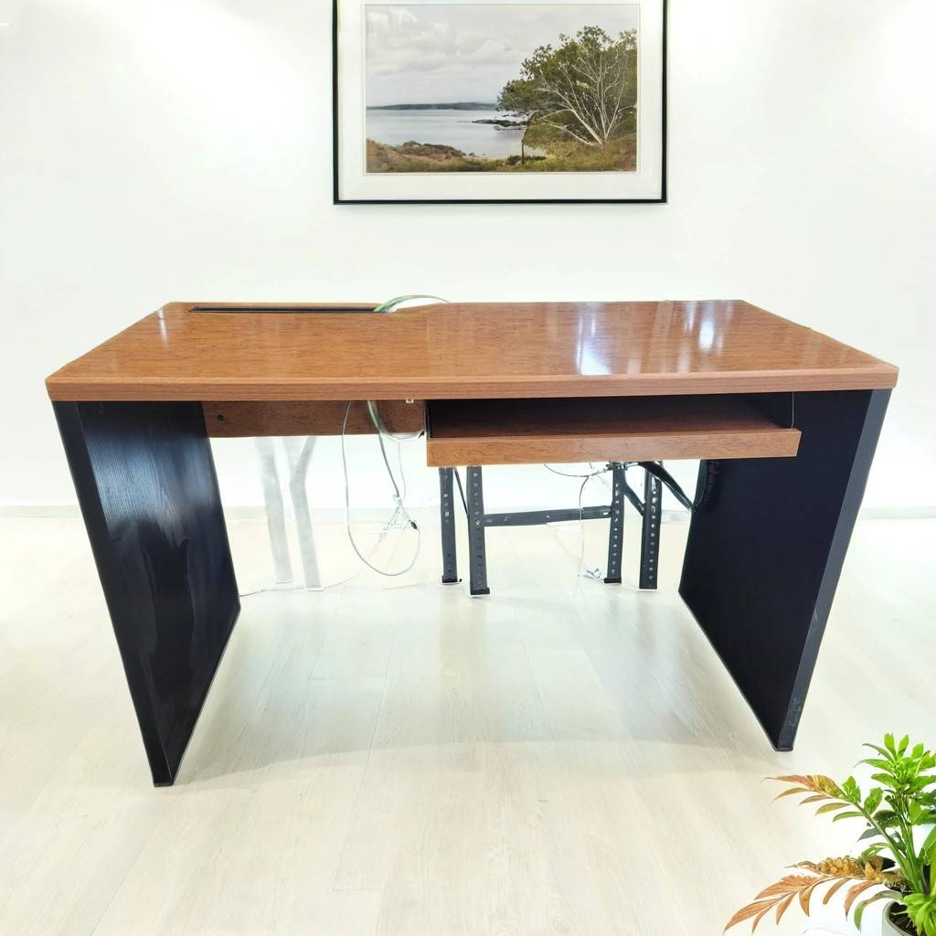 Escritorio moderno y actual fabricado en madera de buena calidad de color marrón claro y negro. Se trata de una mesa de escritorio que tiene una superficie amplia con una forma rectangular y cuenta con una bandeja inferior que se desliza para poner el teclado del ordenador. Es una mesa perfecta para utilizarla para estudiar o trabajar. Como se puede observar en las fotografías se encuentra en buenas condiciones.