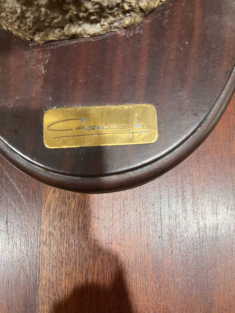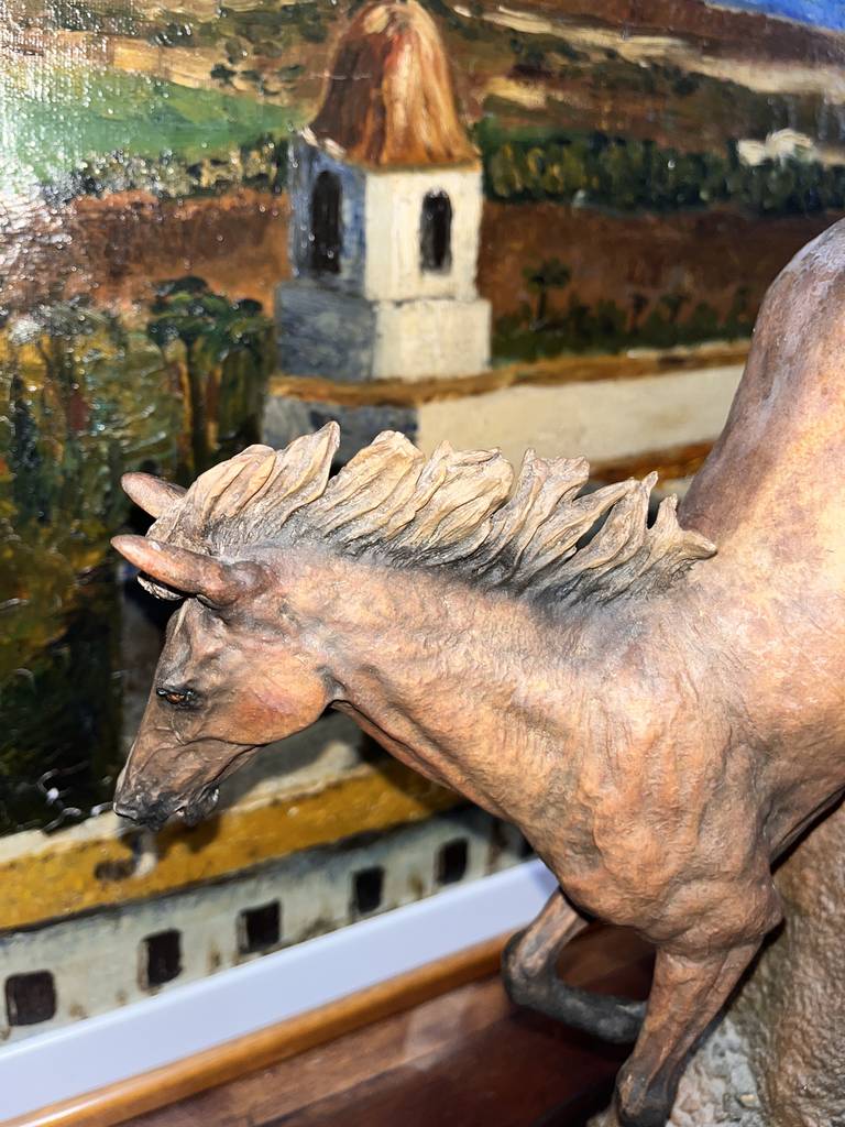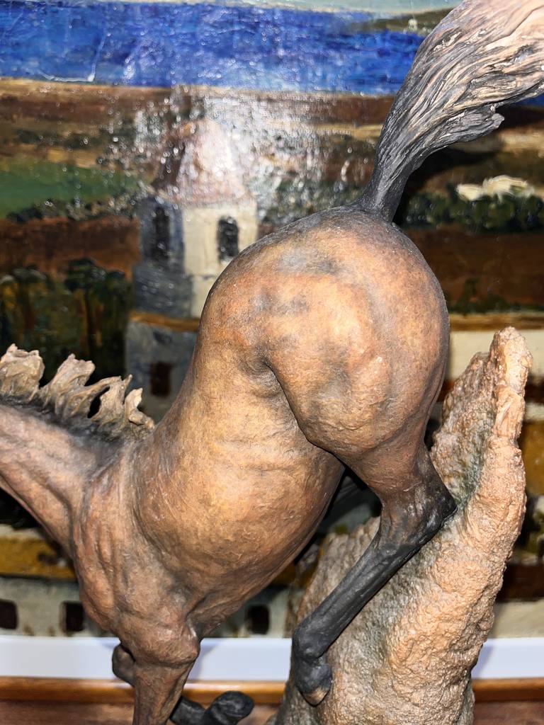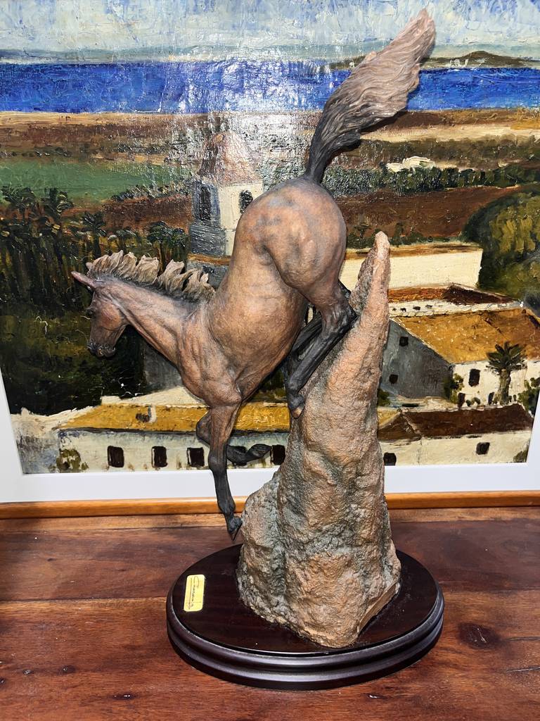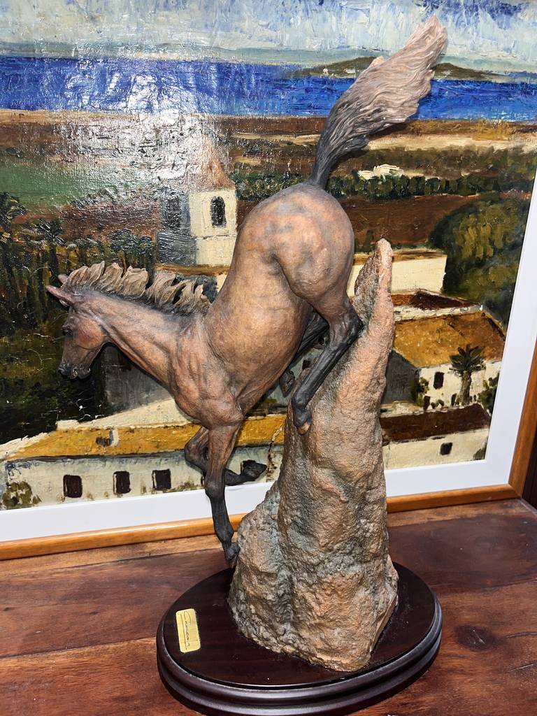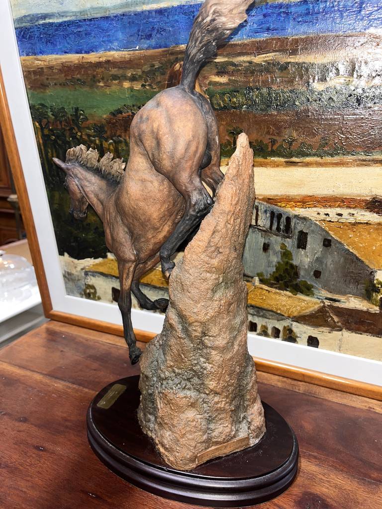 Escultura fabricada en resina de buena calidad del famoso escultor José Luis Casasola. Se trata de una bella escultura en la que aparece un caballo descendiendo una montaña sobre una peana de madera con una forma circular. Es una figura muy bonita perfecta para colocarla en un salón comedor a modo decorativo. Como se puede observar en las fotografías se encuentra en buenas condiciones.