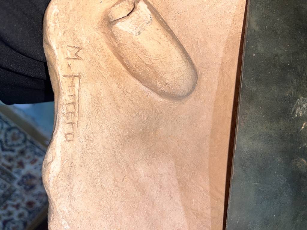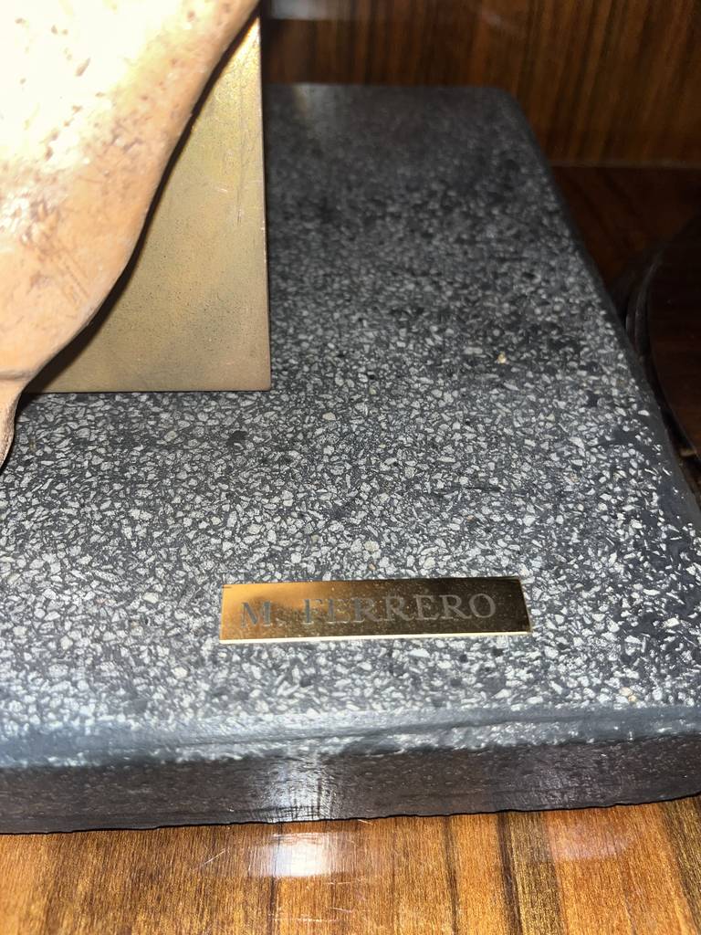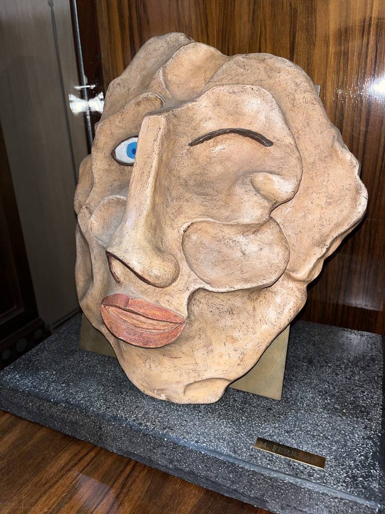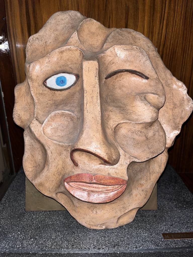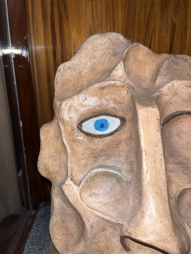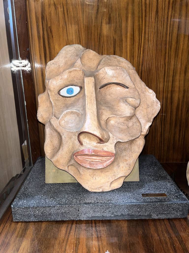 Escultura realizada por el reconocido escultor alicantino Manuel Ferrero. Se trata de una escultura muy llamativa y original que cuenta con una base robusta y rectangular para sostener la escultura que tiene una forma de una cara con un ojo abierto y el otro cerrado. Es una escultura perfecta para ponerla encima de una cómoda en un salón comedor. Como se puede observar en las fotografías se encuentra en buenas condiciones.