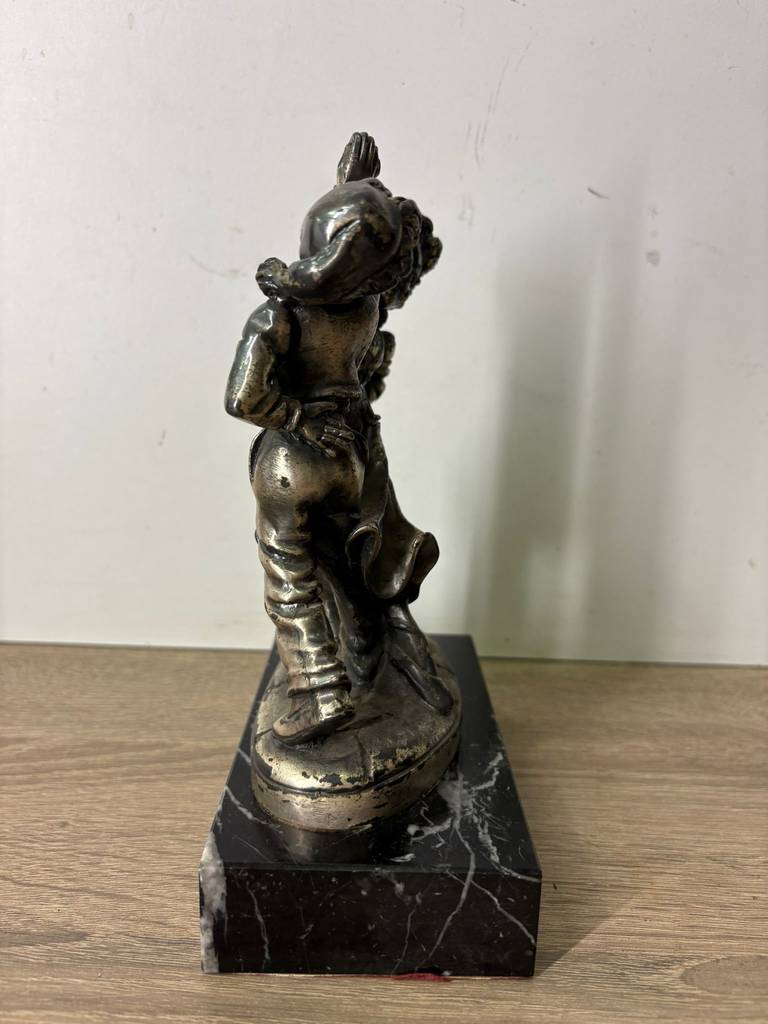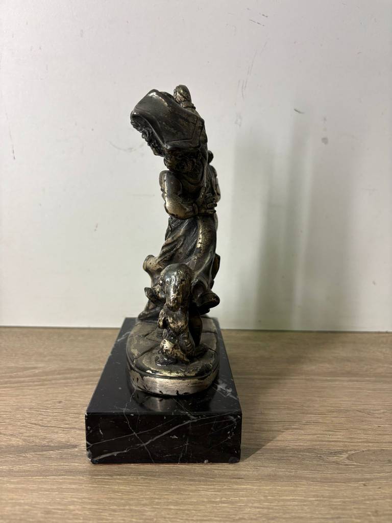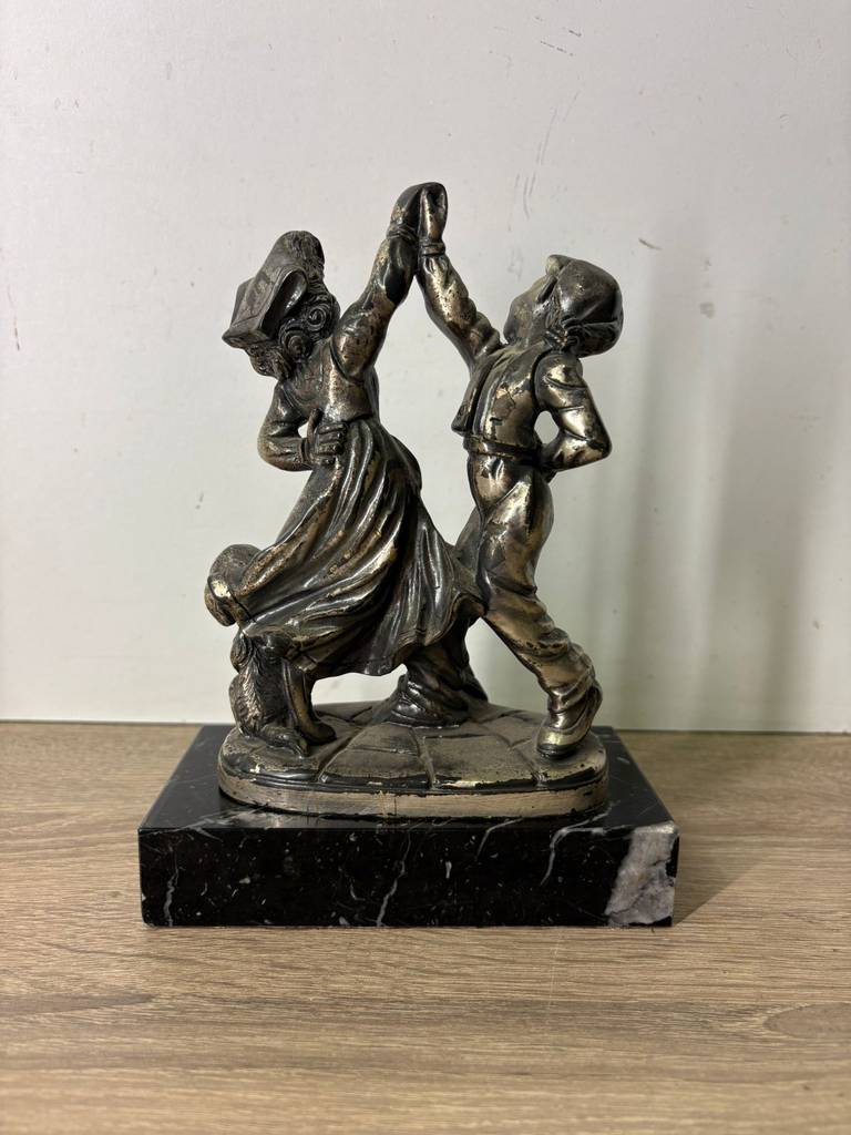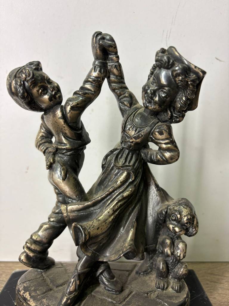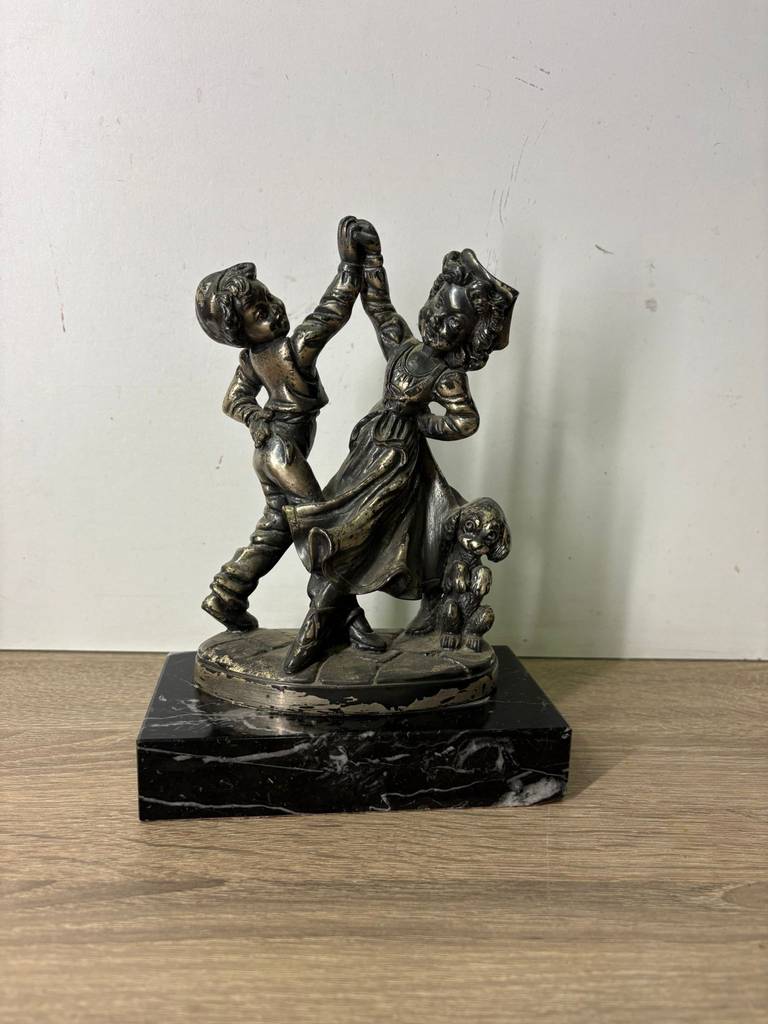Escultura de dos niños de la época jugando con sus manos en alto y entrelazadas, en la parte inferior un pequeño perro sobre dos patas observandolos. Se trata de una figura muy bonita y original que quedará ideal en cualquier estancia de nuestra casa, en especial en un salón comedor o recibidor. Como podemos observar en las fotografías se encuentra en buenas condiciones.