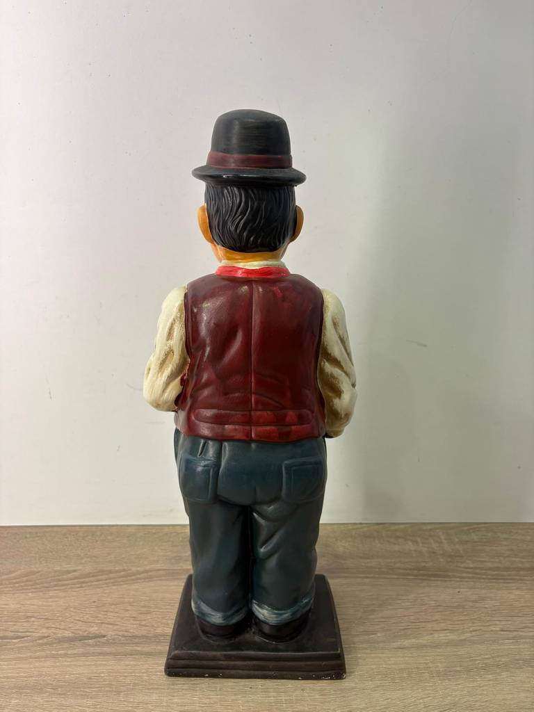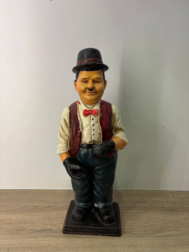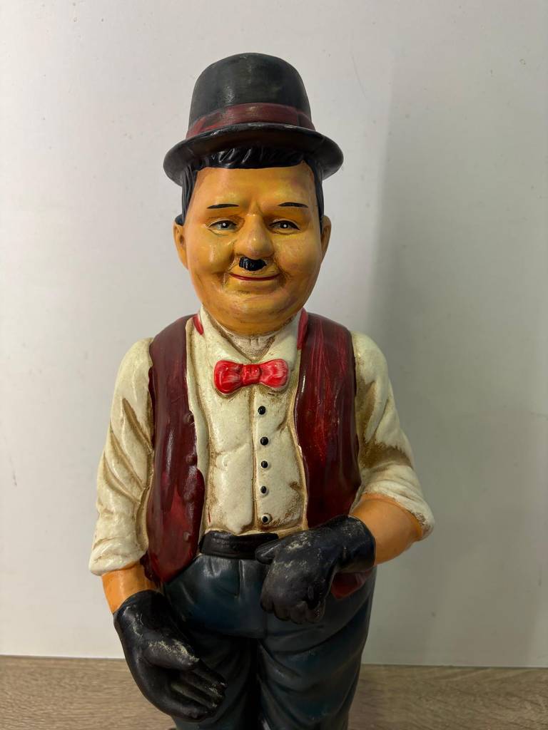 Escultura de Oliver Hardy que ha sido realizada con buenos materiales y posteriormente cincelada con mucha precisión y detalle. Es una escultura ideal para coleccionistas o amantes del actor. También para exponerla en un salón comedor o recibidor. Como podemos observar en las fotografías se encuentra en buenas condiciones y lista para ser colocada.