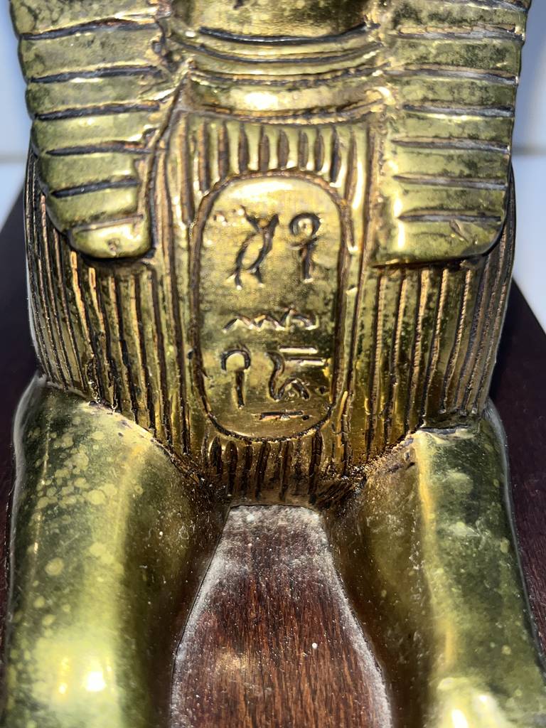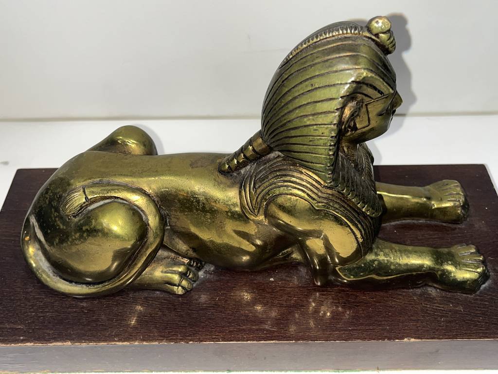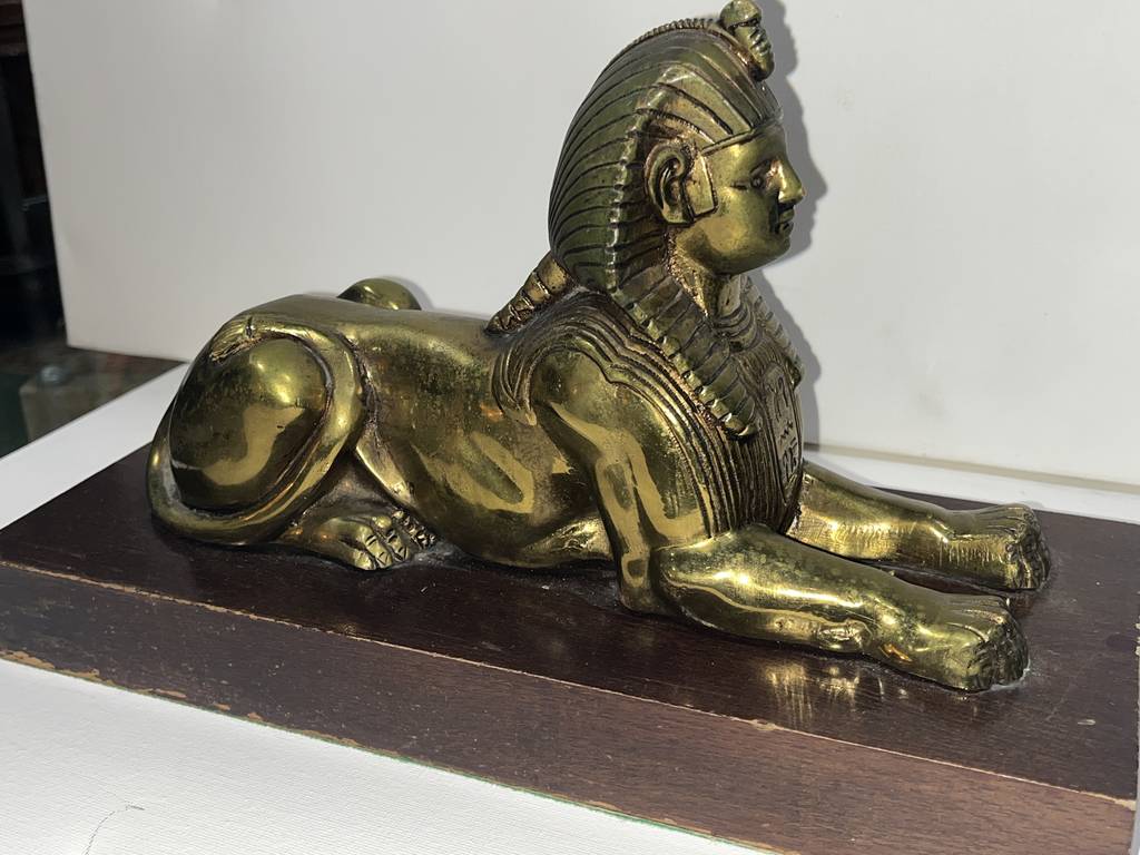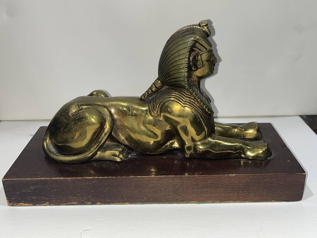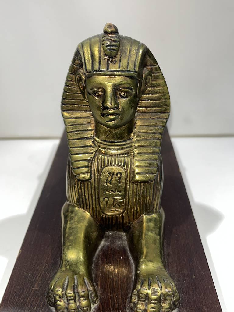Esfinge egipcia realizada en bronce brillante sobre una base de madera robusta y gruesa. Es una figura que realzará y aportará elegancia a cualquier estancia de nuestra casa, en especial el salón comedor o el recibidor. Como podemos observar en las fotografías la base presenta ligeros rasguños, pero en general se encuentra en buenas condiciones.