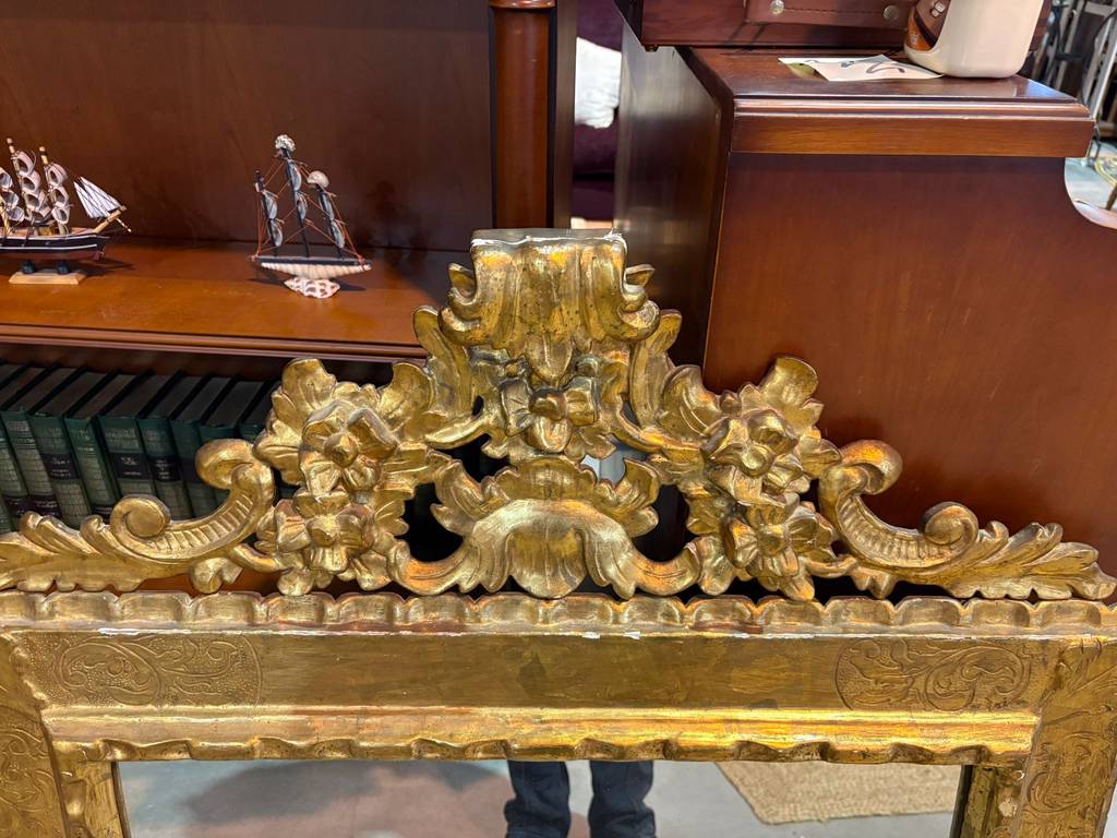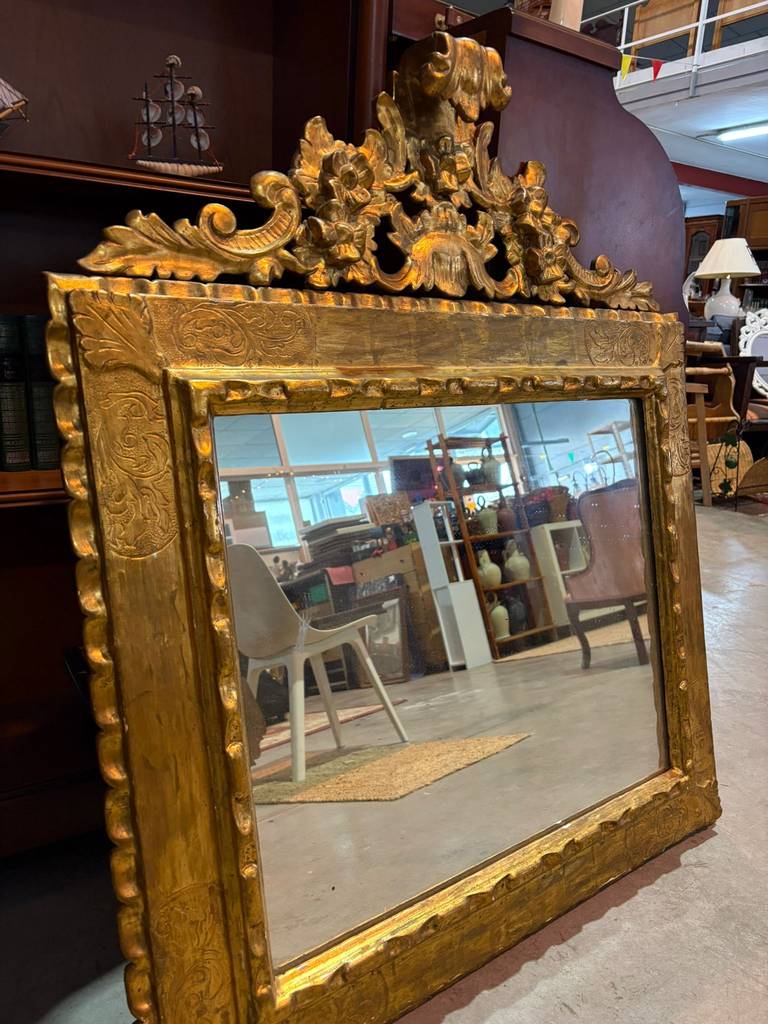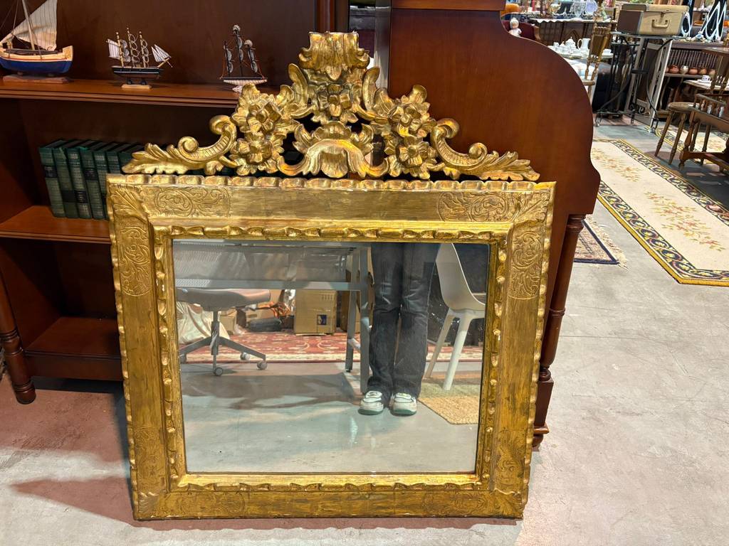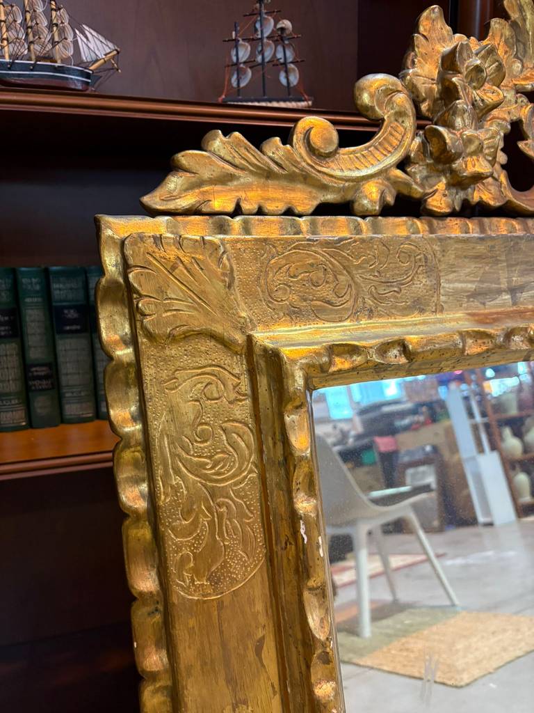 Espejo de estilo francés muy bonito y elegante con forma cuadrada que está enmarcado con un marco de madera de buena calidad y con una parte superior con flores talladas que lo hará resaltar. Es ideal para colocar en un recibidor o un salón comedor. Como podemos observar en las fotografías se encuentra en buenas condiciones.