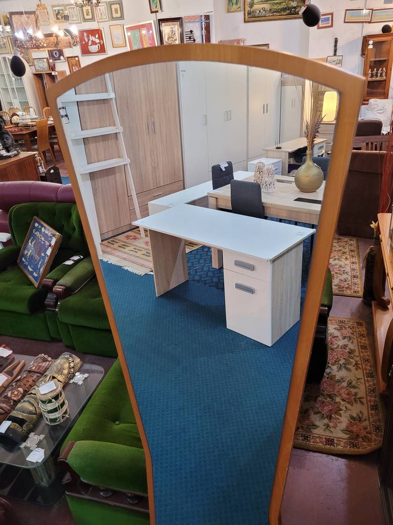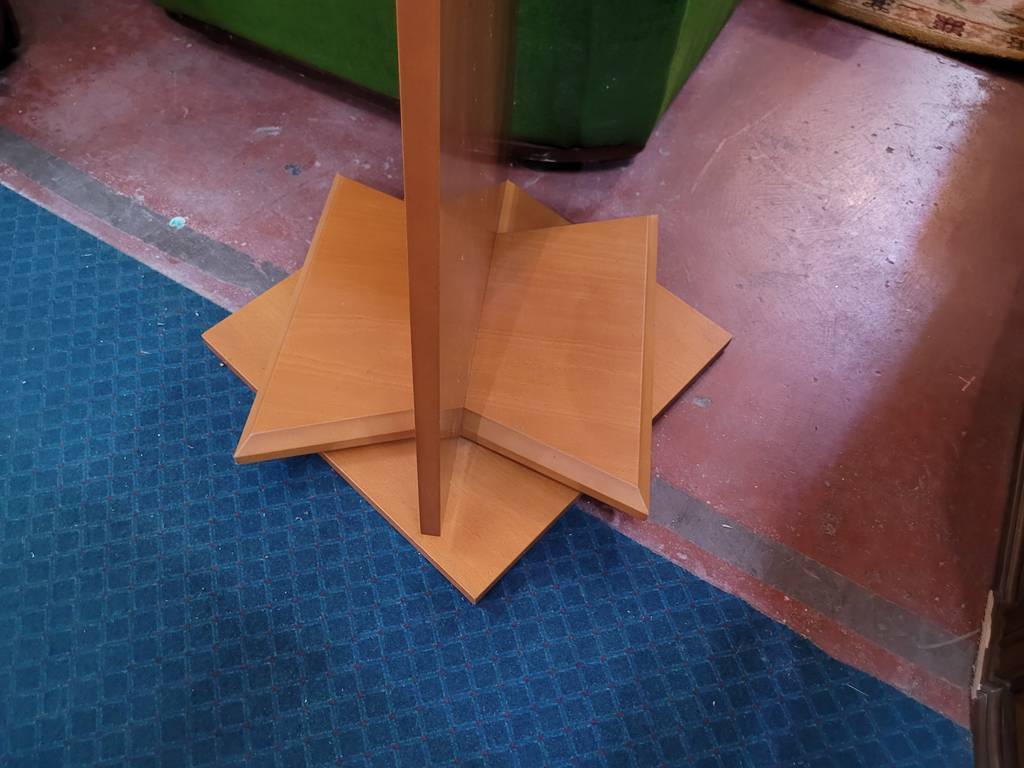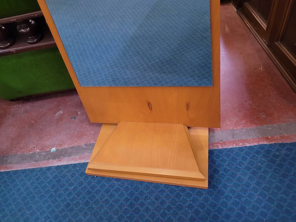 Espejo de pie giratorio con perchero incorporado fabricado en madera de buena calidad y robusta de color marrón oscuro. Se trata de un espejo de gran tamaño que tiene una forma vertical y rectangular con el centro formando una esquina interior. Es un espejo elegante ideal para ponerlo en un salón comedor. Como se puede observar en las fotografías se encuentra en buenas condiciones.