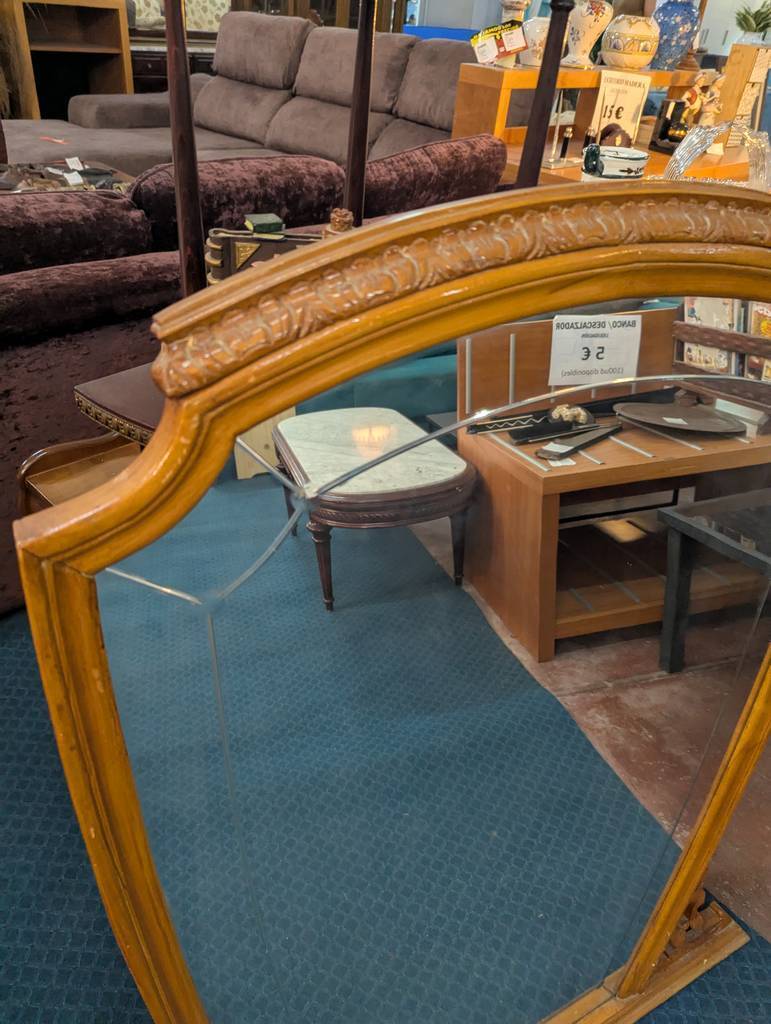 Espejo de estilo clásico para cómoda con un elegante marco de madera de buena calidad de color marrón claro. Se trata de un espejo de gran tamaño que cuenta con una base recta y tiene una parte superior curvada. Es un espejo ideal para ponerlo encima de una cómoda y completar de esta manera el mueble. Como se puede observar en las fotografías se encuentra en buenas condiciones.