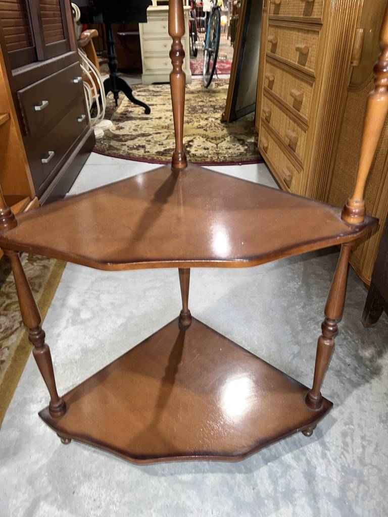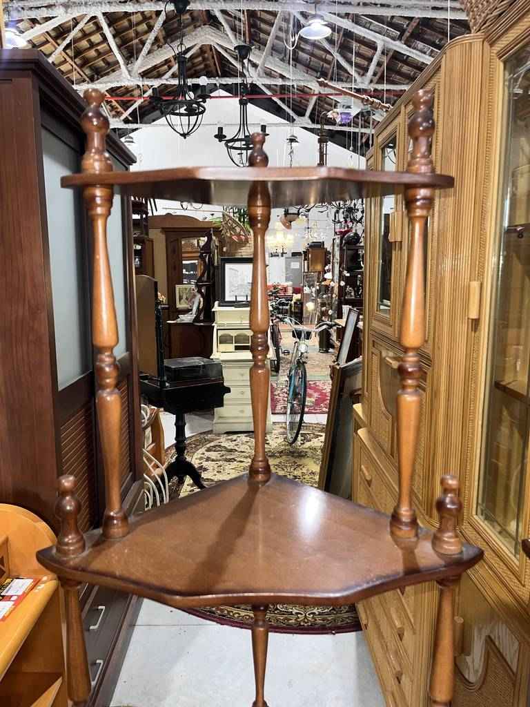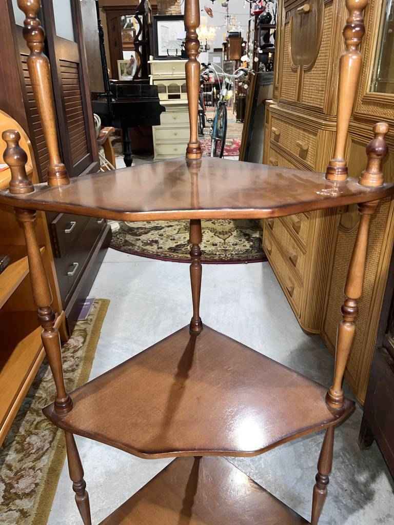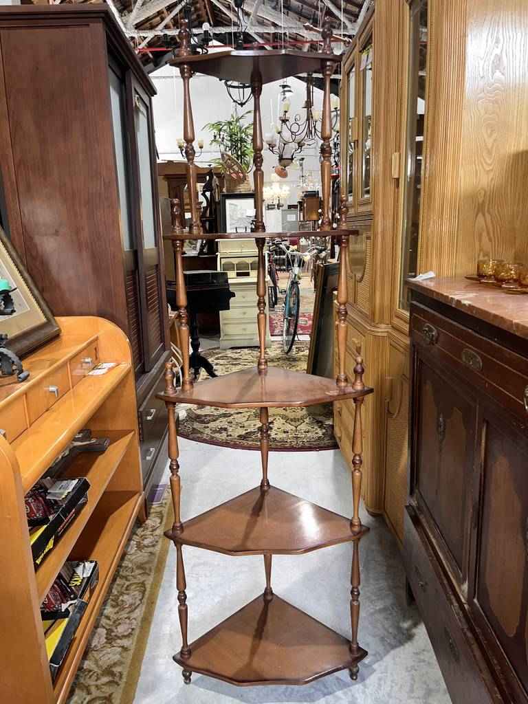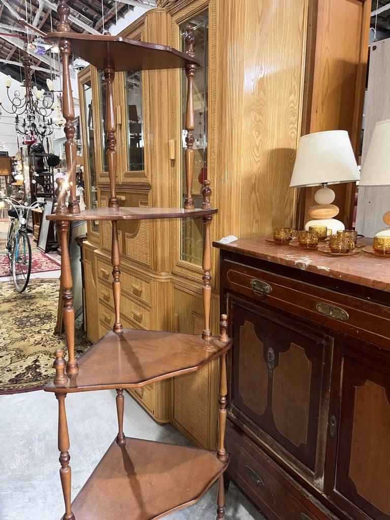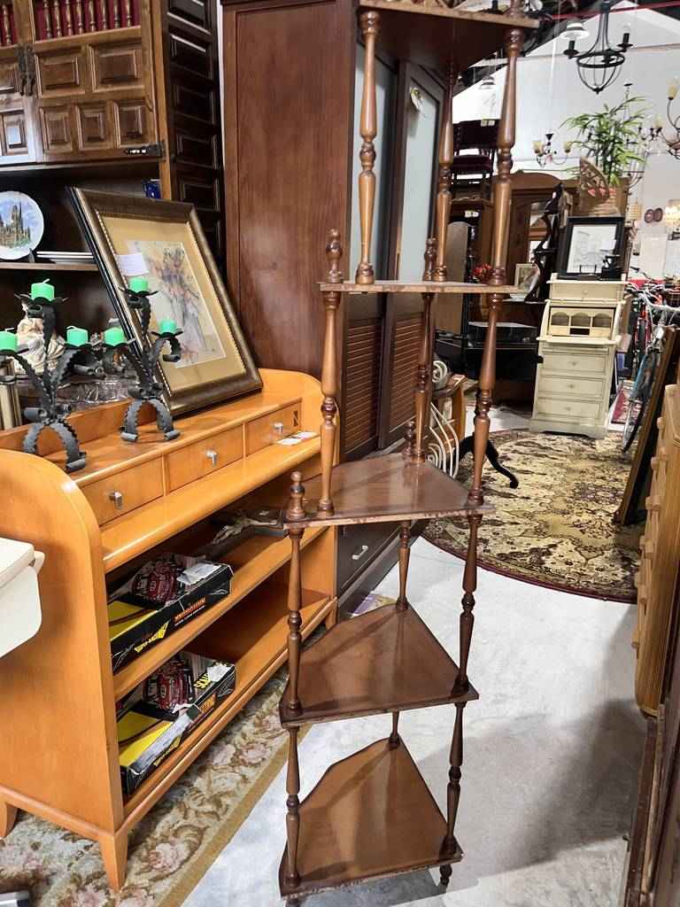 Estantería esquinera fabricada en madera de color marrón oscuro. Se trata de una estantería de talla alta que dispone de una forma especial que la hace ideal para colocarla en cualquier esquina del hogar. Tiene un total de cinco baldas unidas por finos listones de madera. Como se ve en las imágenes se encuentra en buenas condiciones para ser utilizada.