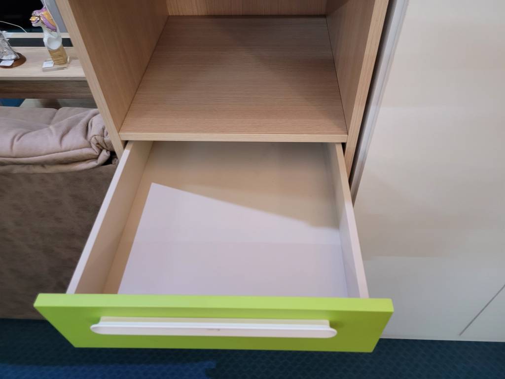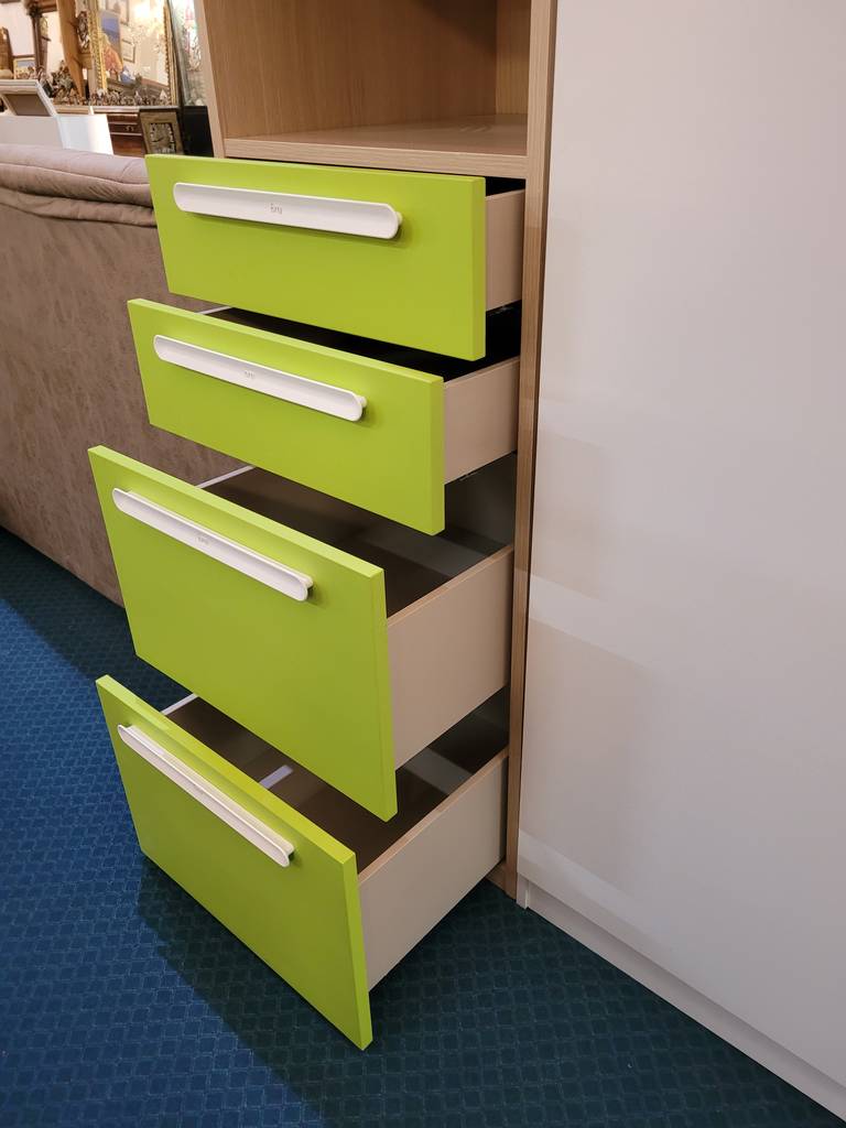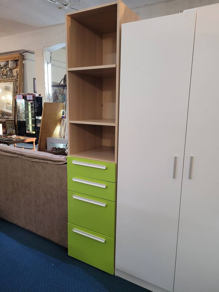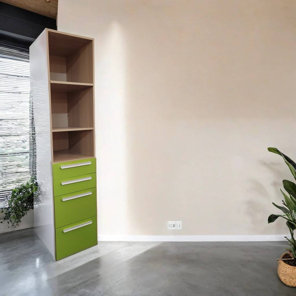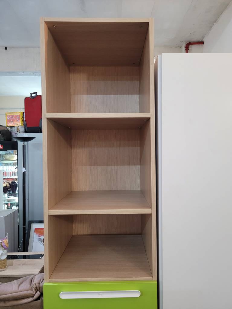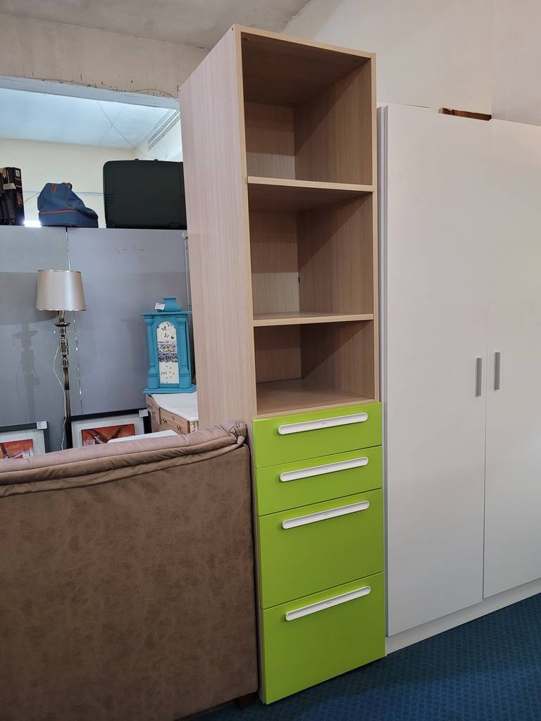 Estantería estrecha fabricada en madera de buena calidad de color marrón claro y verde pistacho. Se trata de una estantería que cuenta con cuatro cajones en la parte inferior y dos lejas con tres habitáculos en la parte superior. Es una estantería perfecta para ponerla en un estudio. Como se puede observar en las fotografías se encuentra en buenas condiciones