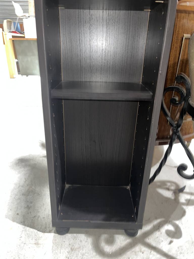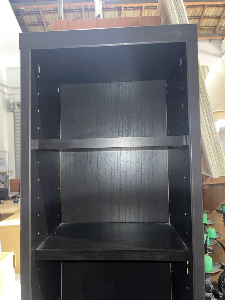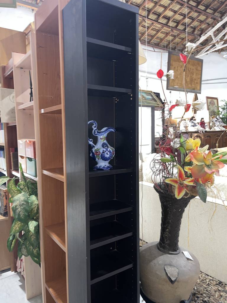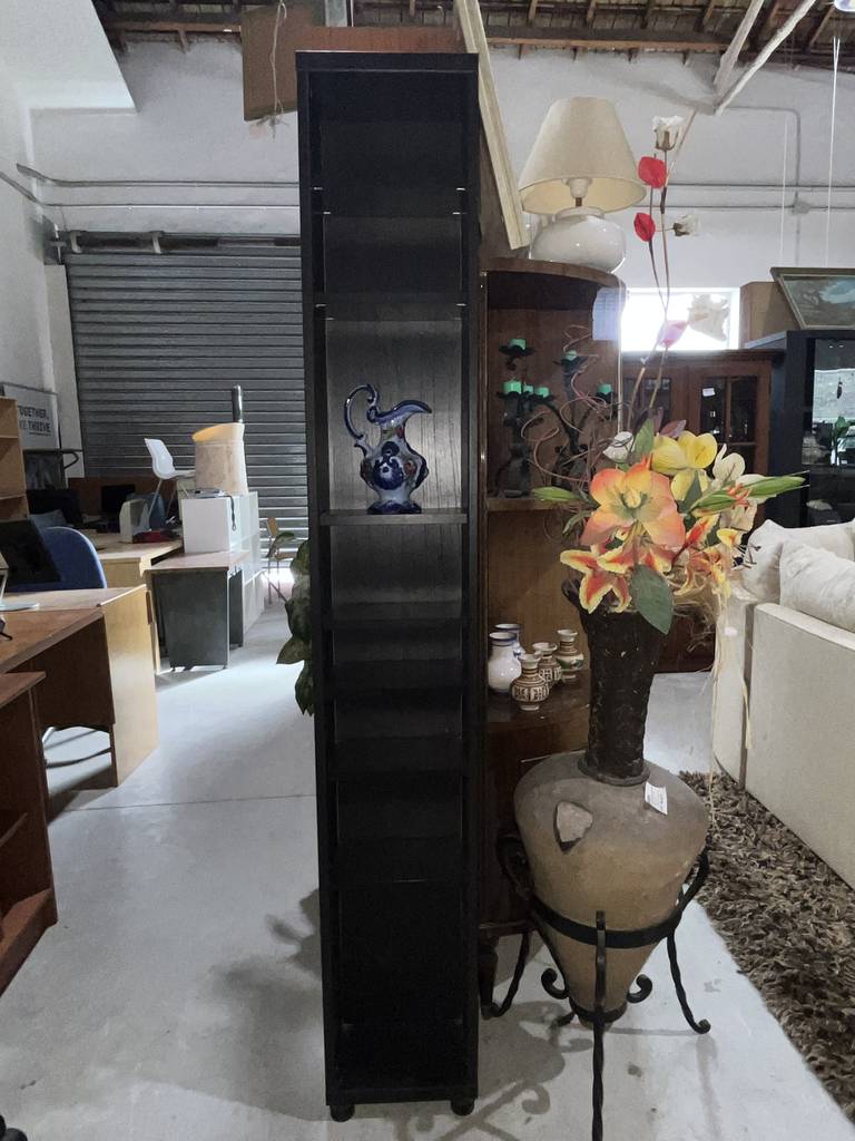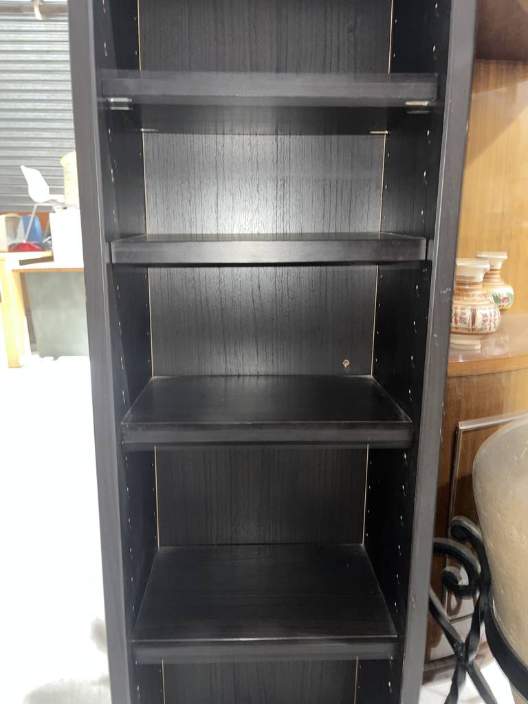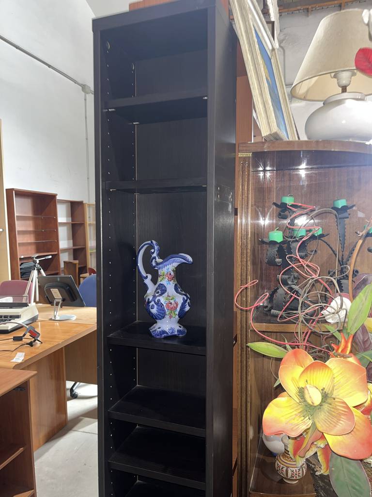Estantería estrecha de la reconocida tienda de muebles sueca Ikea de color negro. Se trata de una estantería alta y estrecha que cuenta con seis pequeños estantes ideales para colocar objetos o figuras de pequeño tamaño. Es una estantería perfecta para ponerla en un salón comedor. Como se puede observar en las fotografías se encuentra en buen estado.