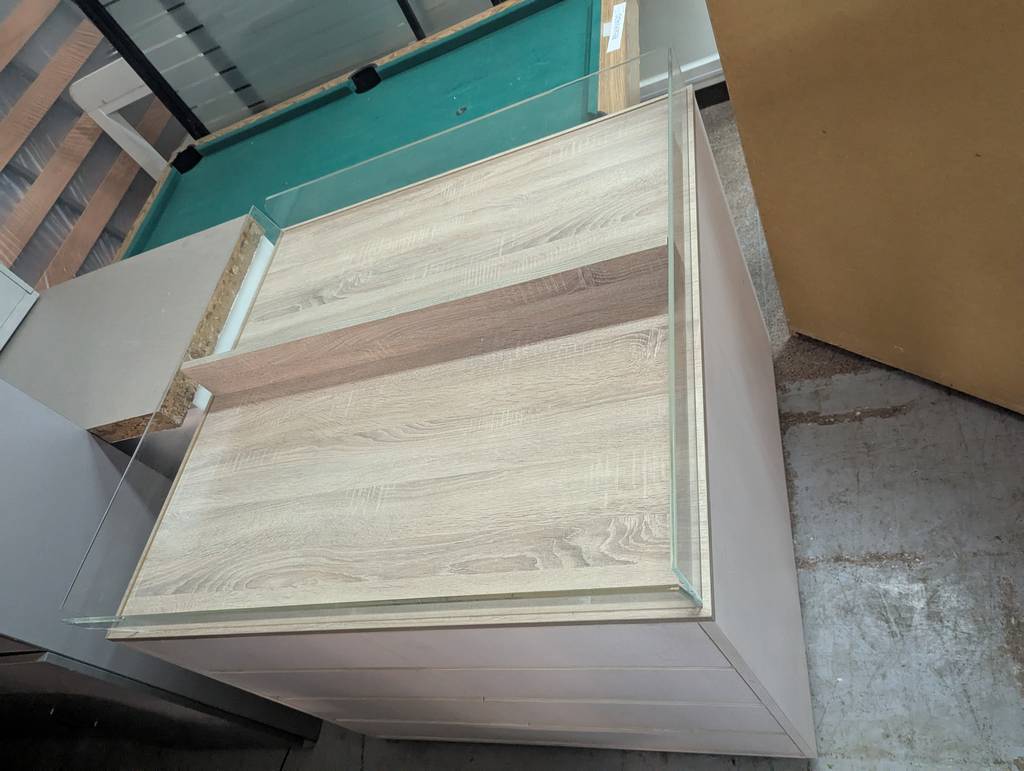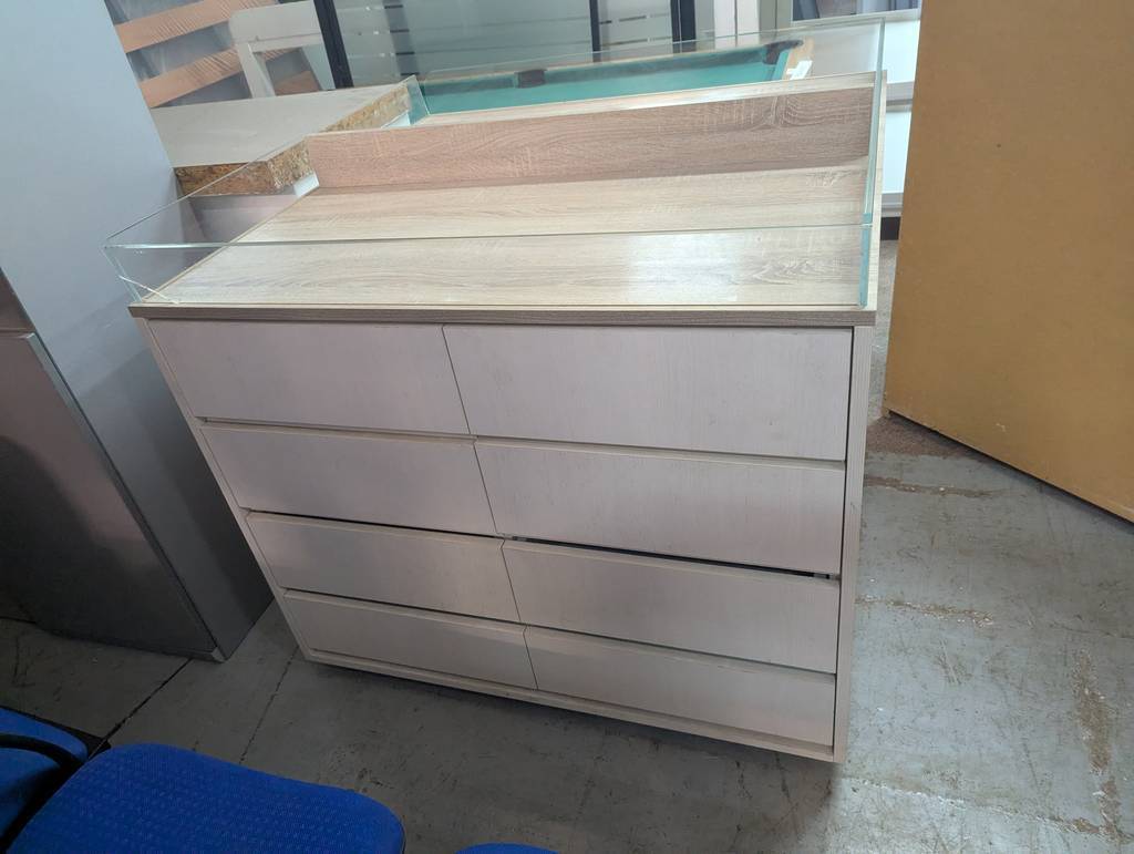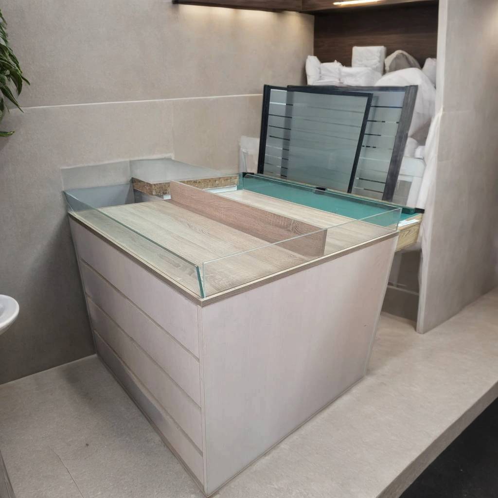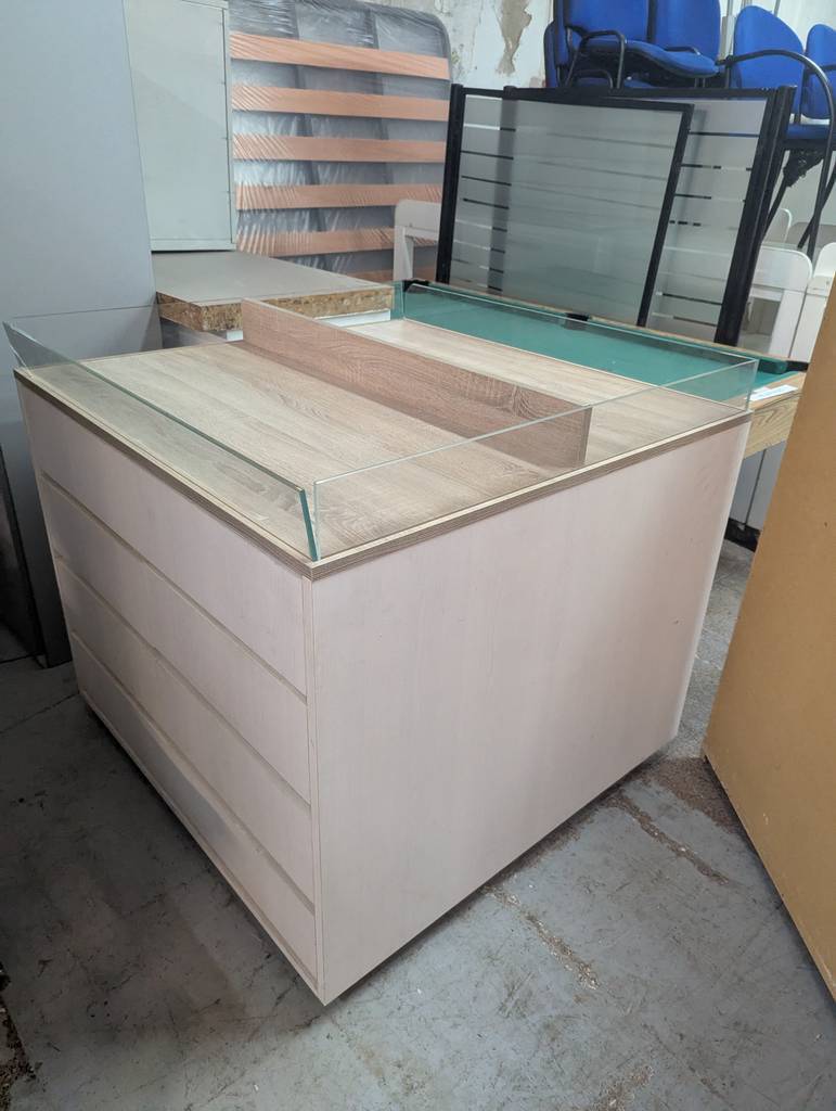 Expositor de comercio de gran tamaño que ha sido fabricado con madera de buena calidad y robusta. Se compone de una parte superior con dos compartimentos separados y rodeados por un cristal y en la frontal ocho cajones para almacenar gran cantidad de material. Es un expositor ideal para colocar en el centro de un comercio. Como podemos observar en las fotografías tiene un desperfecto en el cristal.