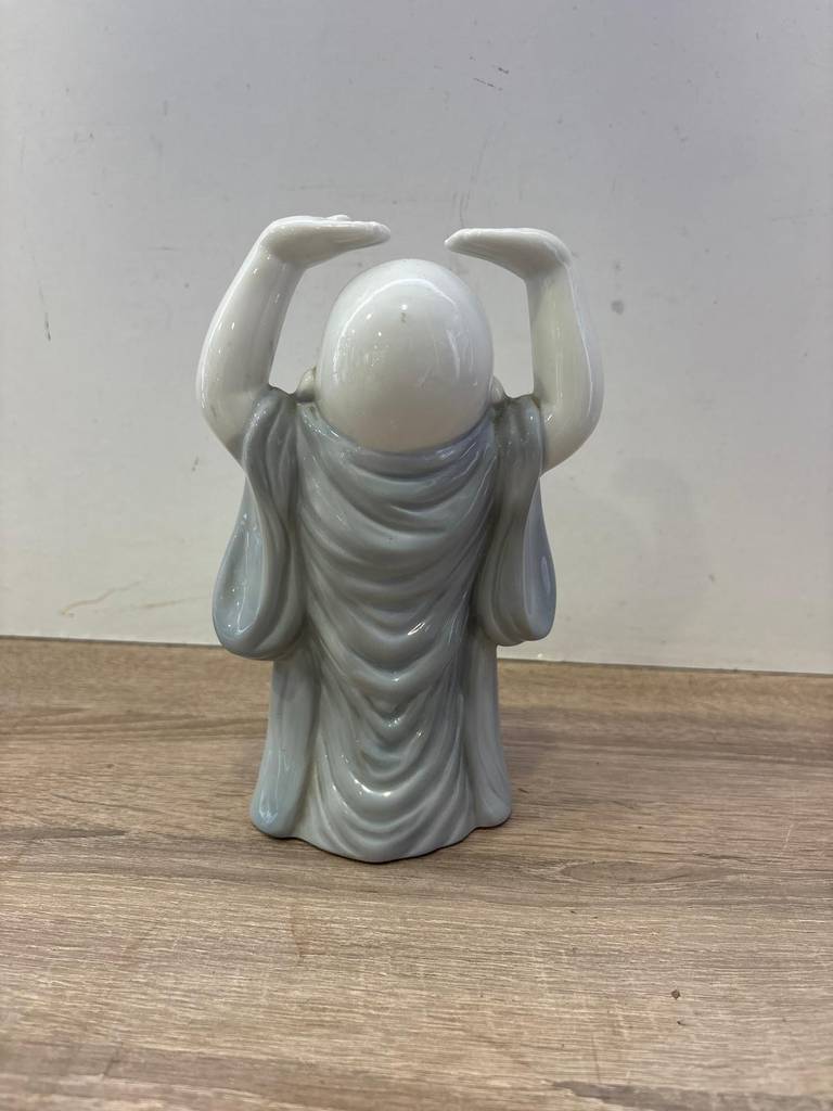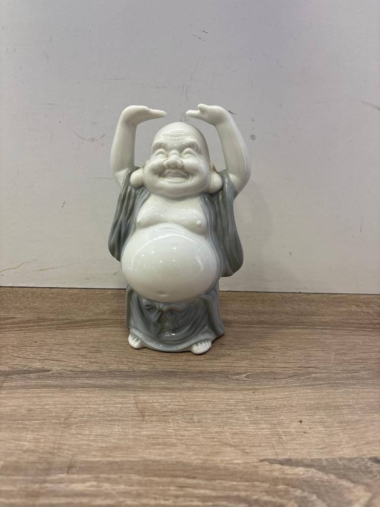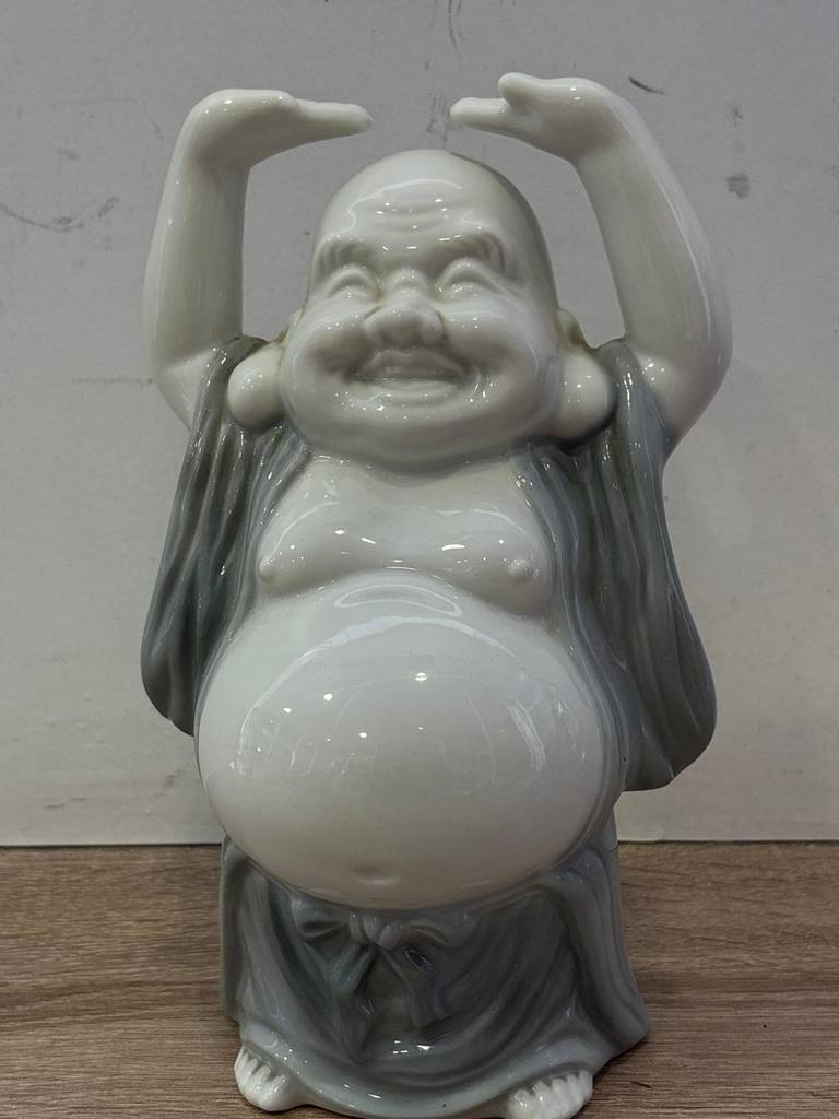 Figura de un buda sonriente y con los brazos en alto muy bonita y original. Ha sido fabricada con porcelana de buena calidad y duradera. Es una pieza decorativa que resaltará en nuestra casa idealmente en un recibidor o en un salón comedor. Como podemos observar en las fotografías se encuentra en buenas condiciones y lista para ser expuesta.
