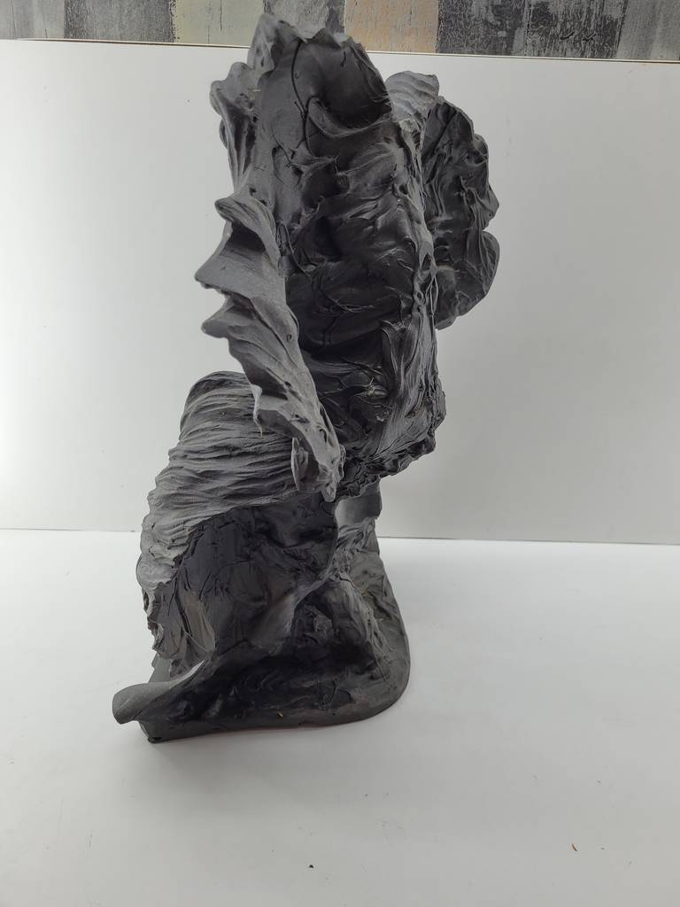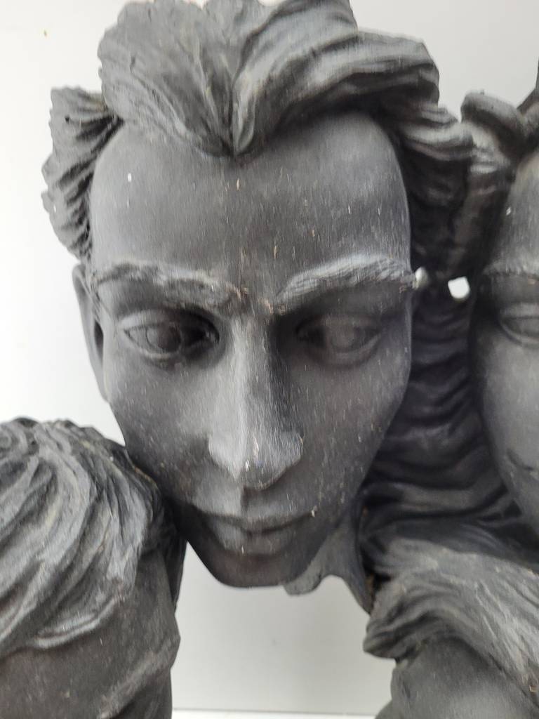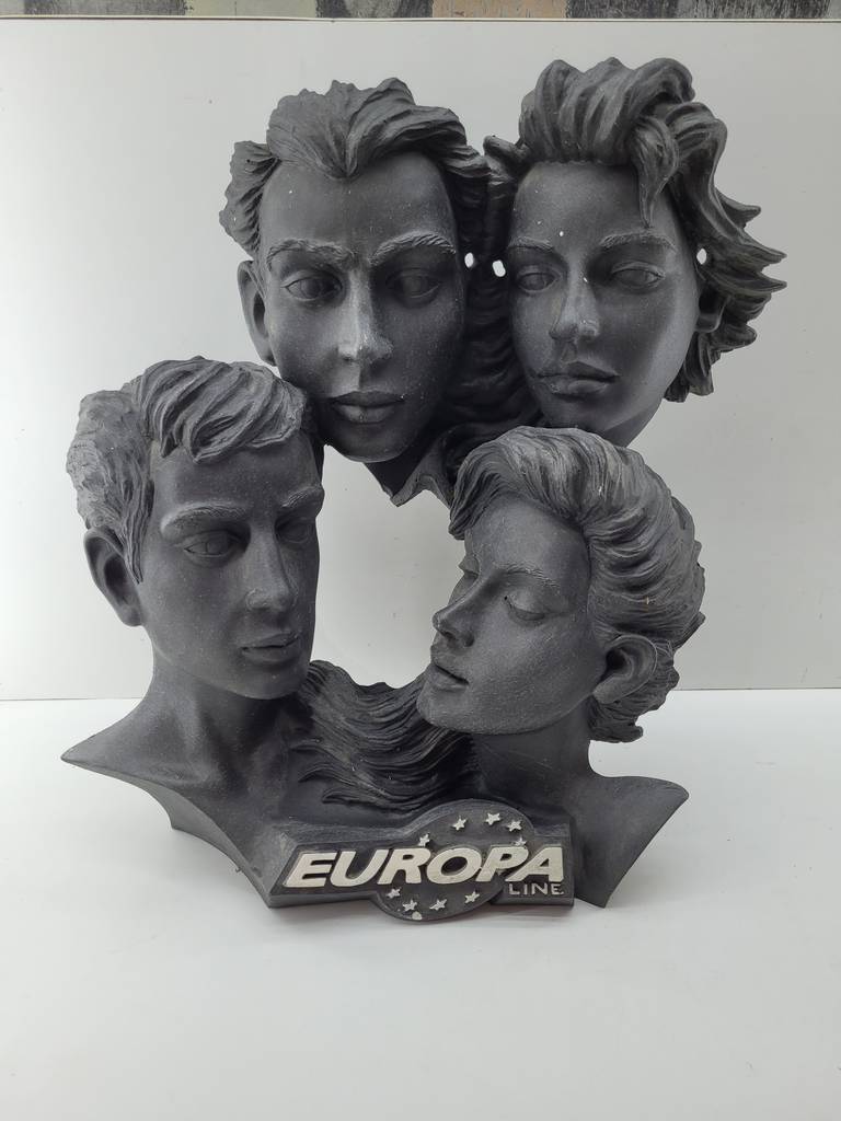 Figura de caras fabricada en metal de buena calidad y resistente de color negro. Se trata de una figura de tamaño mediano que está formada por cuatro caras, dos de hombre y dos de mujer, y lleva una inscripción en la que se puede leer Europa line. Es una figura ideal para colocarla en un salón comedor como elemento decorativo. Como se puede observar en las fotografías se encuentra en buenas condiciones.