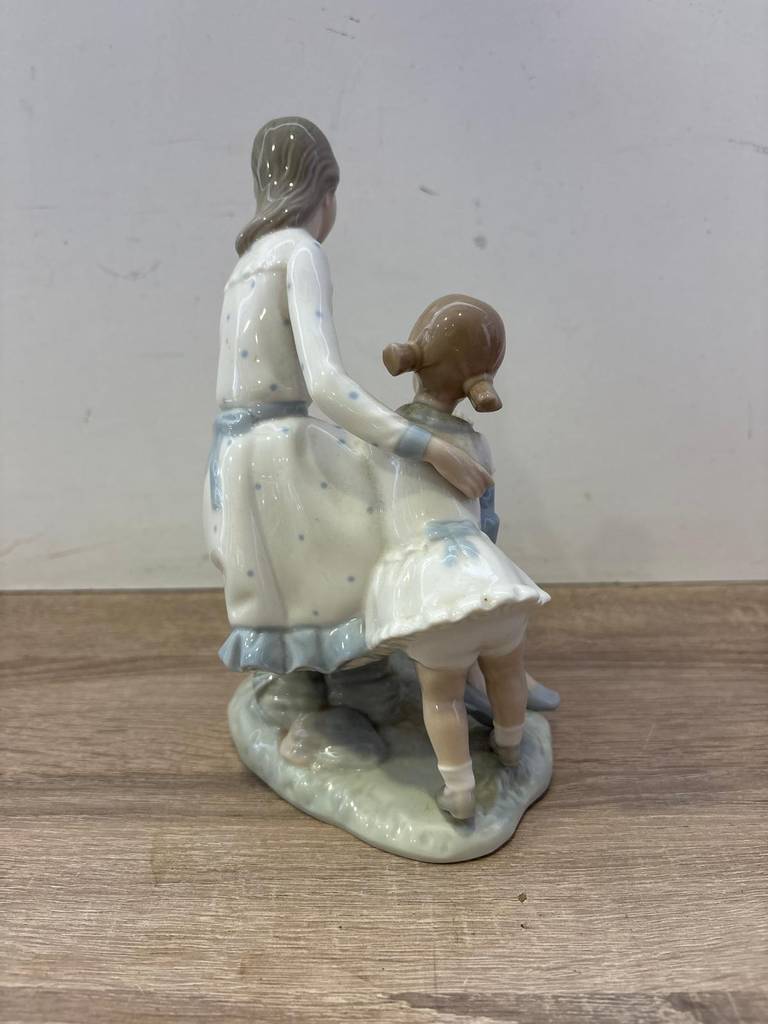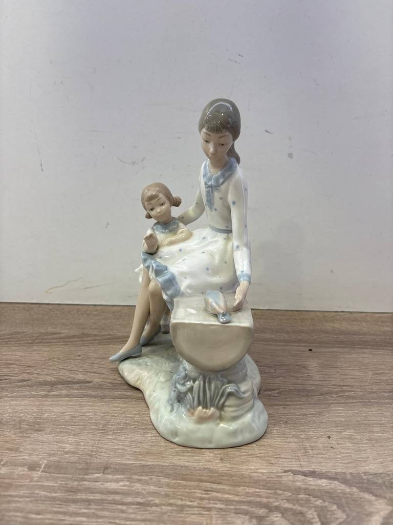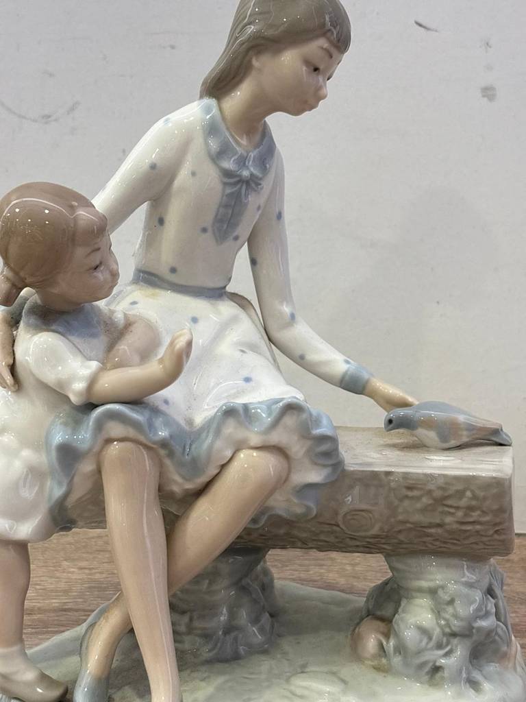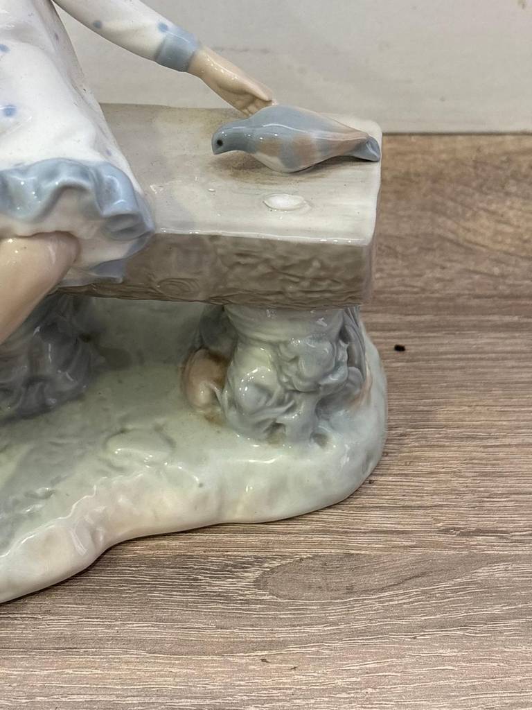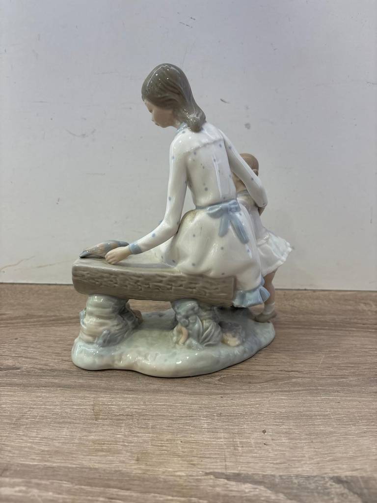 Figura de dos jóvenes, una pequeña y una adolescente en un banco tocando una pequeña paloma. Es una figura muy bonita y original que ha sido fabricada con porcelana de buena calidad y duradera. Es una pieza decorativa que resaltará en nuestra casa idealmente en un recibidor o en un salón comedor. Como podemos observar en las fotografías se encuentra en buenas condiciones y lista para ser expuesta.