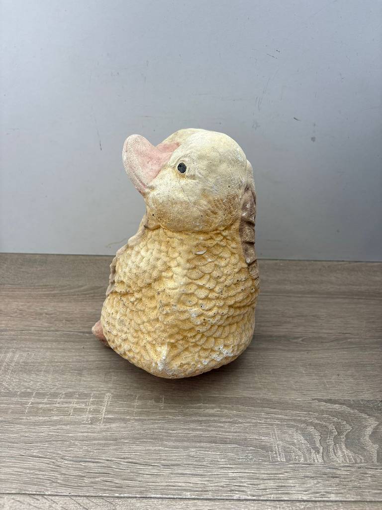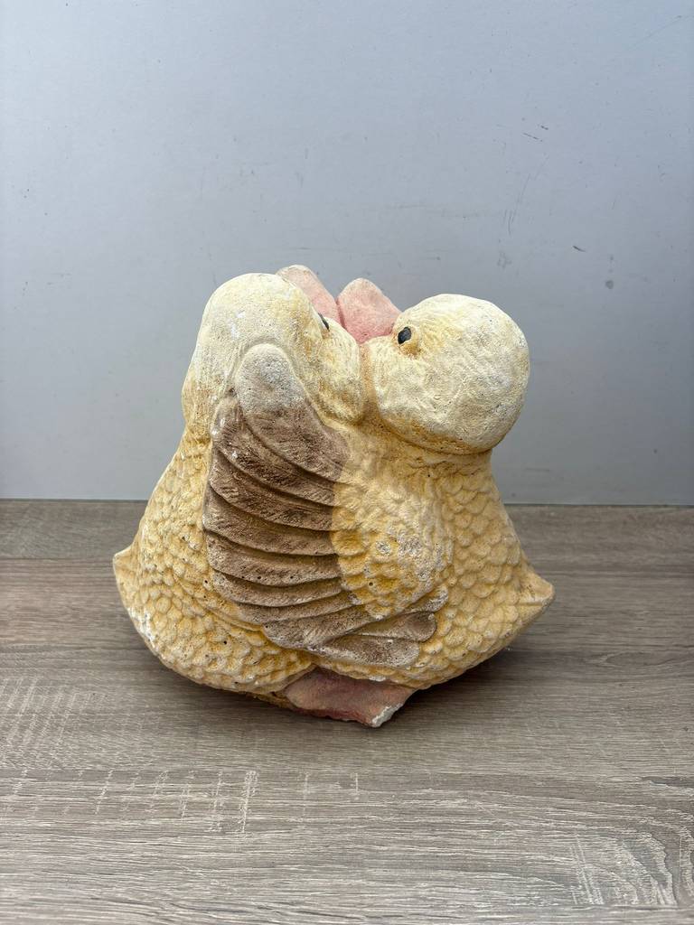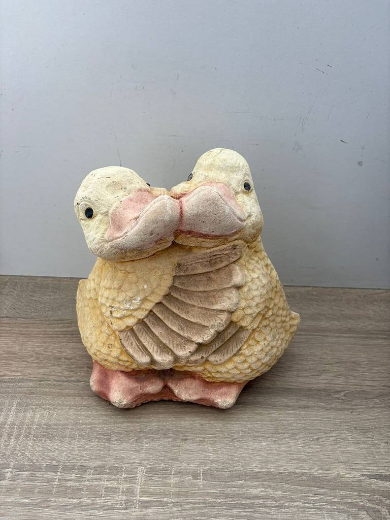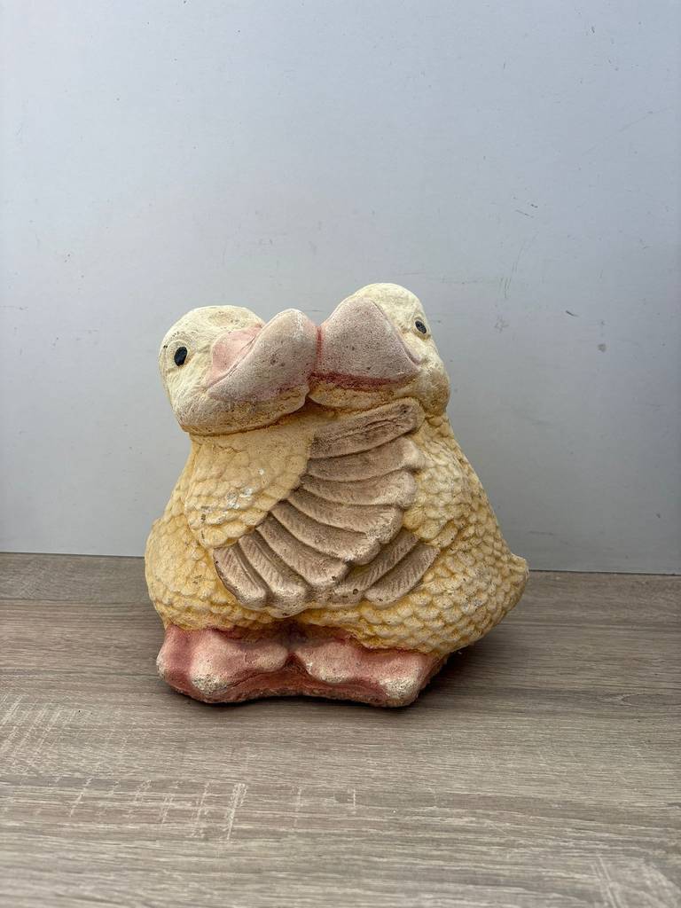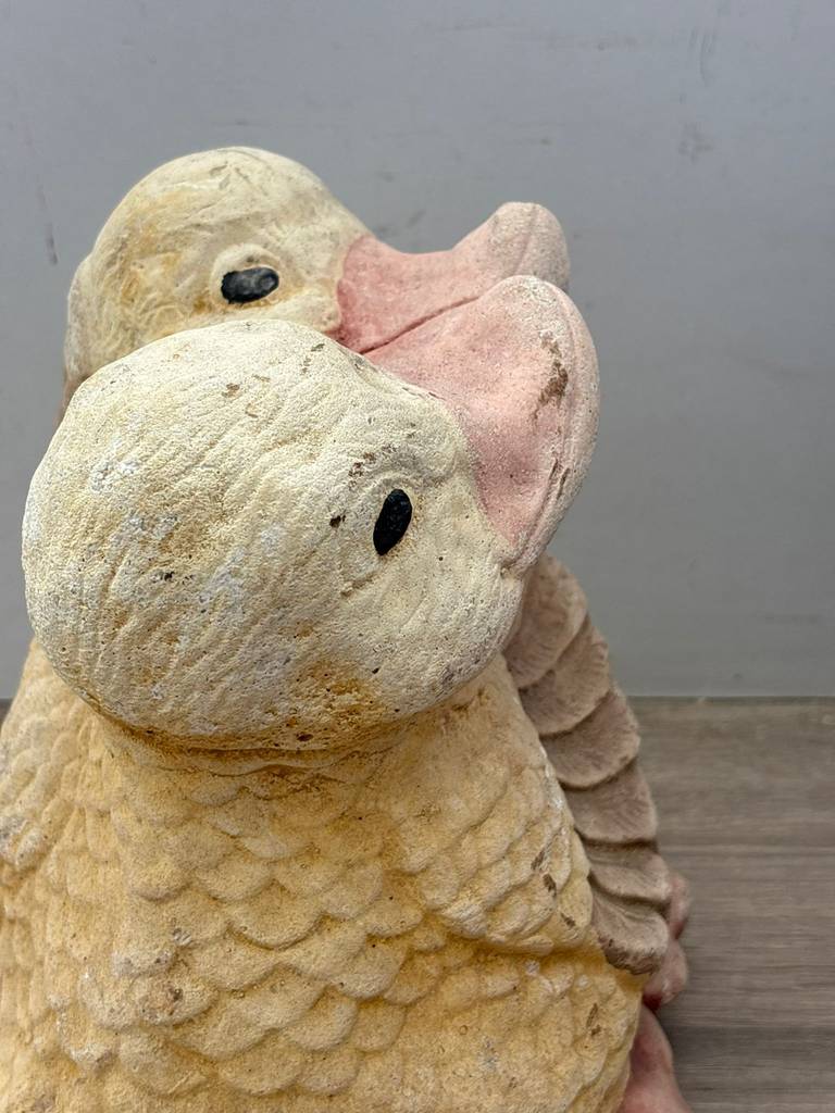 Figura de una pareja de 2 patos amarillos abrazándose con sus alas que ha sido realizada con mucho detalle y precisión. Se trata de una figura realizada en piedra de buena calidad. Es ideal como pieza decorativa expuesta en un jardín principalmente, aunque también puede quedar perfecta en un salón comedor o en un recibidor. Cómo podemos observar en las fotografías la figura presenta ligeros desperfectos.