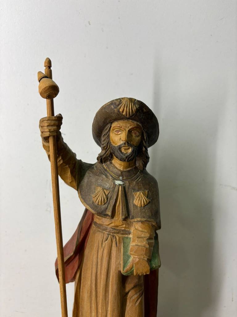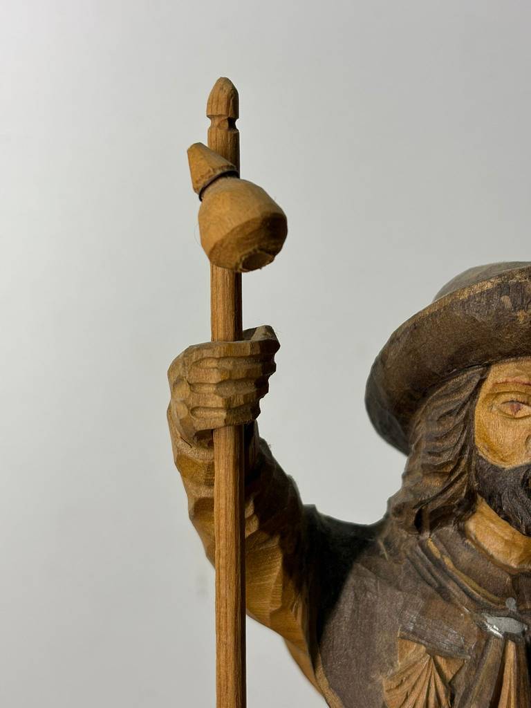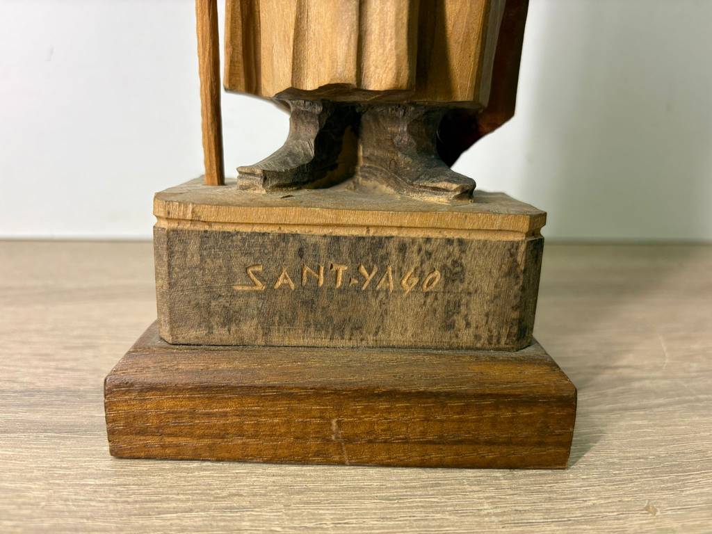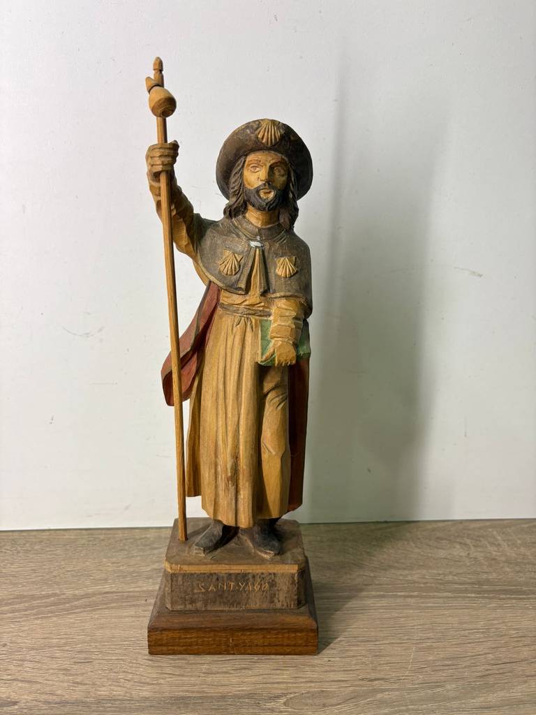 Figura de un peregrino antiguo del Camino de Santiago, con todos los ropajes y su palo, así como un libro en una mano. Ha sido realizada con madera de buena calidad. Es una figura ideal para amantes del camino de Santiago y quedaría ideal en un recibidor o en un salón comedor. Como podemos observar en las fotografías se encuentra en buenas condiciones.