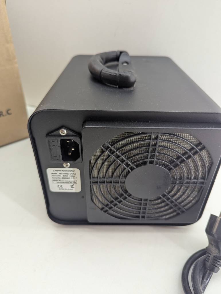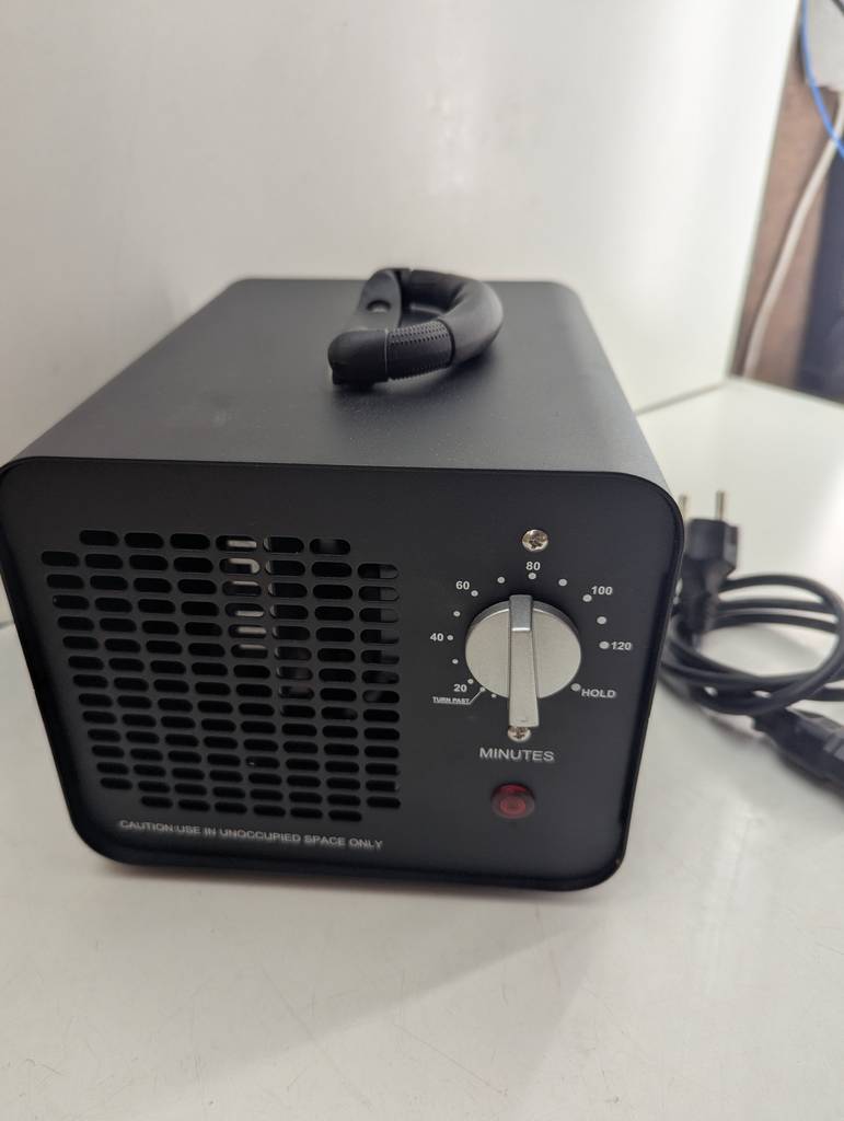 Generador de ozono de la marca Ozonovid de color negro. Se trata de un generador de ozono que viene en su caja original y cuenta con un enchufe para poder conectarlo a la corriente y tiene un interruptor para programar los minutos que queramos dejarlo encendido. Como se puede observar en las fotografías se encuentra en buenas condiciones y funciona correctamente.