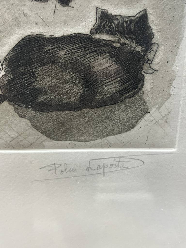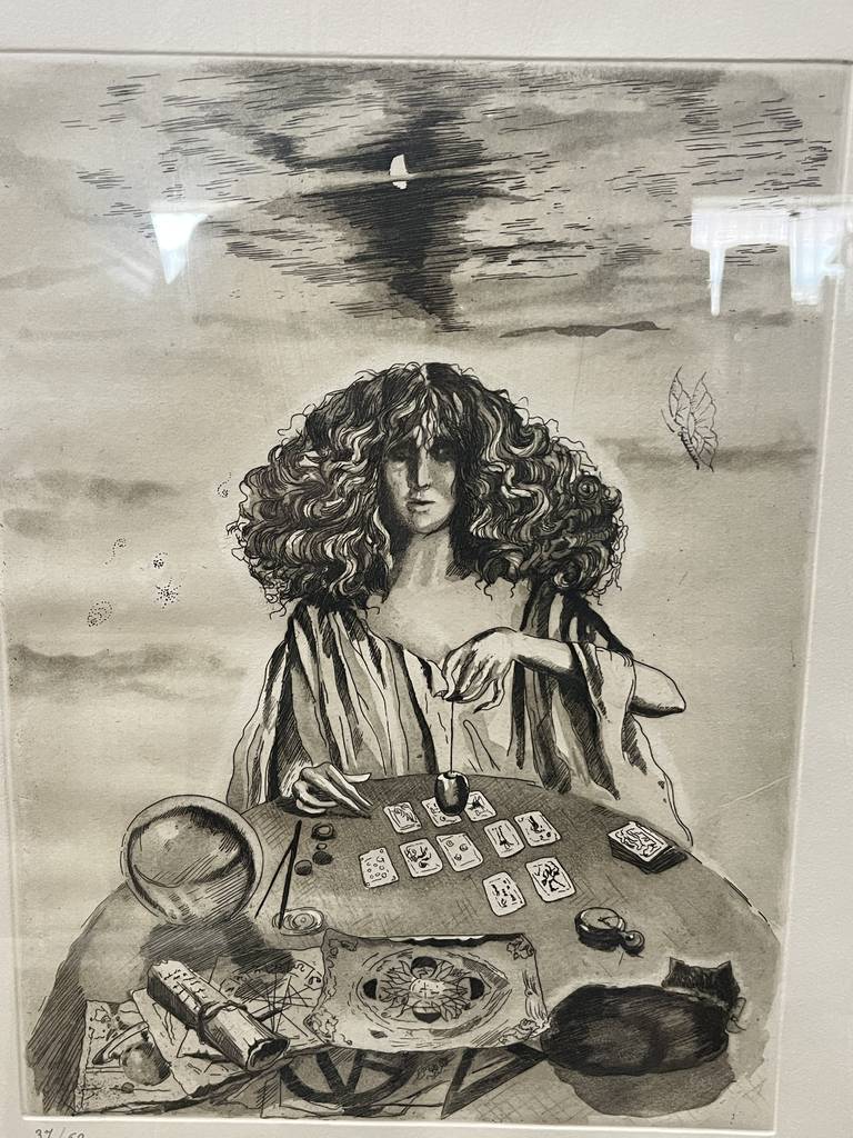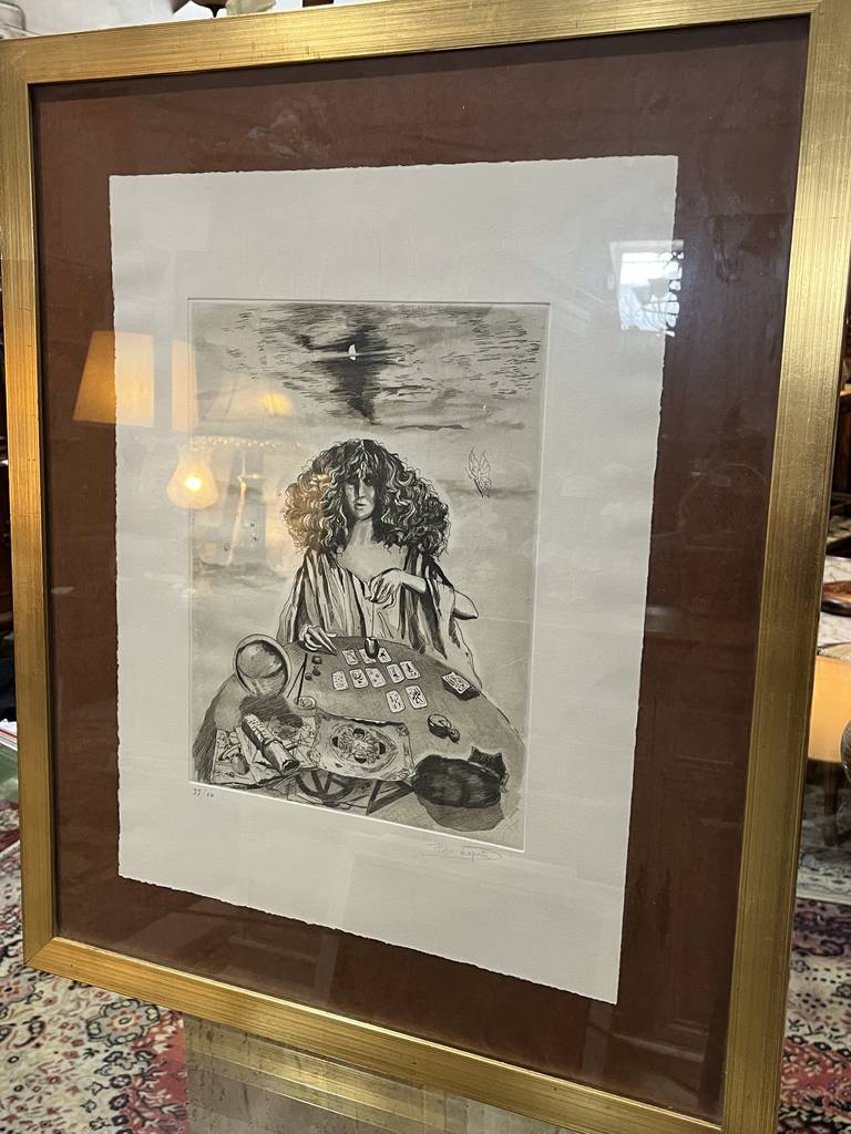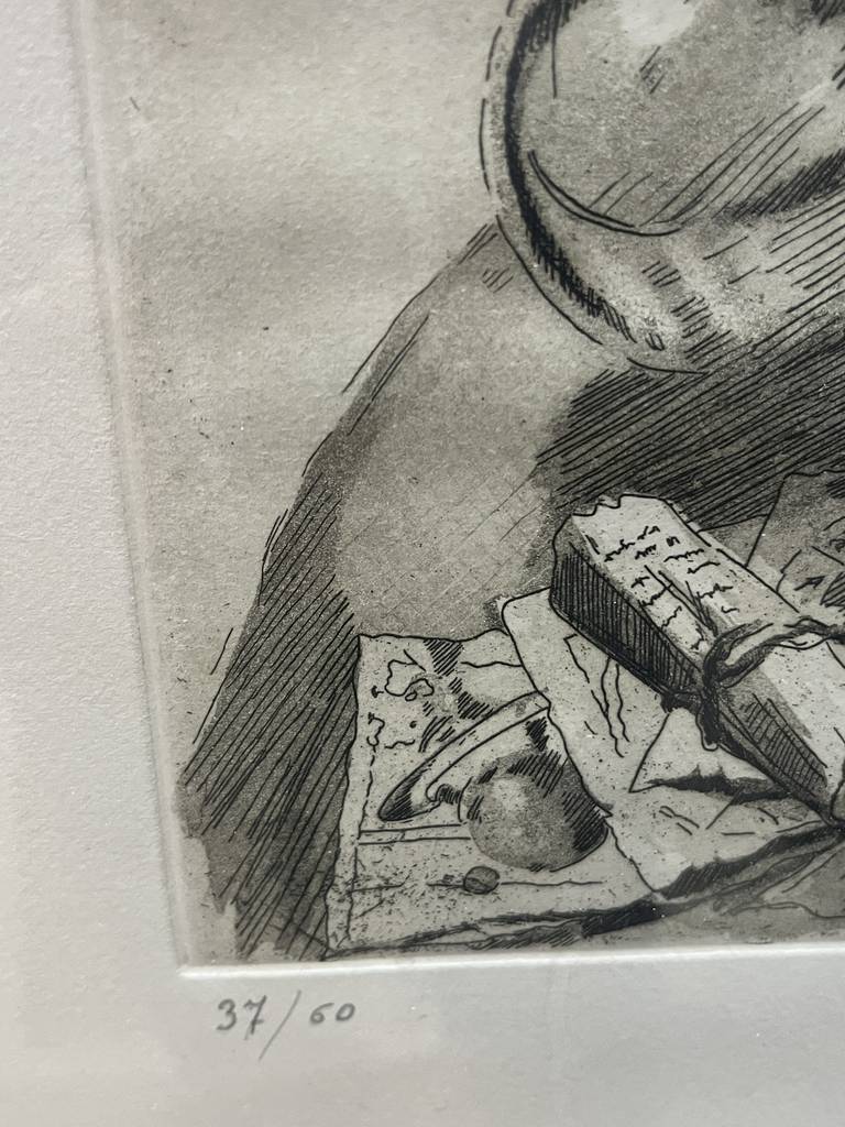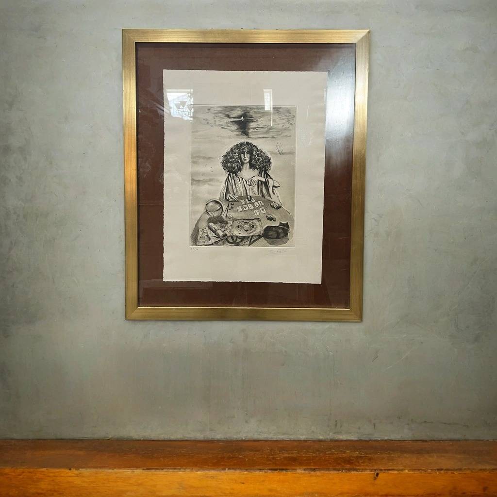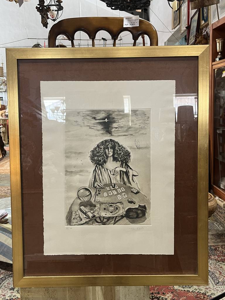 Grabado del autor Polin Laporta, se trata del número 37 de 60. en el que podemos observar a una bruja o maga con sus abalorios sobre una mesa. Es un grabado que ha sido conservado en un marco con cristal protector frontal, listo para ser expuesto. Es una pieza original ideal para coleccionistas o amantes del arte. Como podemos observar en las fotografías se encuentra en buenas condiciones. Aprovecha esta oportunidad de llevarte un producto exclusivo a un módico precio.