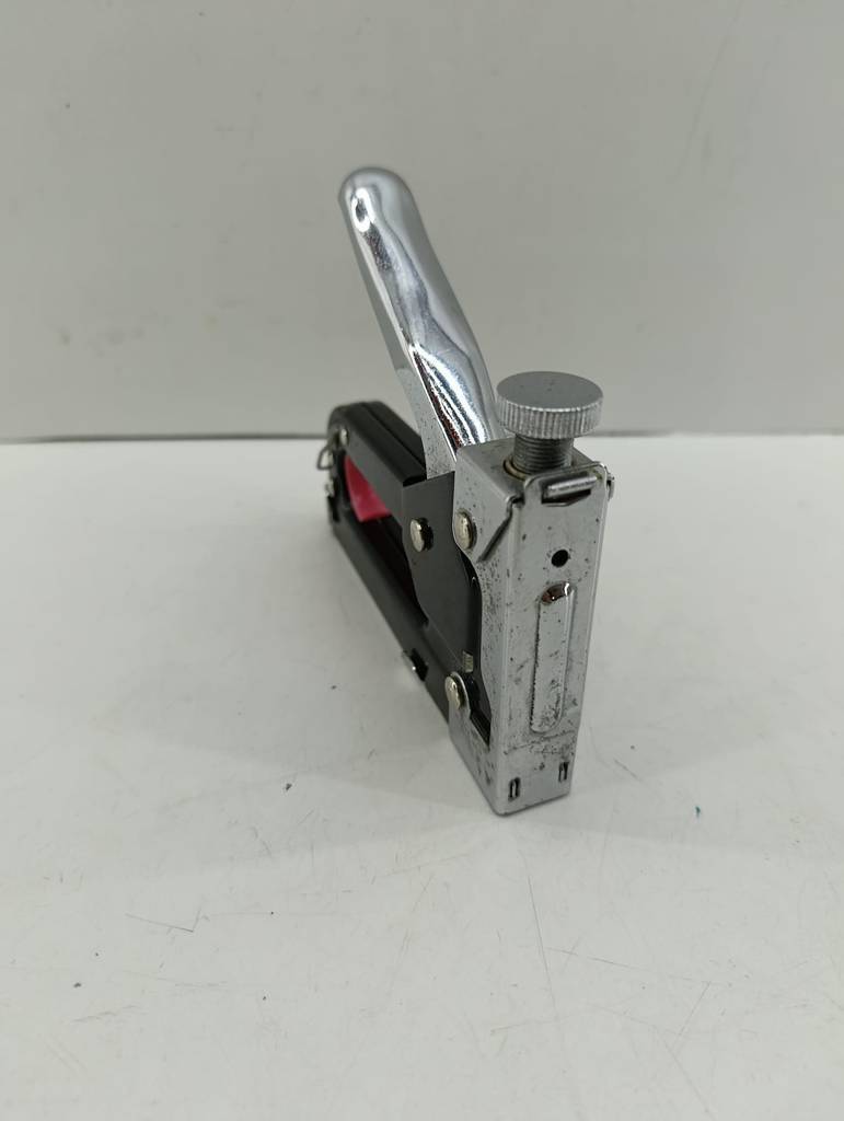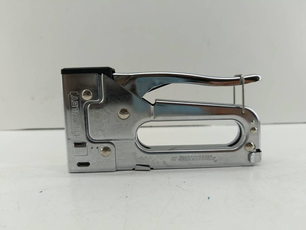 Grapadora manual Stanley modelo tr45 fabricada en metal de buena calidad y resistente de color plateado y negro. Se trata de una grapadora manual que cuenta con un agarre perfecto para cogerlo y apretar para poder grapar cualquier cosa. Es una grapadora muy práctica y útil para tenerla en el hogar. Como se puede observar en las fotografías se encuentra en buenas condiciones.