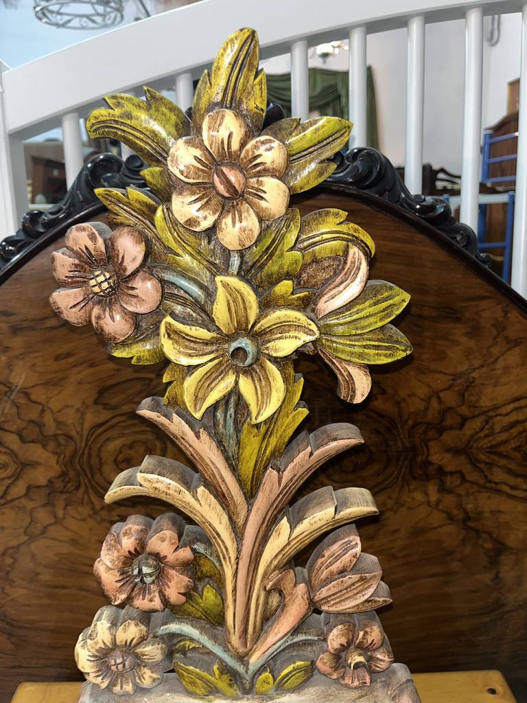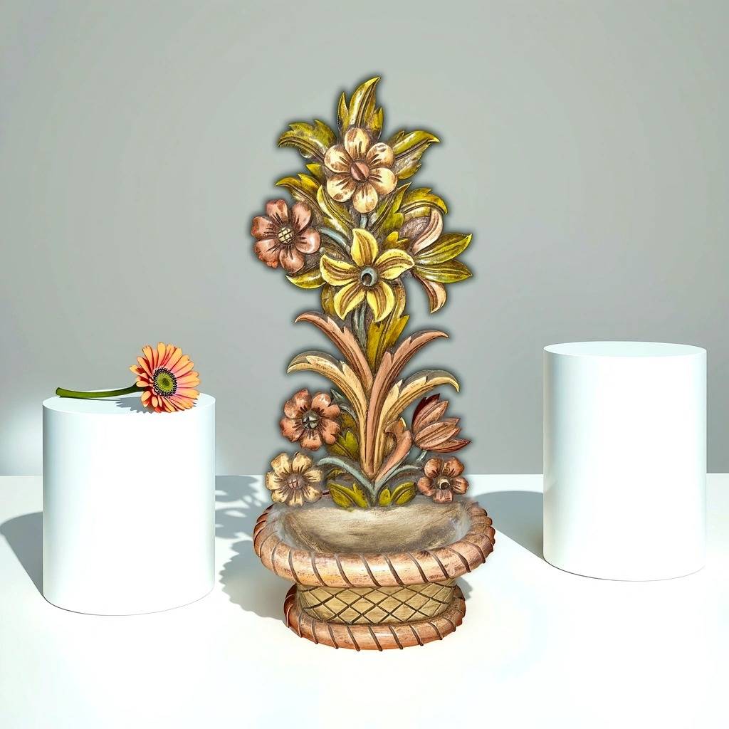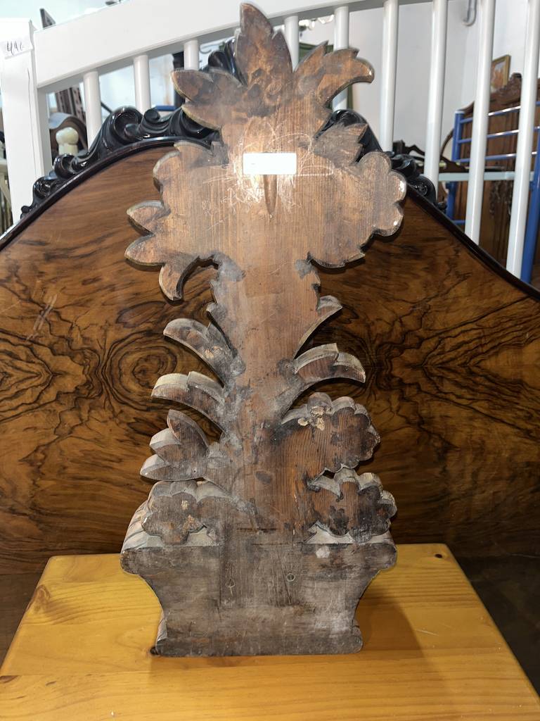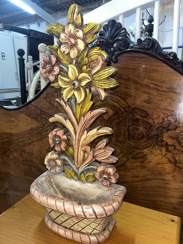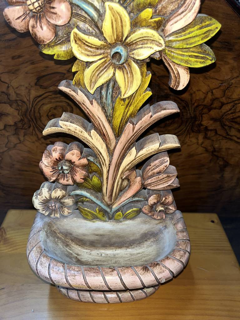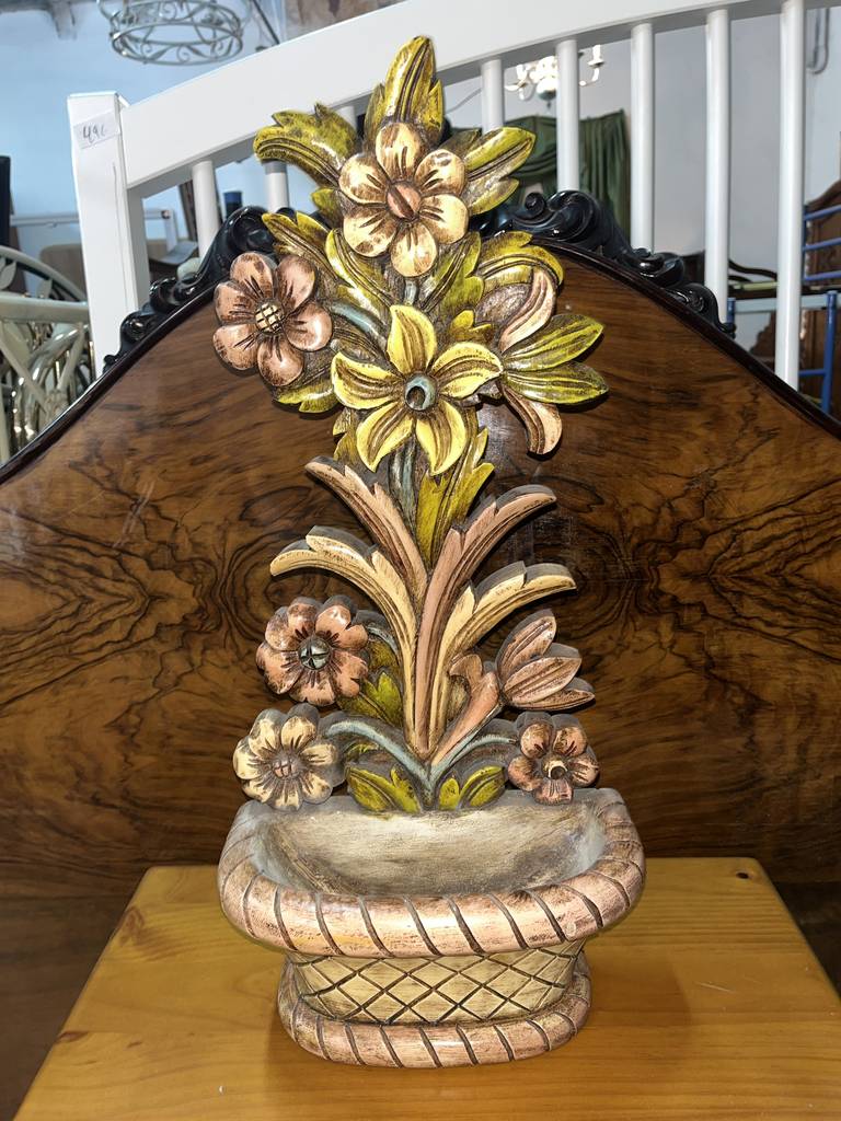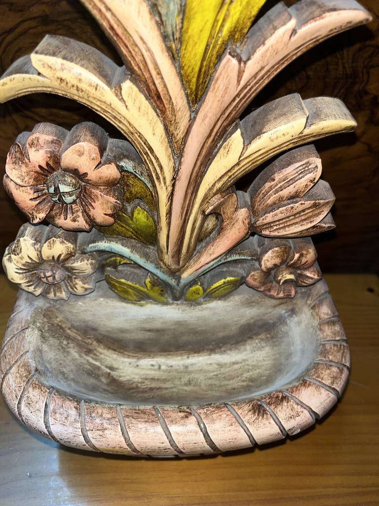 Jardinera en forma de mural muy bonita y original con un macetero a modo de cuenco para depositar llaves, dulces o aperitivos. Ha sido fabricada en madera y tallada con mucha precisión y detalle. Es una pieza decorativa ideal para decorar y exponer en un salón comedor o en un recibidor, por ejemplo. Como podemos observar en las fotografías se encuentra en buenas condiciones.