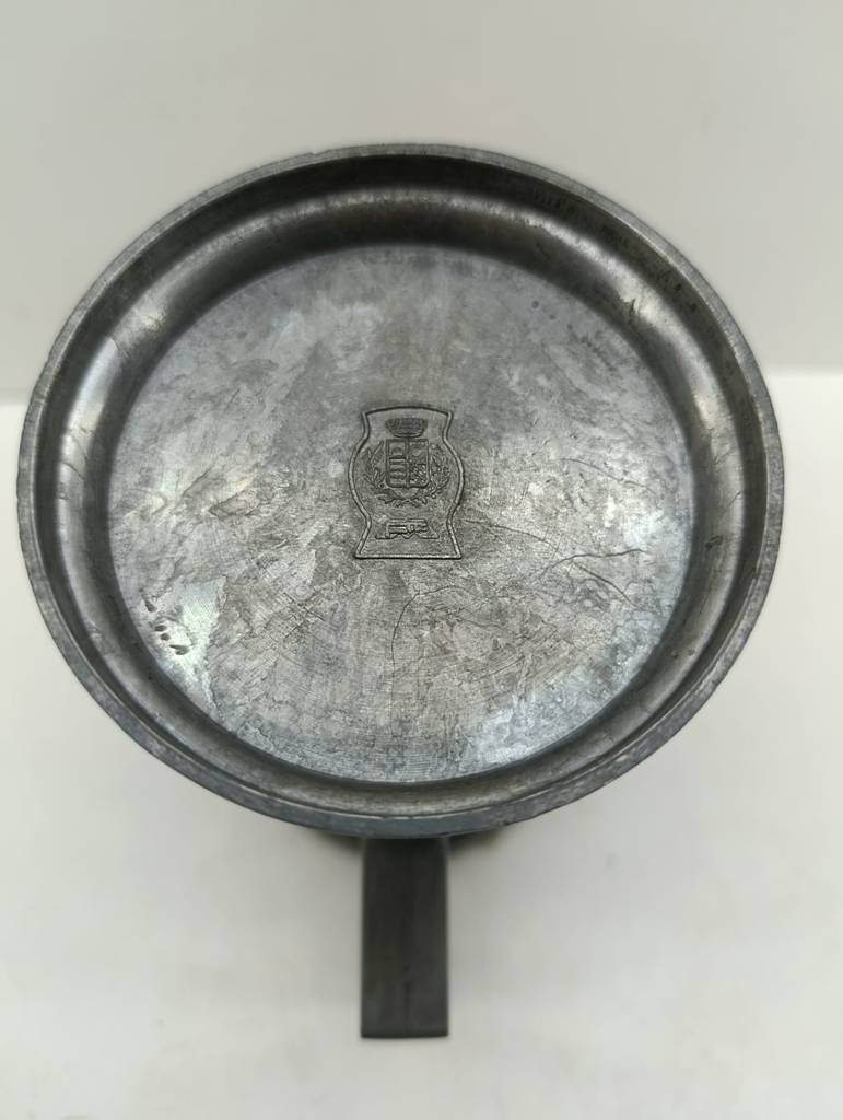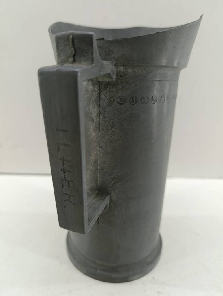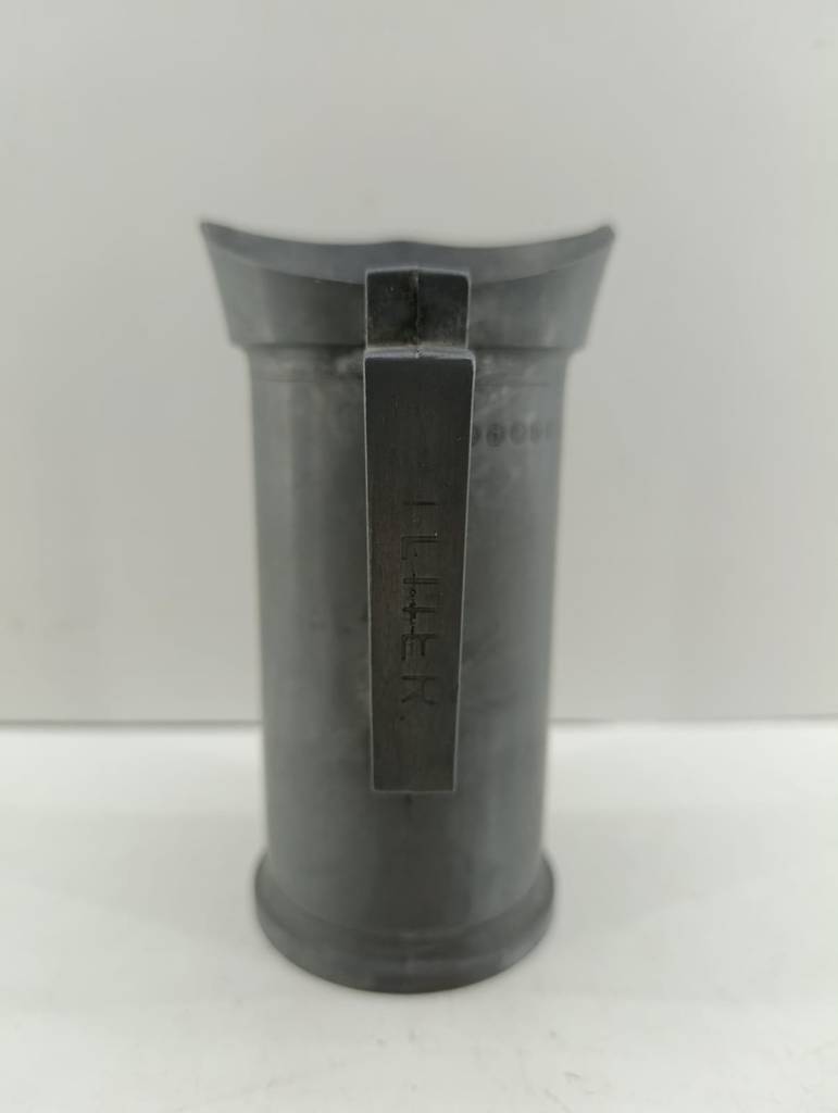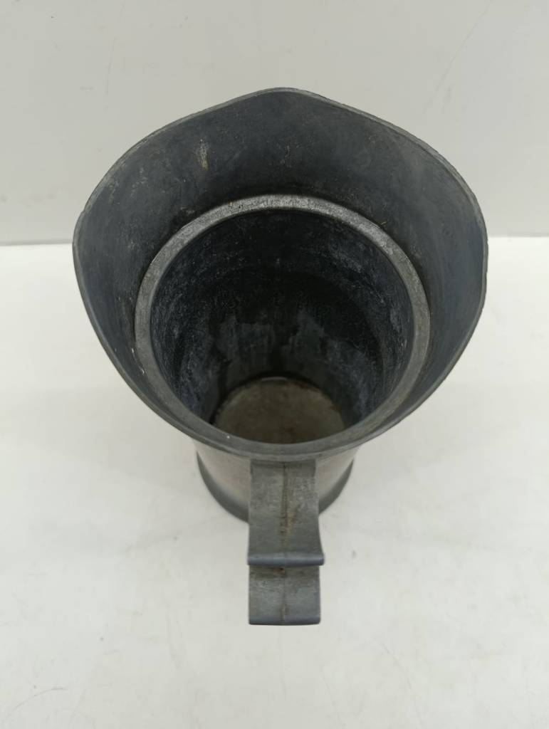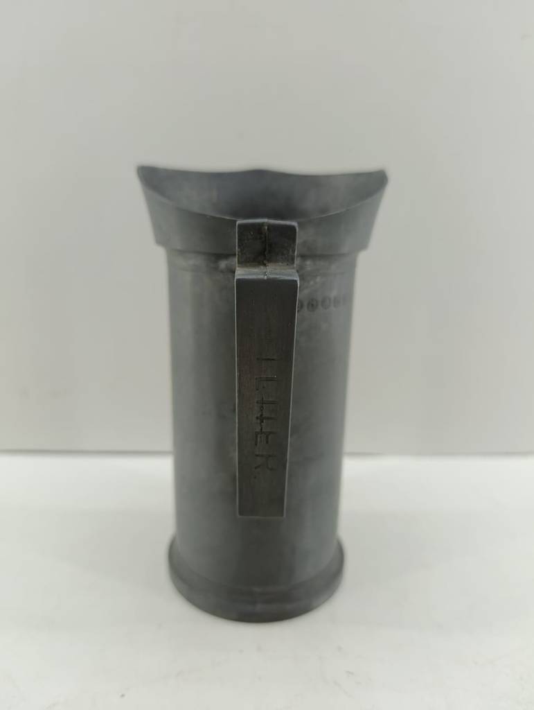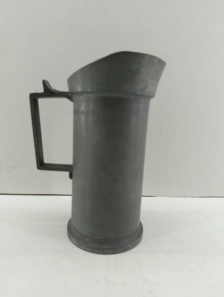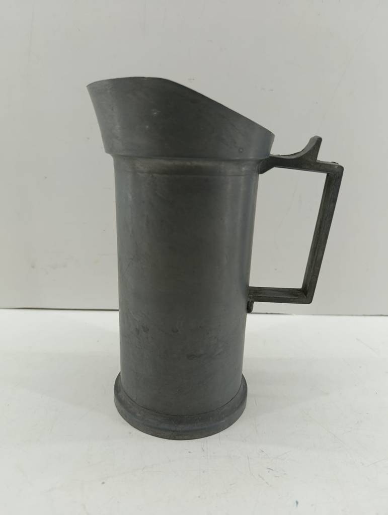 Jarra medidora de estilo antiguo y clásico fabricada en peltre y estaño. Se trata de una jarra medidora de tamaño mediano que cuenta con un asa con forma rectangular y tiene una abertura en la parte superior para poder llenarla de agua o de cualquier otro líquido. Es una jarra ideal para tenerla en la cocina de un hogar. Como se puede observar en las fotografías se encuentra en buenas condiciones.